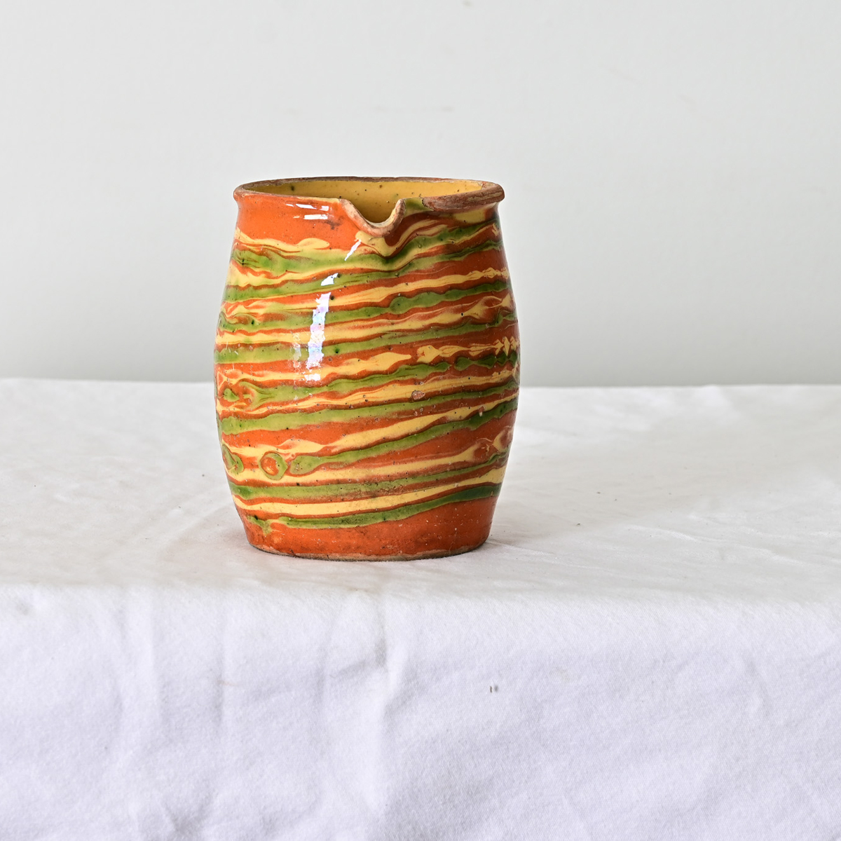 This 19th century jaspé ware French pitcher from the region of Savoie makes an exciting vase or stand alone decor item for the psychedelic swirls in autumnal colors wrapping the cylindrical form. A great patina from a century of use gives it a true antique quality to add artistic intrigue to any kitchen or shelf display. Please view the detailed images for the current condition.