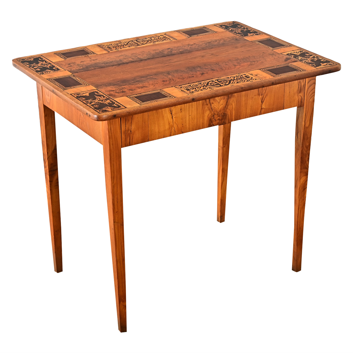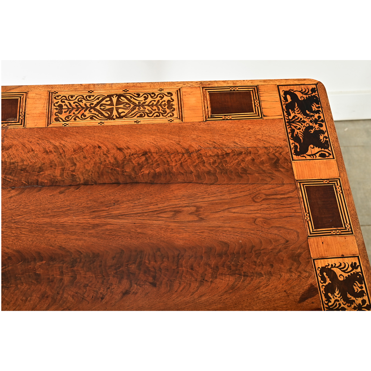 This captivating French desk from the 19th century is illustrated with a border of highly detailed marquetry of contrasting mahogany to stand out from the walnut & fruitwood construction. Each inlaid panel alternates between geometric, heraldic (Flemish Lion), or foliate themes using a coded visual language alluding to the historical and cultural context when it was produced. The apron contains a hidden pen drawer free of hardware, the interior splashed with teal ink. Four square, tapering legs support the whole. Cleaned and polished with a French paste wax, ready for your interior. Please view the detailed images to see more of this unique writing table.