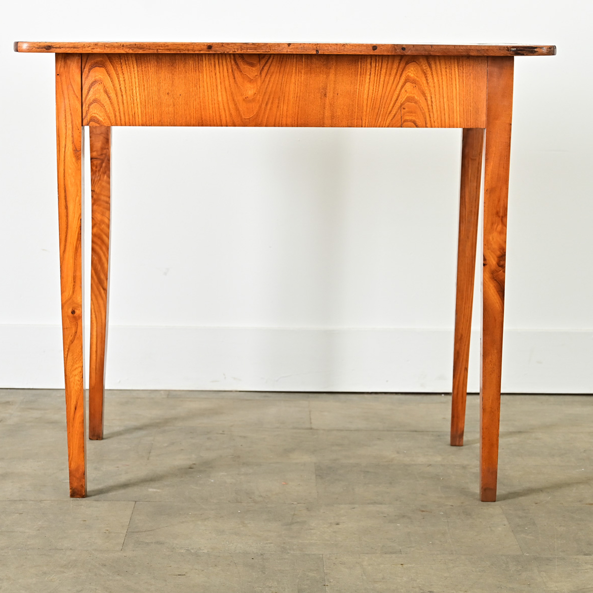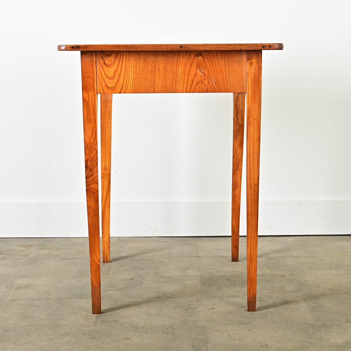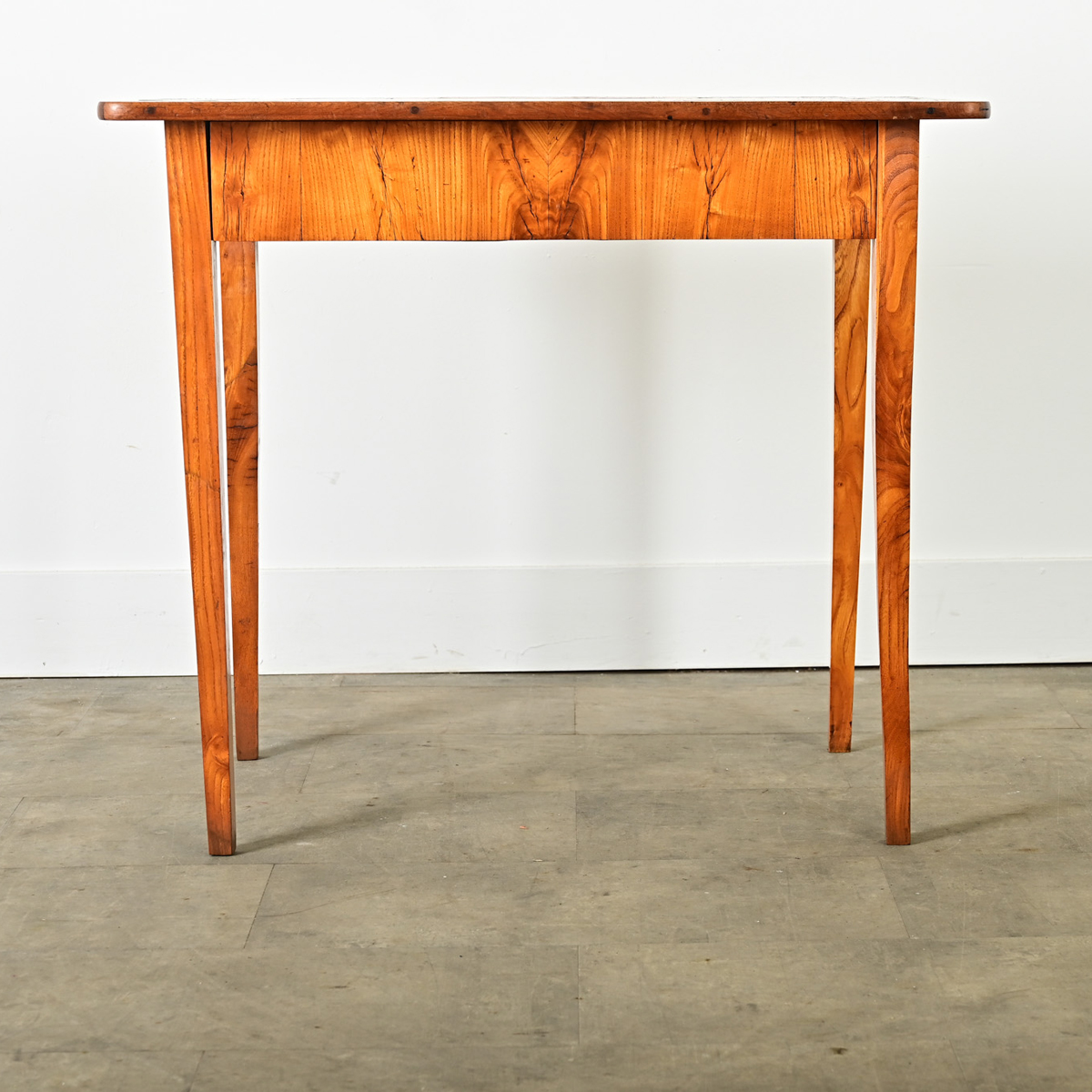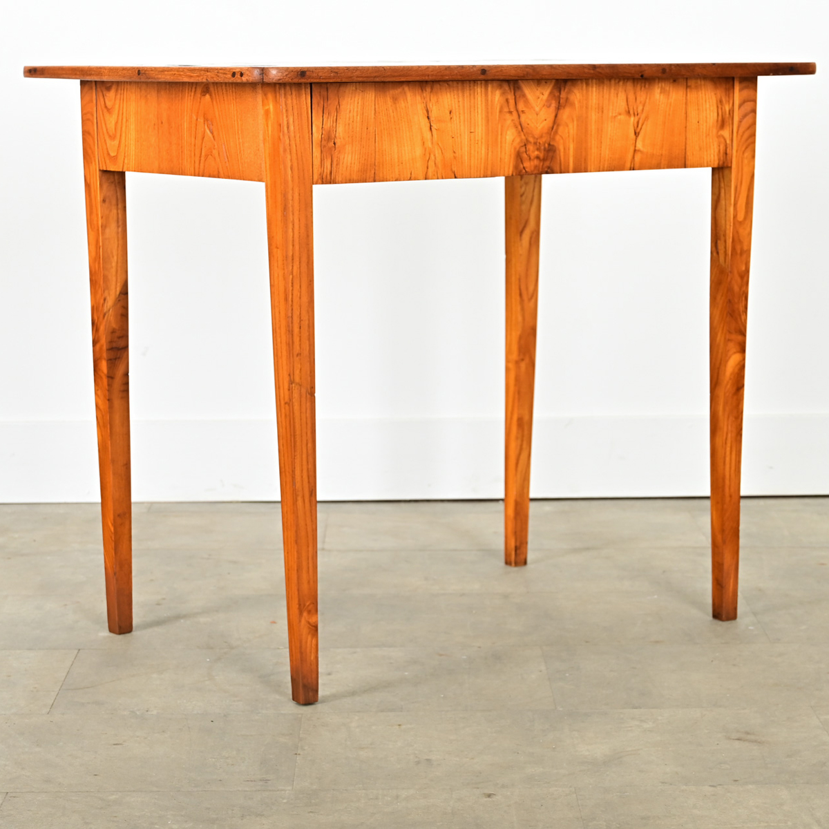 Petite, French occasional table or desk from circa 1840, of solid walnut. The style is refined and restrained: nearly two centuries of use have left the expected patina on the top surface, which is punctuated by an inlaid square patch from an old repair. In the apron is a small drawer, opened by an angular brass drop pull, echoing the geometric cuts along the bottom edge of each side of the apron. Four squared and tapered legs are carved in a fluted pattern, referencing Neoclassical and Louis XVI themes. Cleaned and polished with a French paste wax this unique table is ready for your interior. Please view the detailed images.