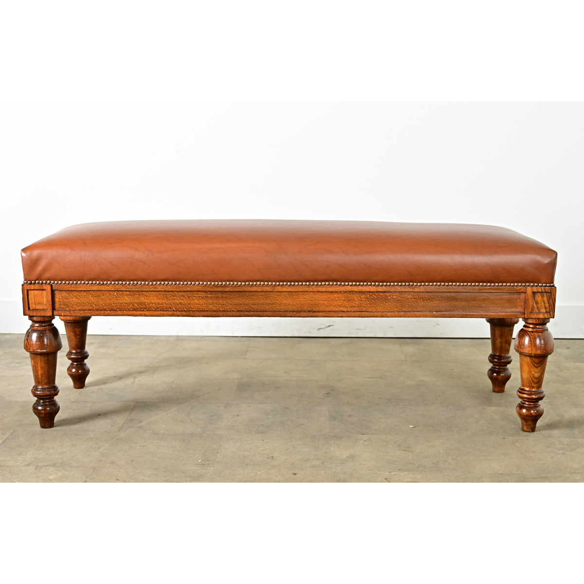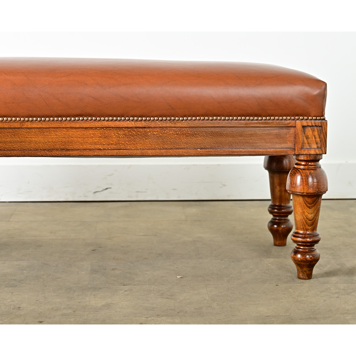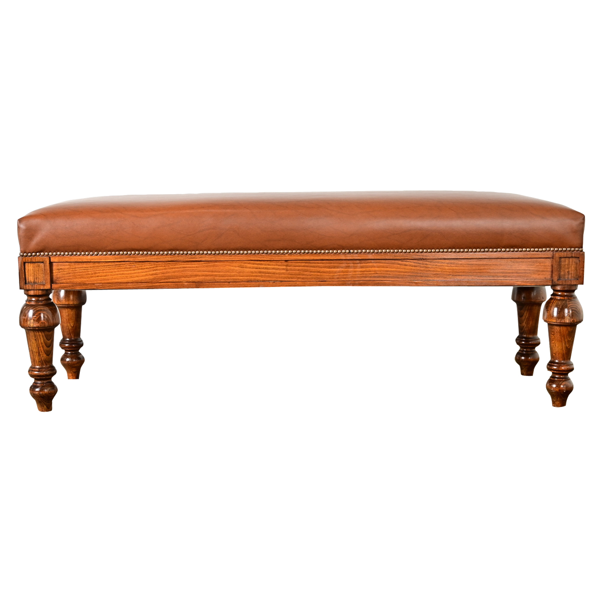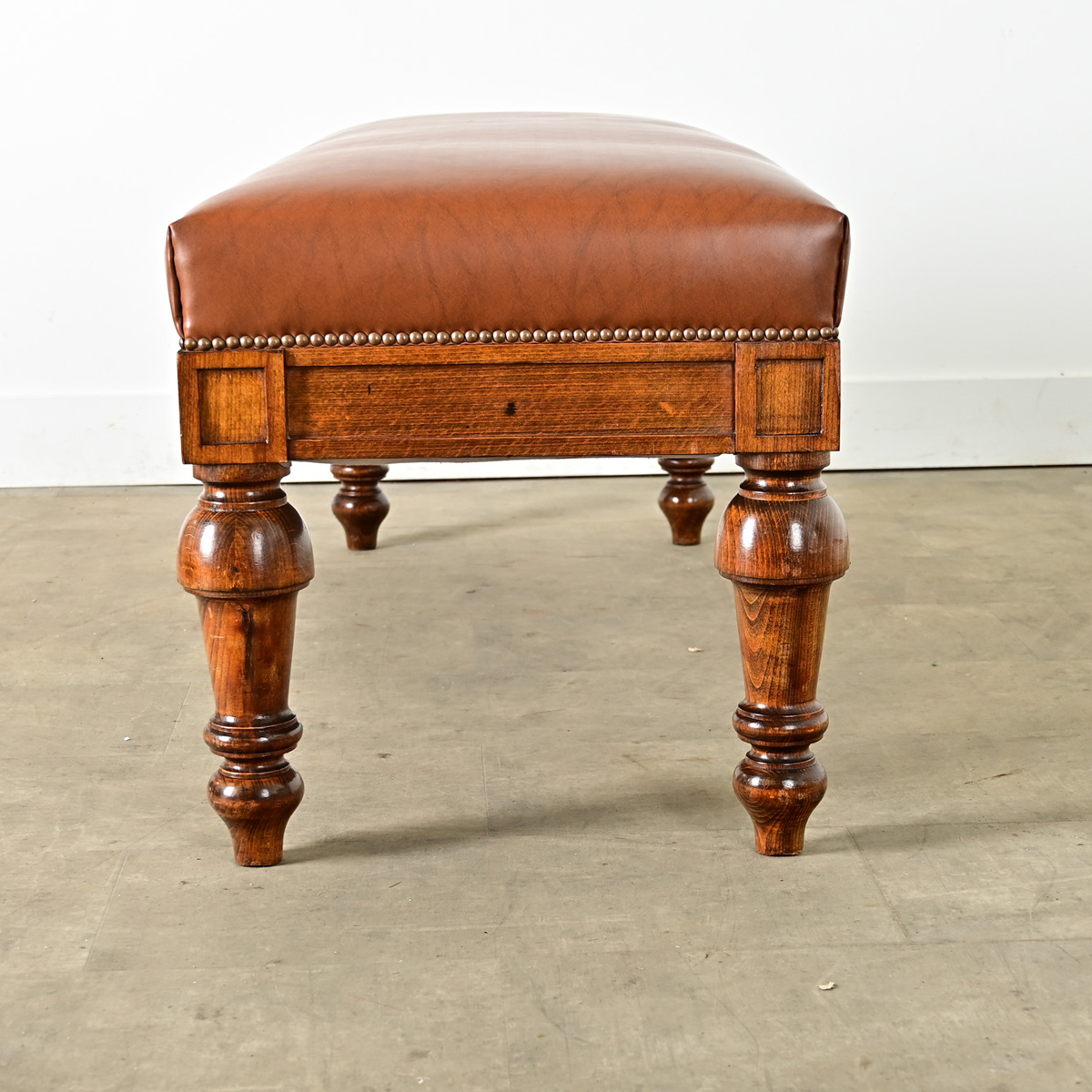 A French oak rectangular bench from the late 19th century with turned legs and more recent upholstery of practical, faux leather. The robust proportions of this multipurpose seat uses the timeless charm of oak and the technical sophistication of turned legs (without the need for stretchers) to keep the design elevated and refined to suit a number of interior decorating tastes. The dedication to craftsmanship becomes a tactile and visual experience as one observes the geometry of the legs, delighting with each curve as the French furniture tradition is known for. Upholstery in a caramel-hue faux leather accented by a nailhead trim is cohesive with the style, offering the peace of mind and easy maintenance to enjoy this bench in nearly any scenario: hallways, living rooms, offices, or bedrooms. Cleaned, tightened, and polished with a French paste wax this substantial bench is ready to join your interior. Please view the detailed images to see the current condition.