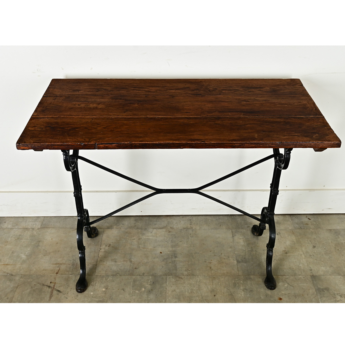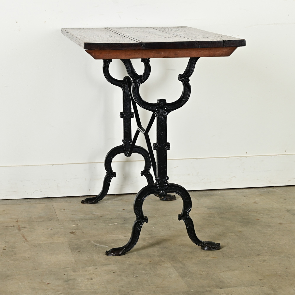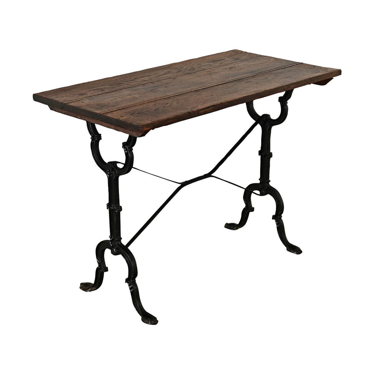 An exceptional 19th century French bistro table with personality and stylized details in the cast iron base. The dark oak planks have a well-patinated surface–consistent with age and type of use–that makes an inviting backdrop for casual dining. A lovely addition to a kitchen or breakfast nook, recreating that Parisian-chic bistro style at home. Cleaned and polished with a French paste wax, ready for your interior. Please view the detailed images.