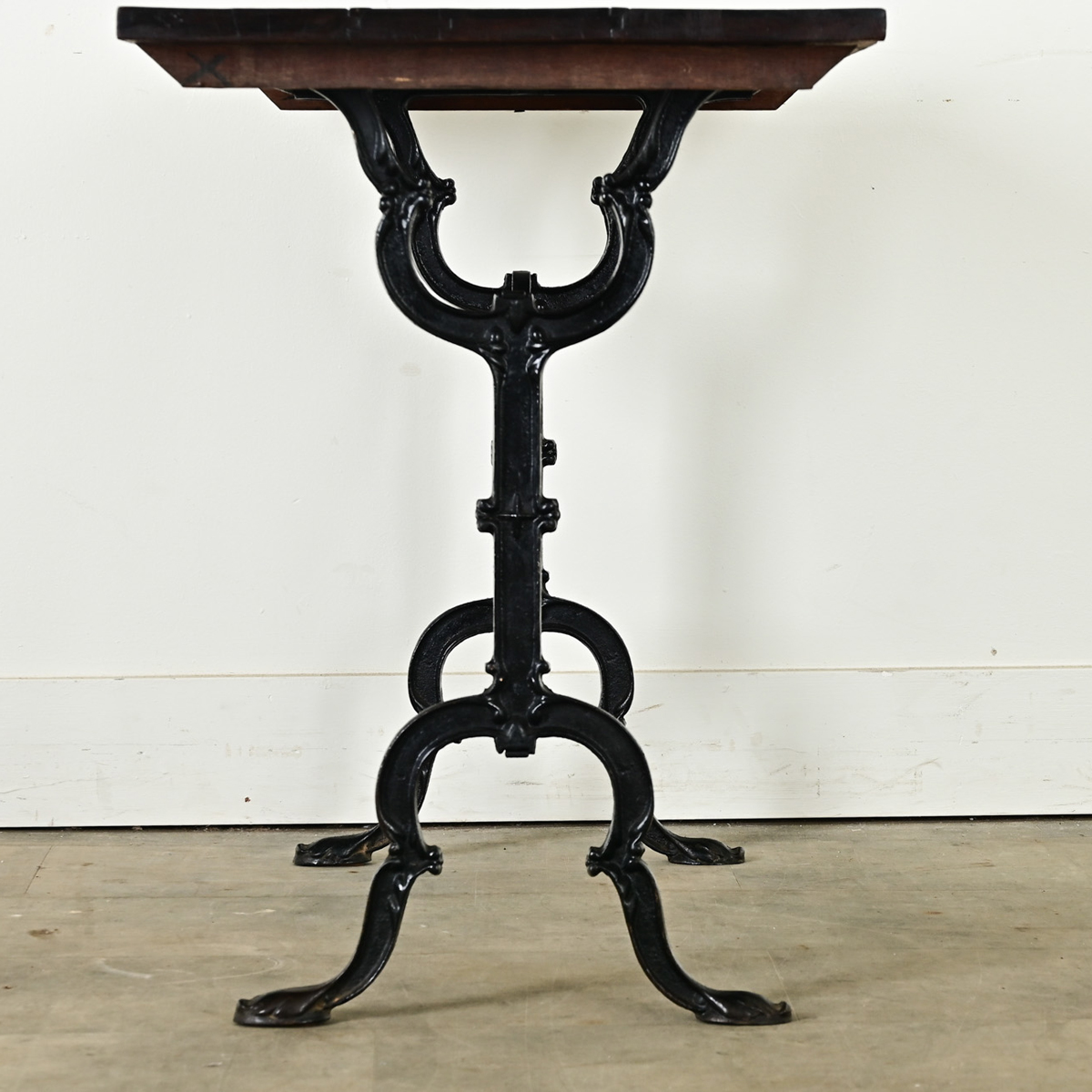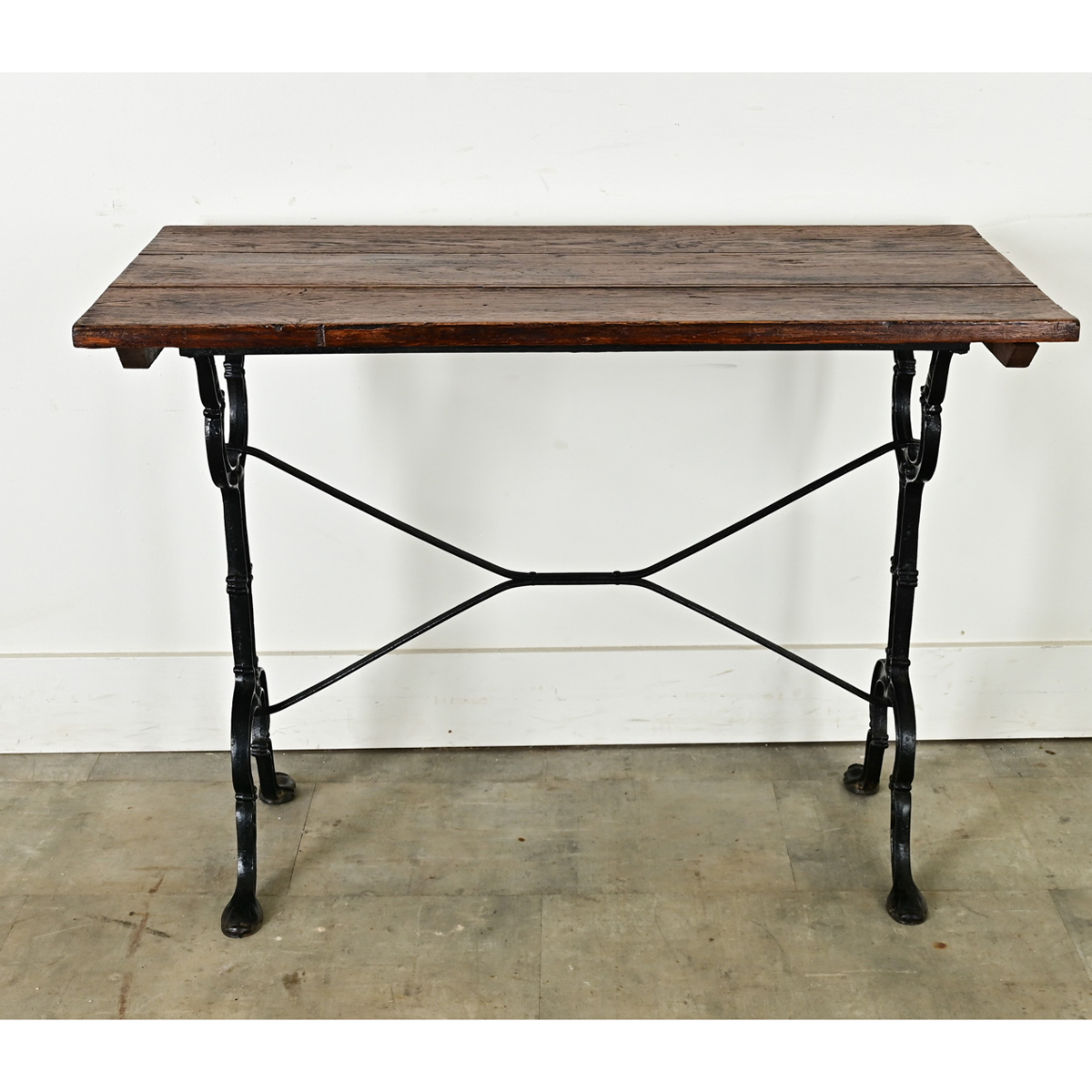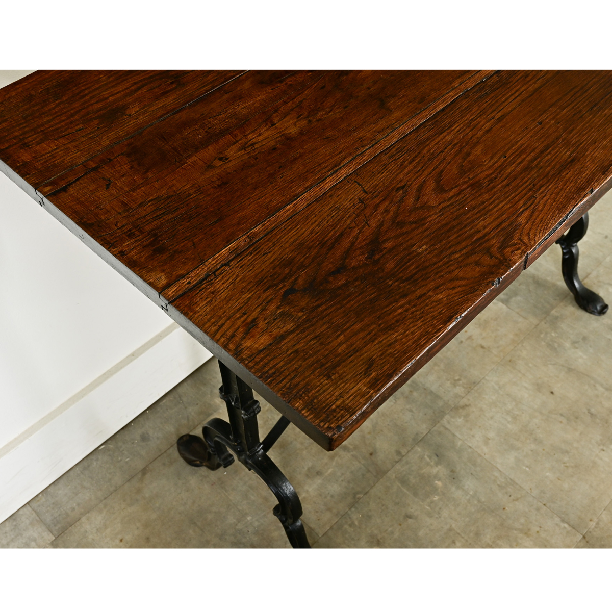 An exceptional 19th century French bistro table with personality and stylized details in the cast iron base. The dark oak planks have a well-patinated surface–consistent with age and type of use–that makes an inviting backdrop for casual dining. A lovely addition to a kitchen or breakfast nook, recreating that Parisian-chic bistro style at home. Cleaned and polished with a French paste wax, ready for your interior. Please view the detailed images.