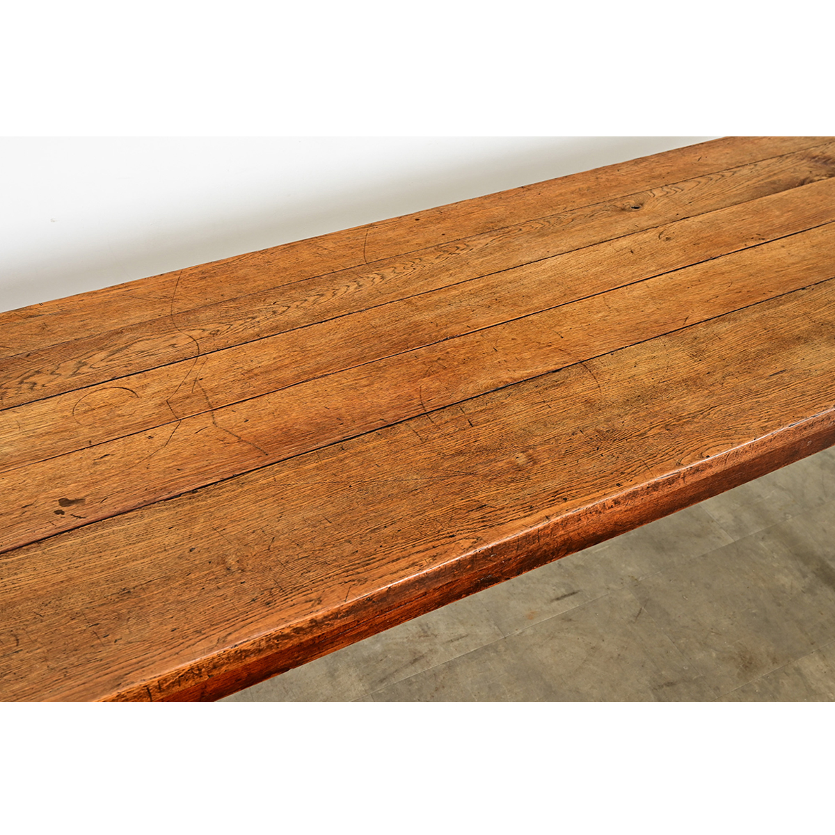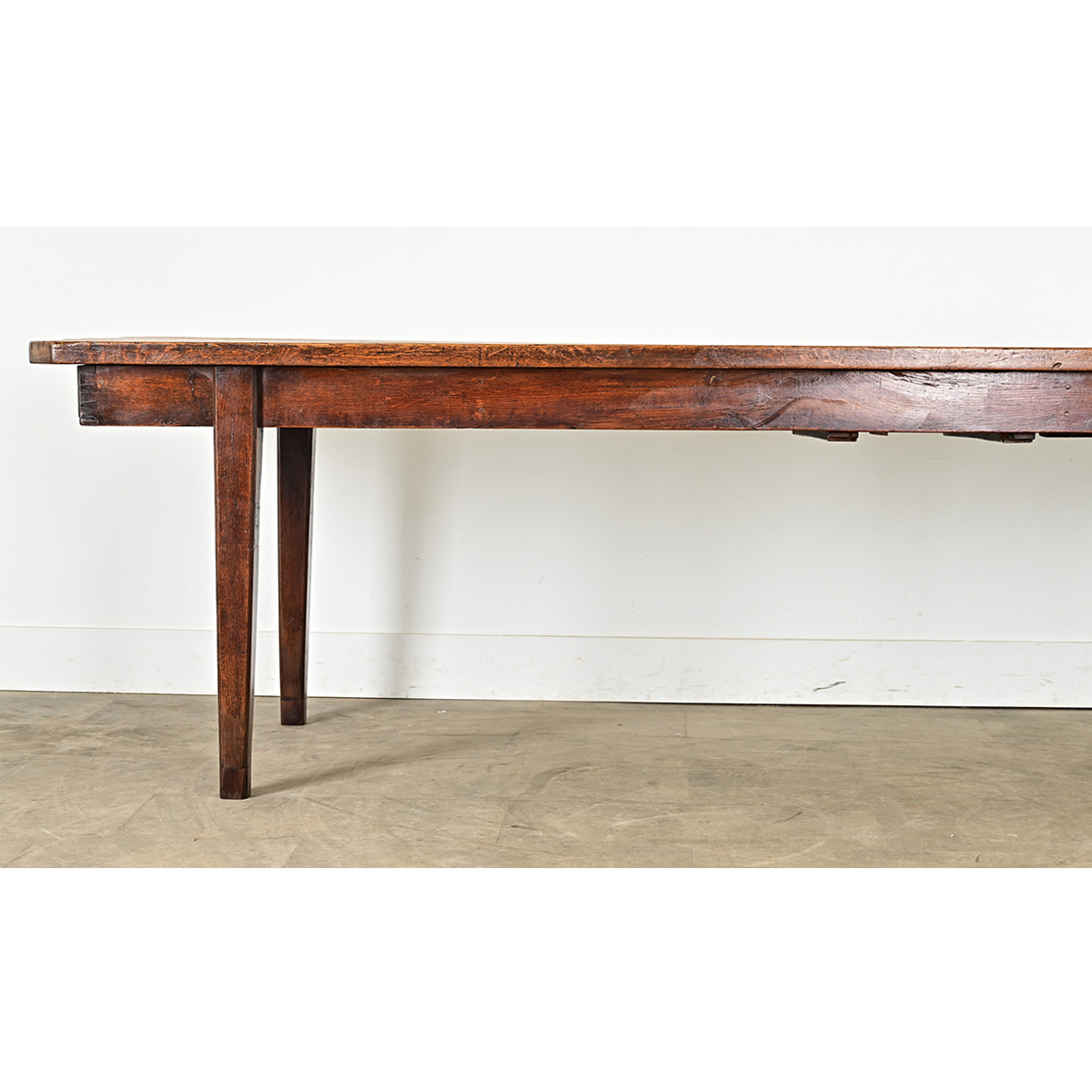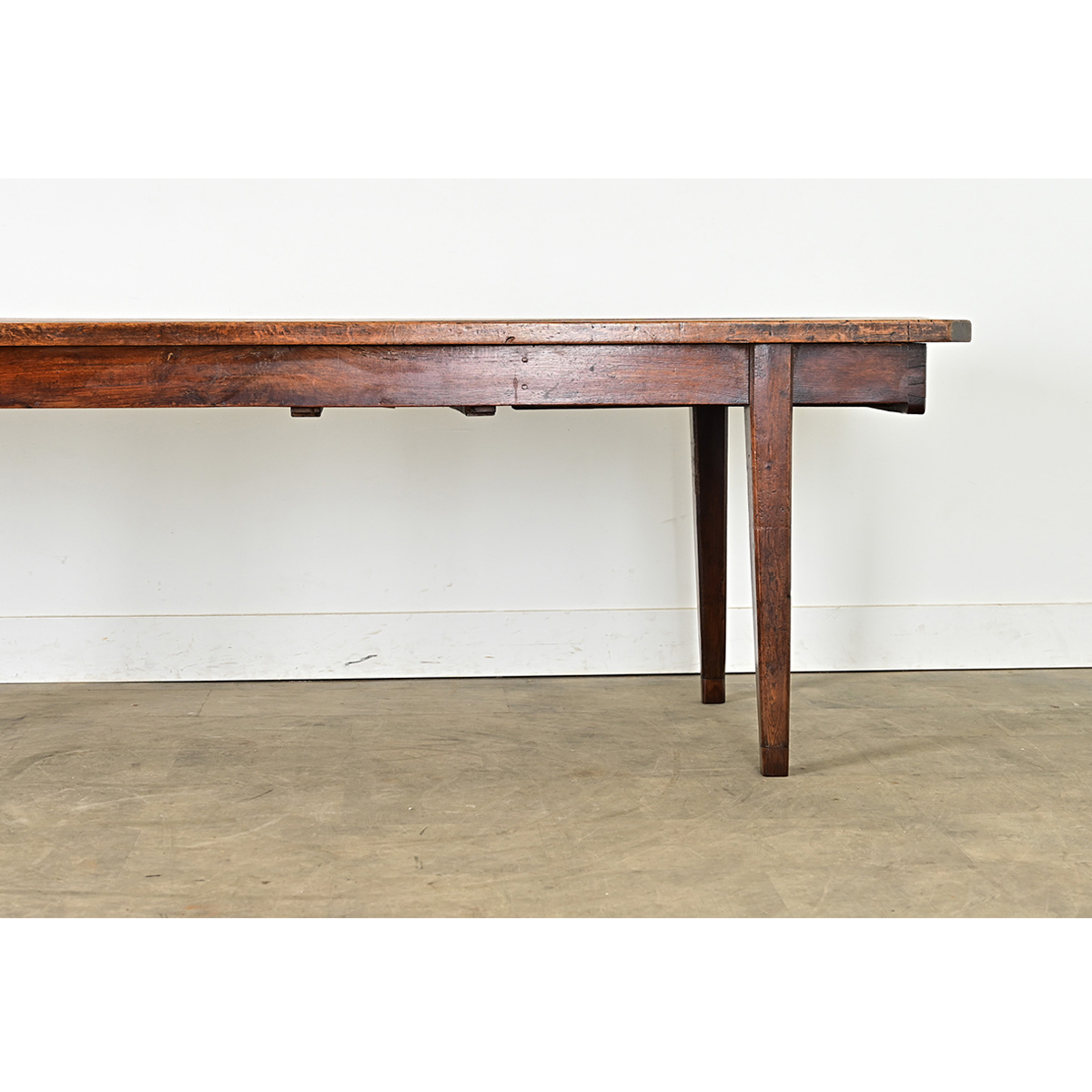 A truly spectacular, enormous solid walnut refectory/dining table from a French convent (“nunnery”) dating to the 19th century. The wood planks forming the top surface are arranged into three, nearly square panels for a sense of order and geometry compared to the fine grain patterns of the walnut. Within the deep apron, each long side contains six drawers where the sisters would have kept their dinner service–which is a great feature to benefit the modern interior where storage is ideally out-of-sight but convenient to retrieve. Three pairs of legs hold up the mass of the table that are turned and tapered in a stack of rings. Note that there is the expected patina of fine scratches, dents, and water rings adding to the historic character of the table which has been recently cleaned and polished with a French paste wax, ready for its next home. Please view the detailed images to see more.