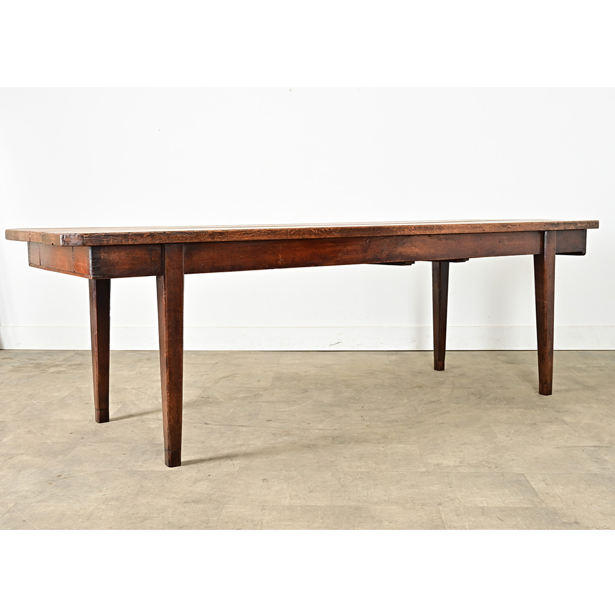 A beautiful country farmhouse dining table from 19th century France, handcrafted in oak. Thick planks of the top surface show a beautiful patina of color and texture among the dark water rings that confirm its daily usage over generations. Chamfered corners give the design further visual interest as well as an inviting detail. Within the apron are two drawers, conveniently placed in one short end side and the adjacent long side. Note the impressive dovetail joinery that is evidence of the talent and technique behind the table’s creation including the squared and slightly tapering legs without visible joinery. Cleaned and polished with a French paste wax, ready to join your interior. Please view the detailed images to see more.