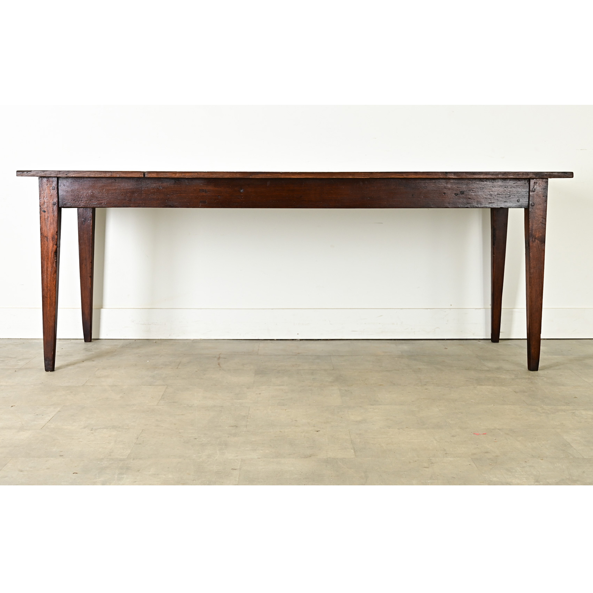 A truly spectacular, enormous solid walnut refectory/dining table from a French convent (“nunnery”) dating to the 19th century. The wood planks forming the top surface are arranged into three, nearly square panels for a sense of order and geometry compared to the fine grain patterns of the walnut. Within the deep apron, each long side contains six drawers where the sisters would have kept their dinner service–which is a great feature to benefit the modern interior where storage is ideally out-of-sight but convenient to retrieve. Three pairs of legs hold up the mass of the table that are turned and tapered in a stack of rings. Note that there is the expected patina of fine scratches, dents, and water rings adding to the historic character of the table which has been recently cleaned and polished with a French paste wax, ready for its next home. Please view the detailed images to see more.
