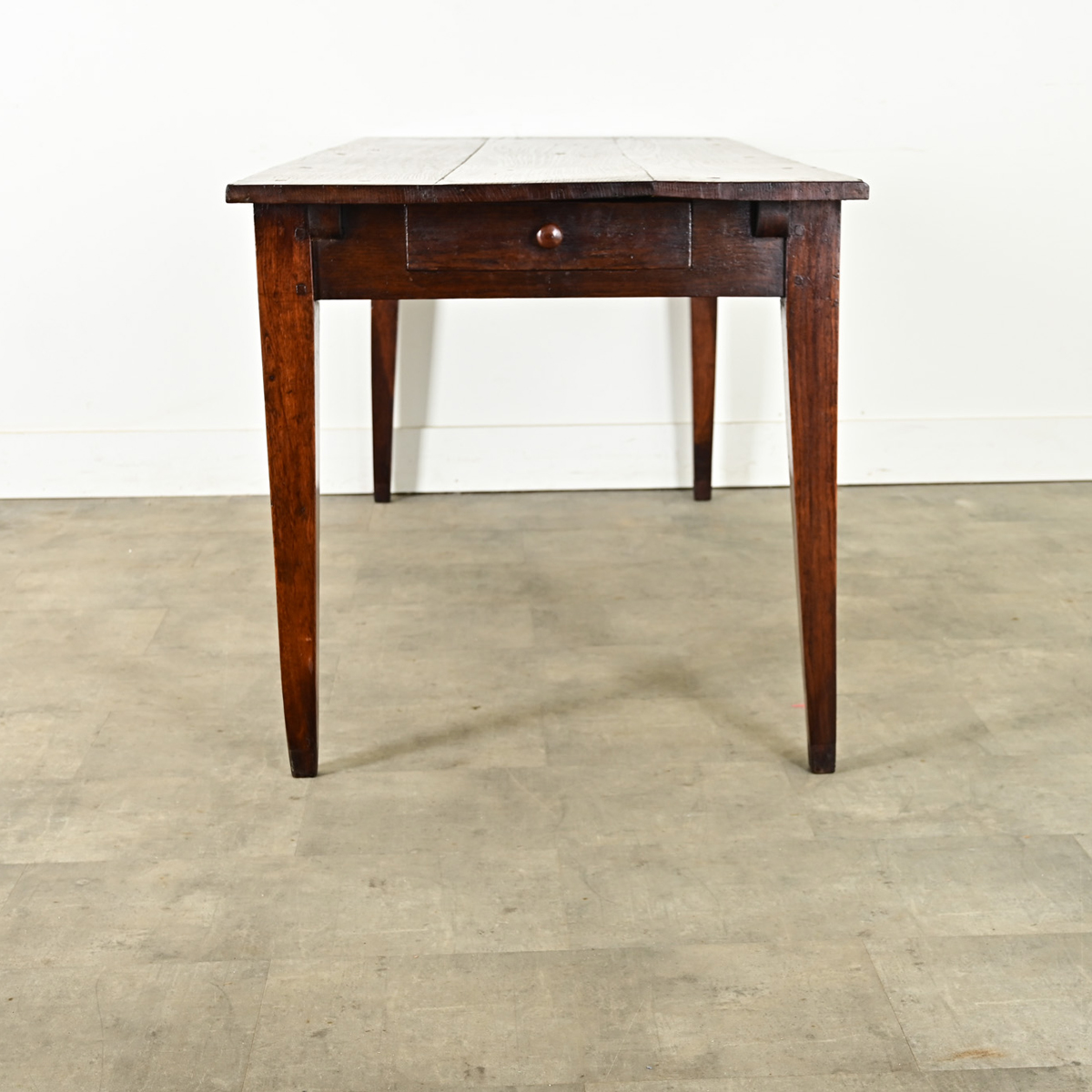 French 19th century farmhouse (dining) table, circa 1840, recently adapted for use as a coffee table to recontextualize the familiarity of a humble farm table placing that sense of warmth and welcome in a living area. Handmade from walnut, the planks of the top feature handsome grain patterns which commingle with the visible square peg joinery and patina from over a century of use. Within the apron is a rather wide drawer for convenient but out of sight storage, opened by a small turned knob. Cleaned and polished with a paste wax, this antique occasional table is ready for its new home. Be sure to view the detailed images to see the current condition.