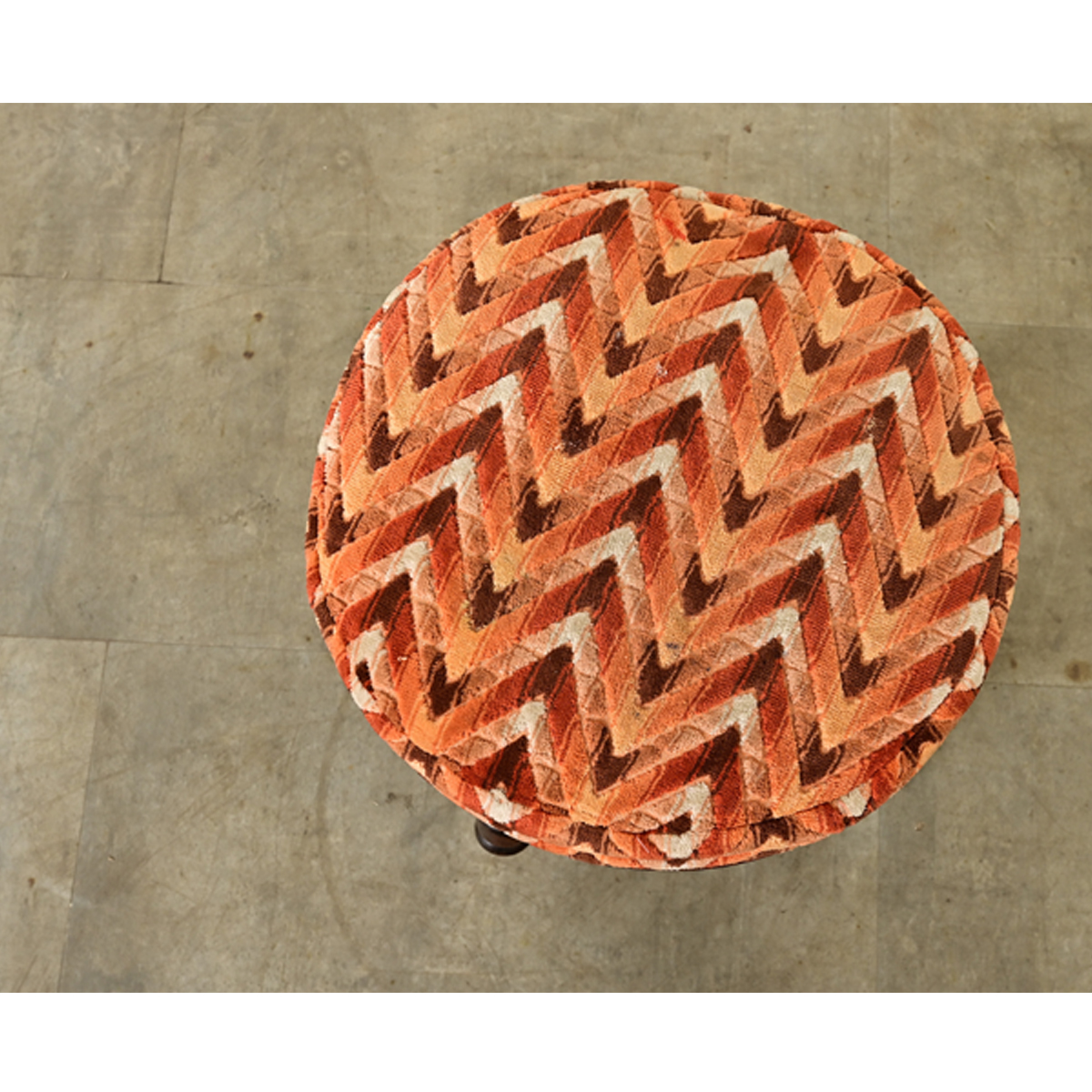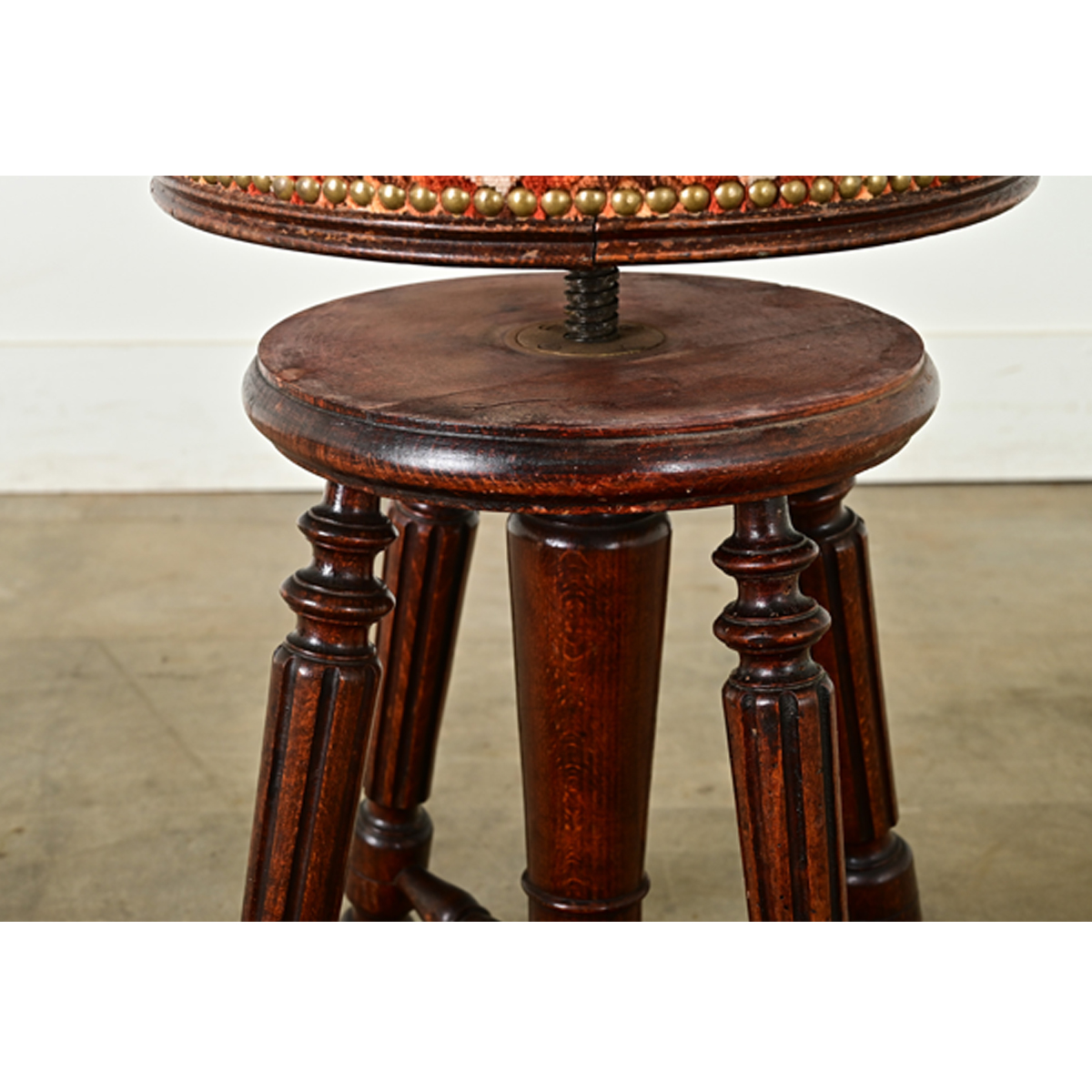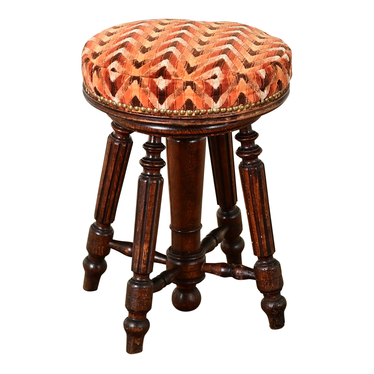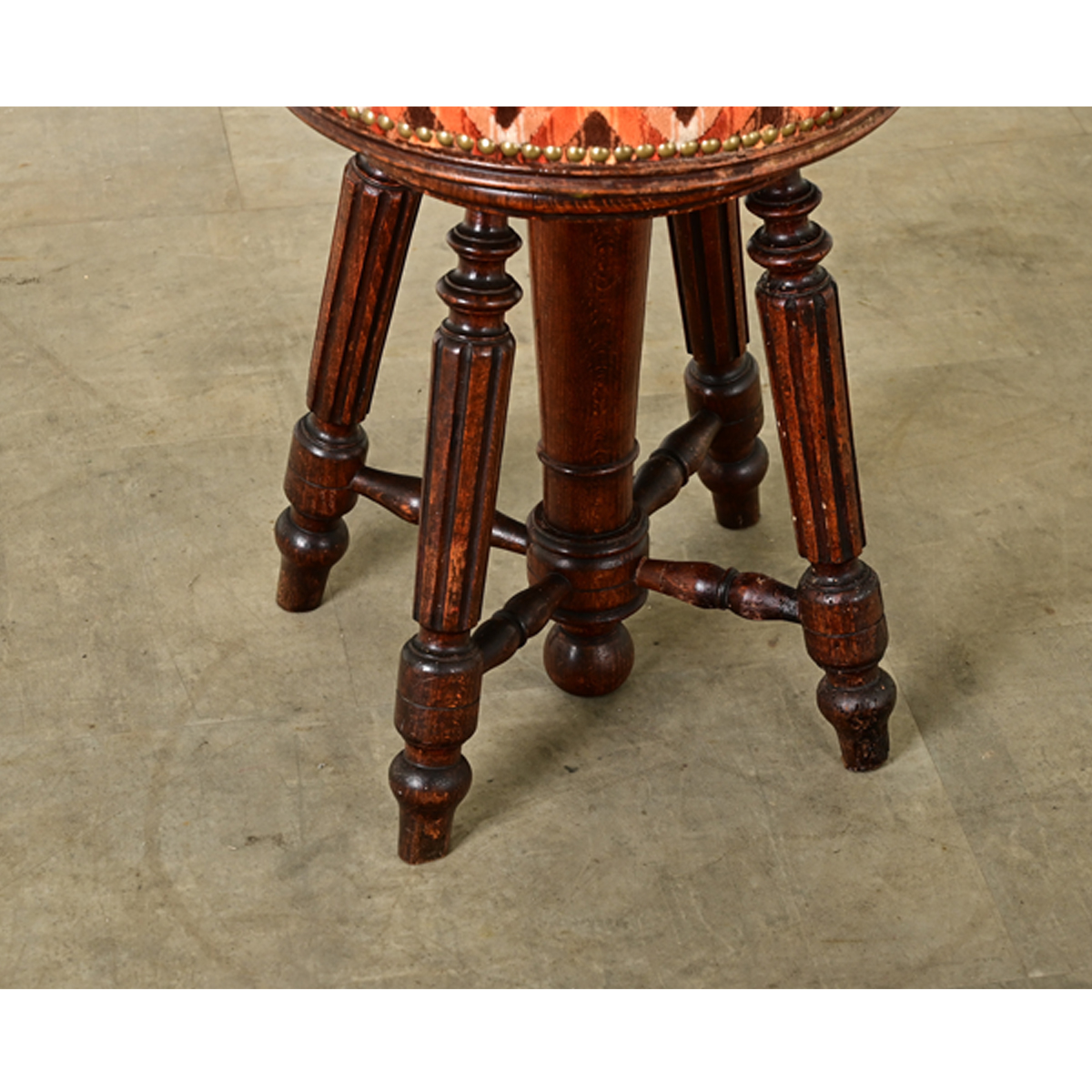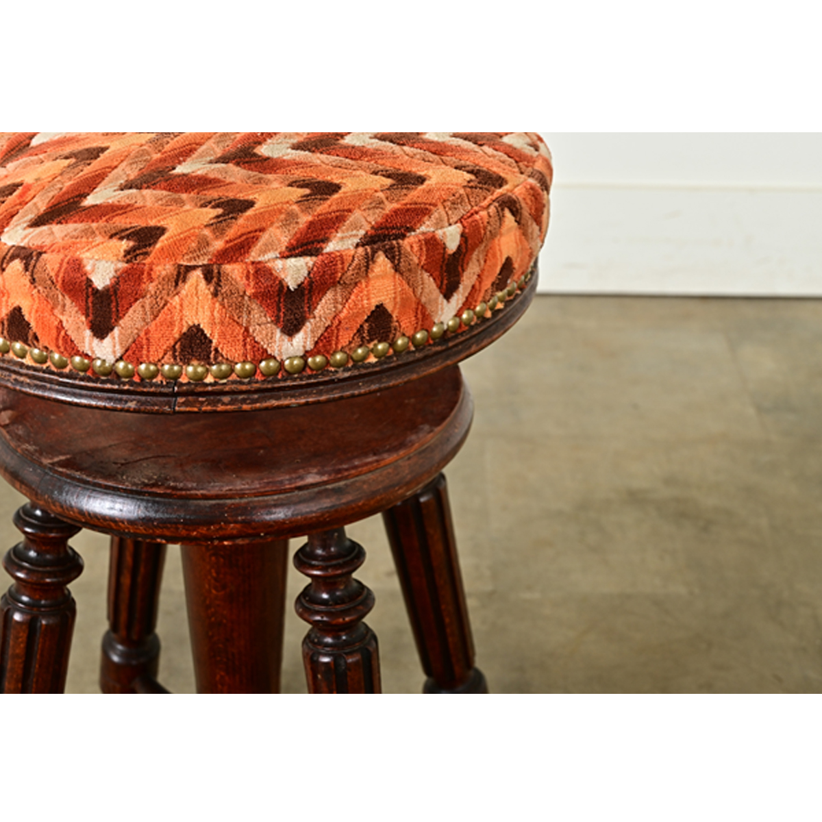 A nifty, 19th century piano stool made in France with adjustable height. The top cushion is upholstered in a weathered, cut-velvet of chevron design in autumnal tones that compliments the dark oak frame. Brass nailheads trace the circumference between the seat and the wood base. The center column of the stool has a hidden steel screw press used to raise and lower the seat height, making this a versatile antique for modern times. Carved and turned legs form an elaborate X-shaped stretcher with a decorative center shaft hiding the metal screw. Be sure to view the detailed images for the current condition of this charming antique stool.