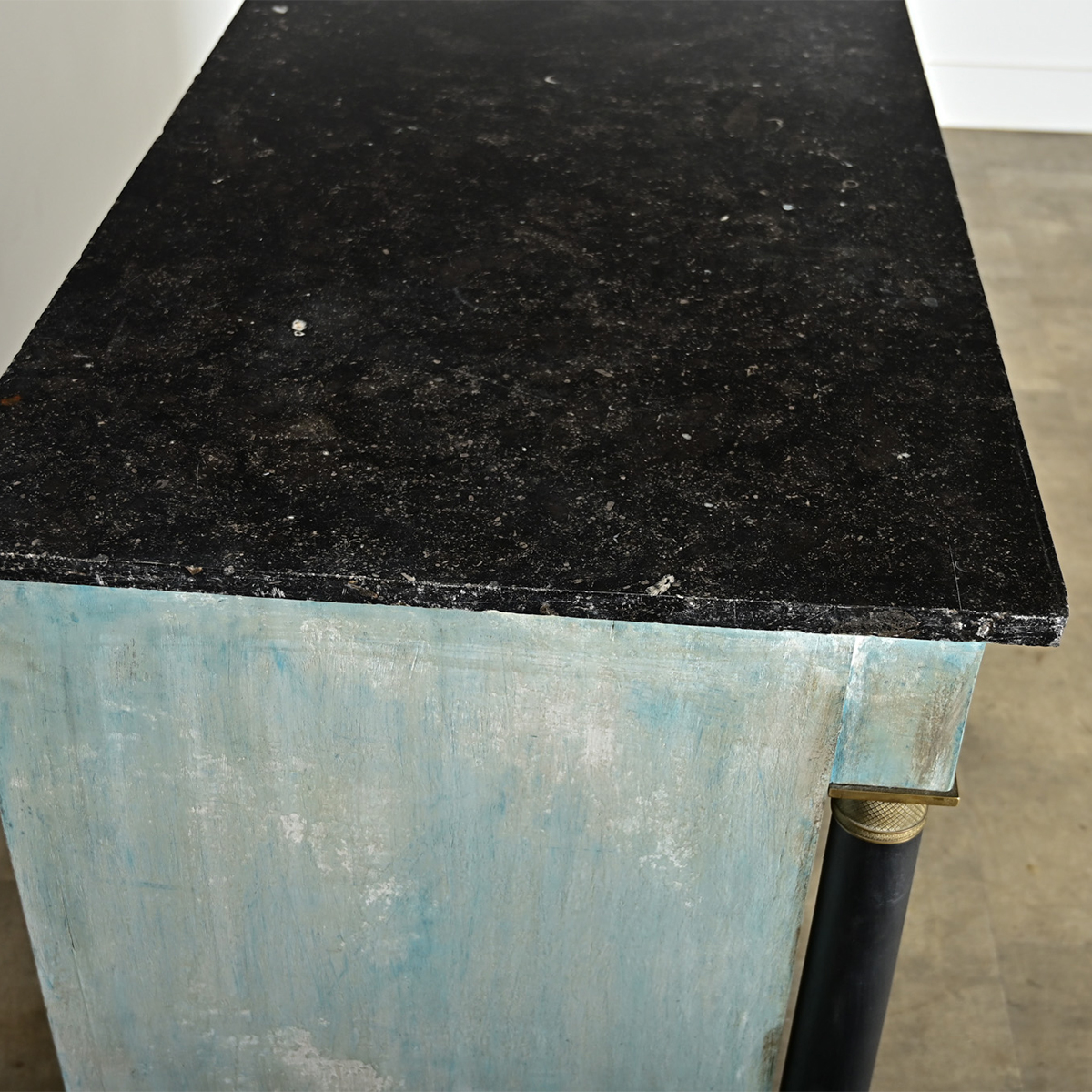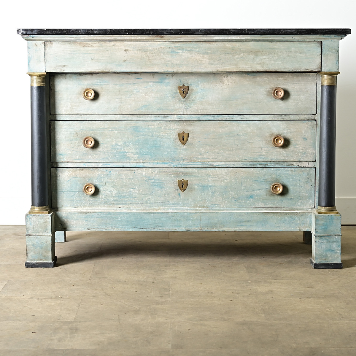 A French Empire walnut commode from the 19th century, updated more recently with blue paint in layered & scraped faux finish that wouldn’t look out of place with Gustavian style furnishings. The top is a slab of dark, nearly black marble flecked with tiny inclusions of fossils like constellations in the night sky. Note that there are multiple worn chips to the edges of the stone, see the image gallery for more details. In the case below is an overhanging frieze drawer, without hardware, using a pair of grooves carved into the bottom edge to slide open. Making up the body of the piece are three large drawers with textured brass knobs and shield escutcheons, however no key is present. The exterior surfaces have unique, painterly layers of light gray over pale blue that give the piece a sense of movement and dynamic color blending with the patina from daily use. Columnar pilasters on each side are emphasized with ebonized finish (coordinating with the stone top) accented with brass capitals and bases in Neoclassical motifs rising from thick, block feet. Cleaned and polished and ready for your interior. Make sure to view the detailed images for a closer look.