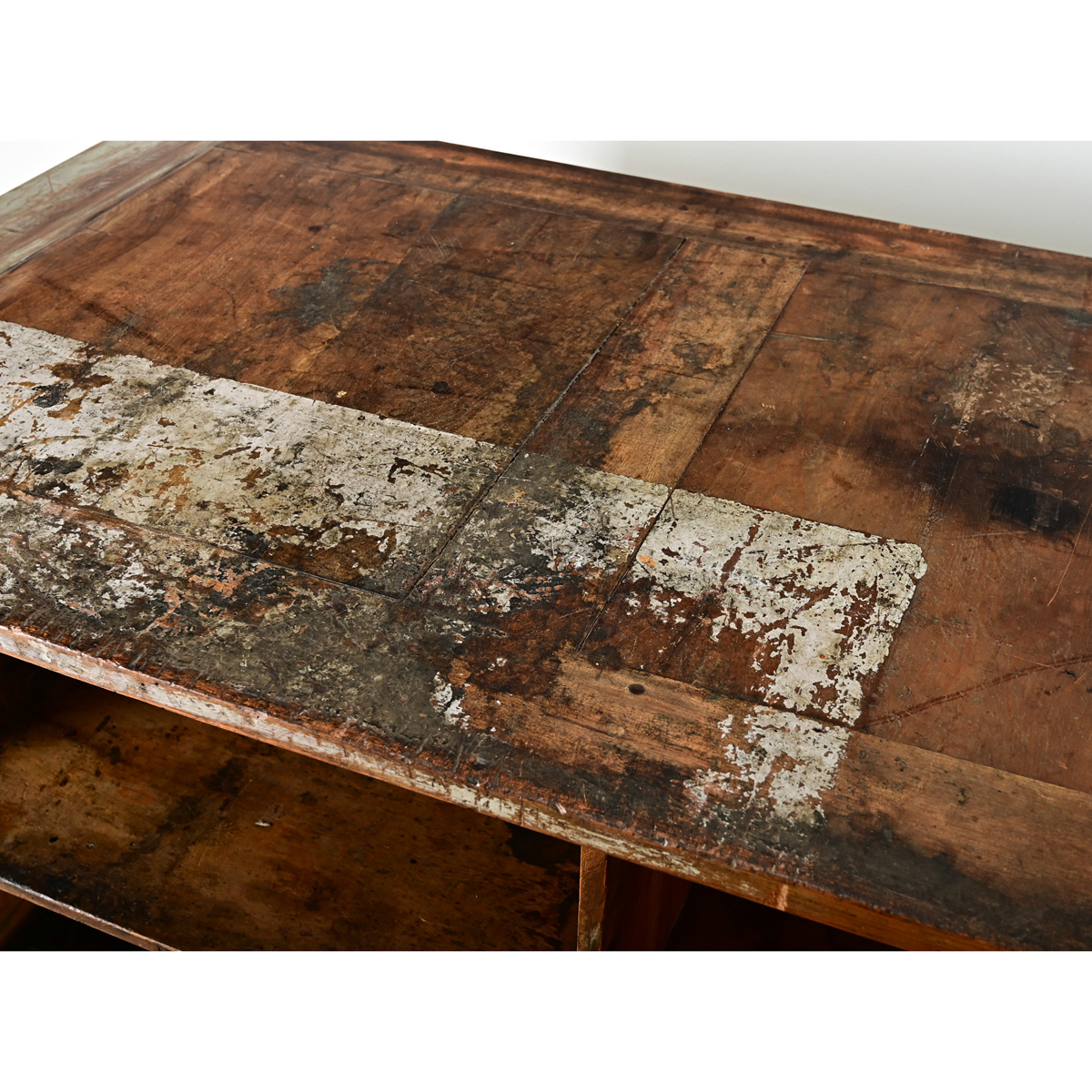 A substantial 19th century French shop counter with original painted finish over beech and walnut construction. Much of the paint has been lost on the top surface, revealing the warm tones and patina of the wood planks contrasting with the pale blue-gray finish on the sides. The back of the fixture is not enclosed, leaving the unpainted interior exposed to quickly view or access the contents of the shelving that will make this antique fixture perfect for an artist or gardener. Raised panels on three sides of the case have charm and visual interest to float the piece in a room–like a kitchen island–or wherever one needs storage and workspace in one unit. Cleaned and polished with a French paste wax, please view the detailed images to see more.