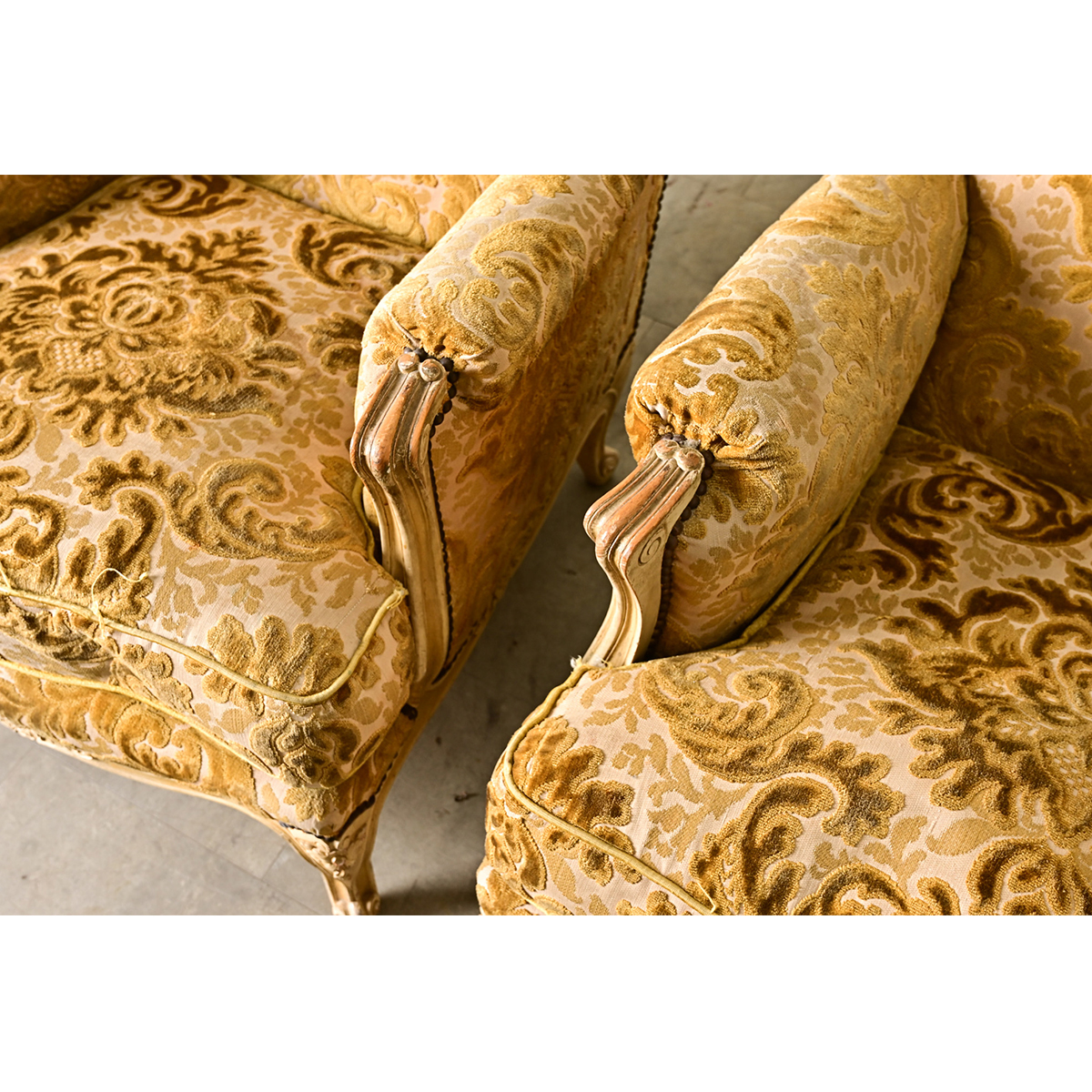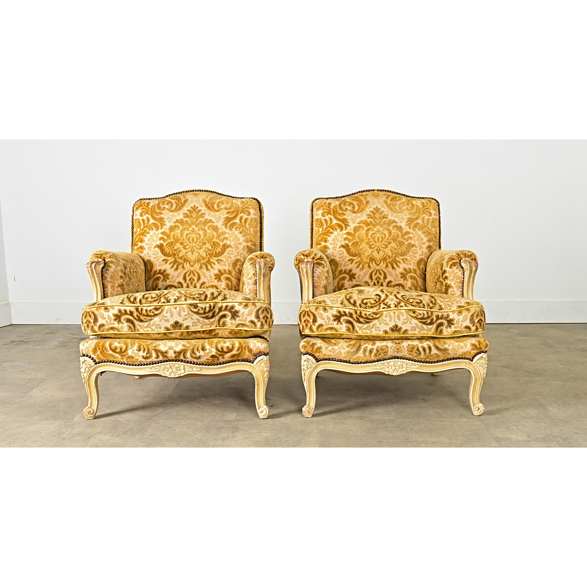 A luxurious and inviting pair of 19th century French Louis XV style carved oak bergeres with olive-gold cut velvet upholstery. The ivory-tone painted wood frames have worn in areas to expose the grain underneath, carved in all those sinuous lines typical of the Louis XV taste, complementing the expressive Damask floral and foliate patterns woven in the upholstery for a tactile experience all around. The comfortable seat interior, using removable seat cushions, is soft and deep to read or lounge, balanced on dainty cabriole legs accented with escargot feet at the floor. Note that some of the piping has come loose, a few nailheads missing, and fabric is abraded which in no way affects the comfort. Please view the detailed images to see the current conditions of these gorgeous bergeres. Sold as a pair only.
