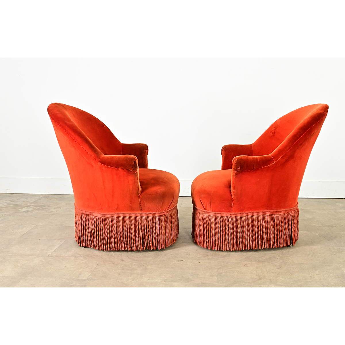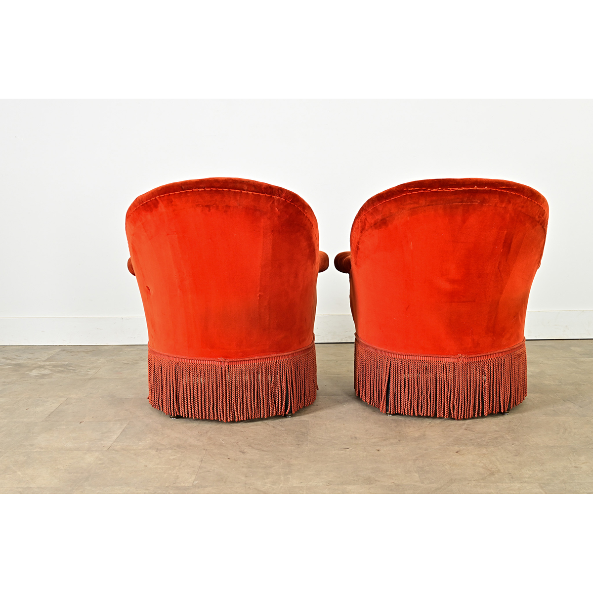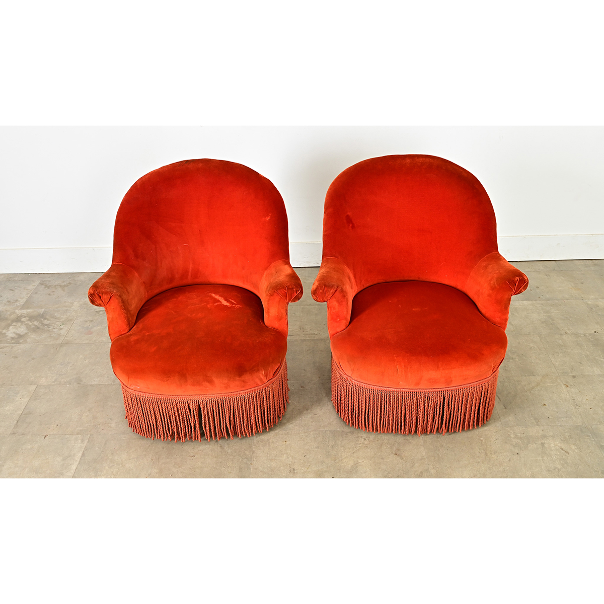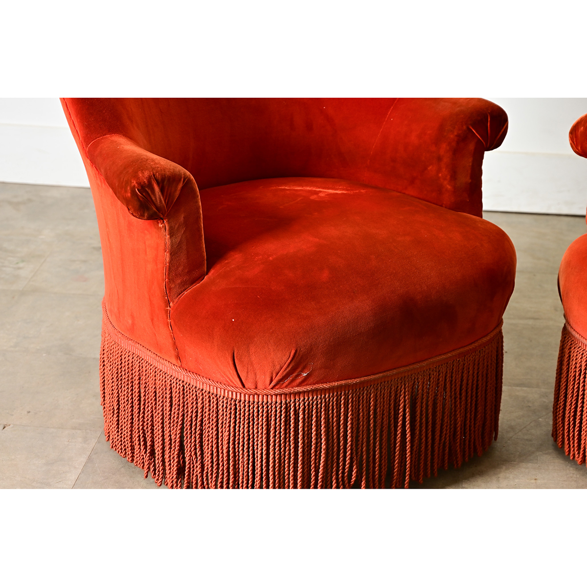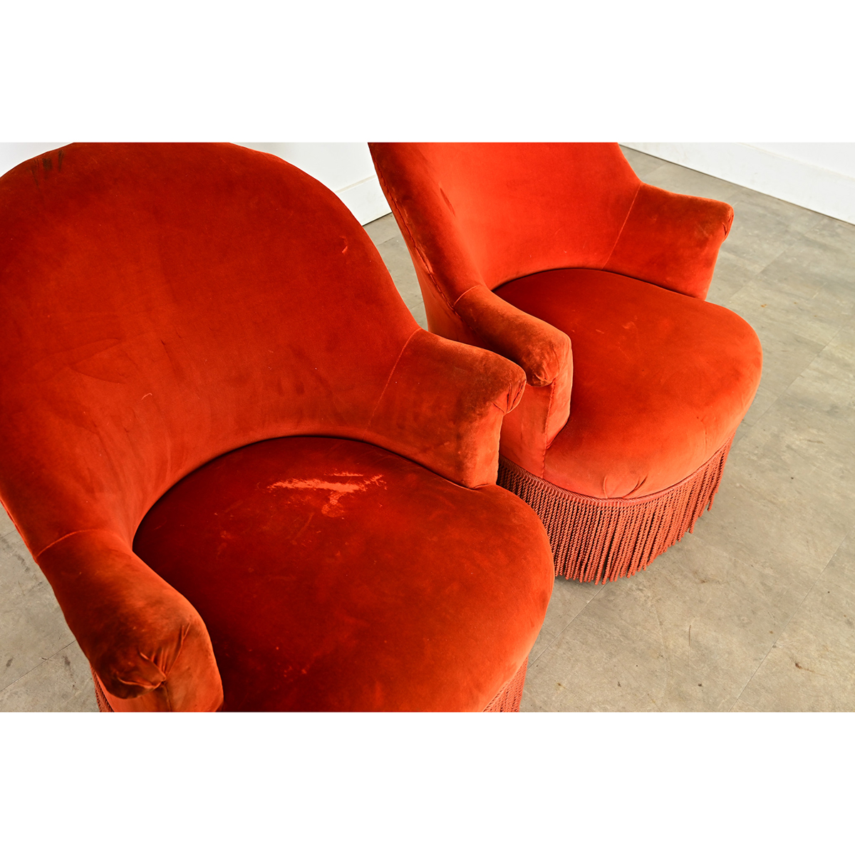 A delightful pair of 19th century French Empire/Napoleon III style “crapaud” chairs that are affectionately named after their resemblance to a toad but in the current vermilion velvet upholstery the effect is a bit more fabulous than amphibious. These examples have a low profile with rounded back–like a tub chair–complete with rolled arms and matching bullion fringe skirting the floor. As a pair they dress up any seating area, creating a cozy and inviting spot to converse or relax in an air of French luxury & sophistication. Internal stuffing remains a comfortable firmness, however there are several areas of wear to the fabric. Please view the detailed images to see the current condition. Sold as a pair.