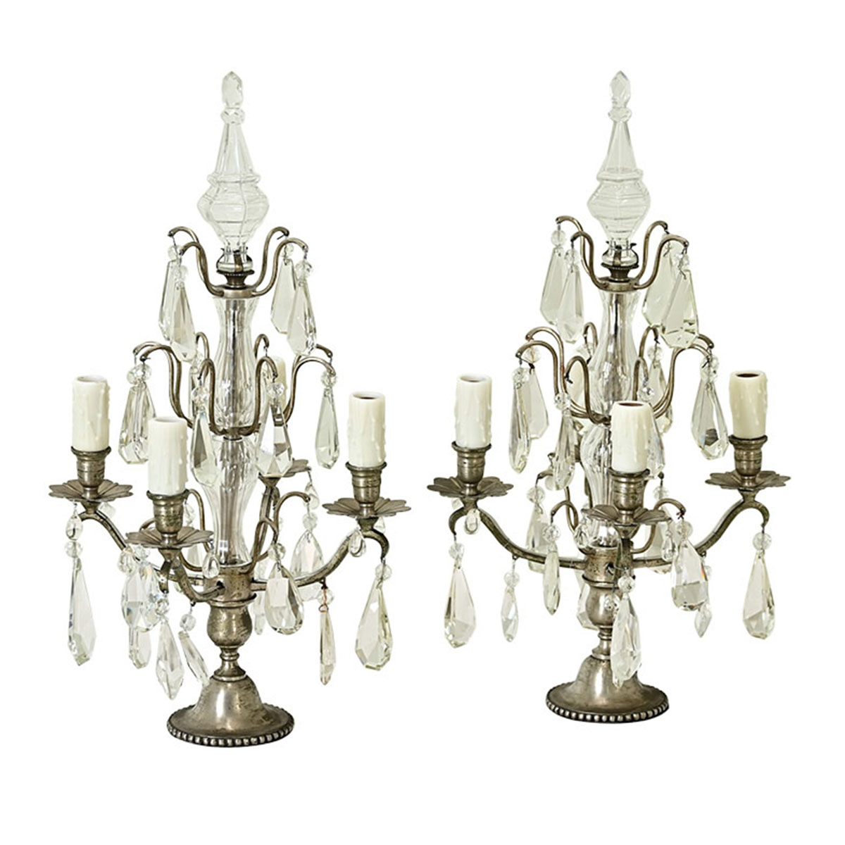 French pair of electrified 19th century girandole candelabra made of pewter frames and dripping with crystals that would be a fabulous statement on a dining room buffet. The lamps are topped with stylized crystal “spikes” rising from hollow crystal forms that disguise the internal column. Cut crystal teardrops are suspended from three graduated tiers of arms, giving rise to four candle covers in floral boboche at the bottom tier using chandelier-base light bulbs. Domed bases are trimmed with a beaded edge for definition against the tabletop. Professionally cleaned and wired for US electrical using UL-listed parts, adding in-line dimmer switches on attractive dark bronze braided cord. Please view the detailed images. Sold as a pair.
