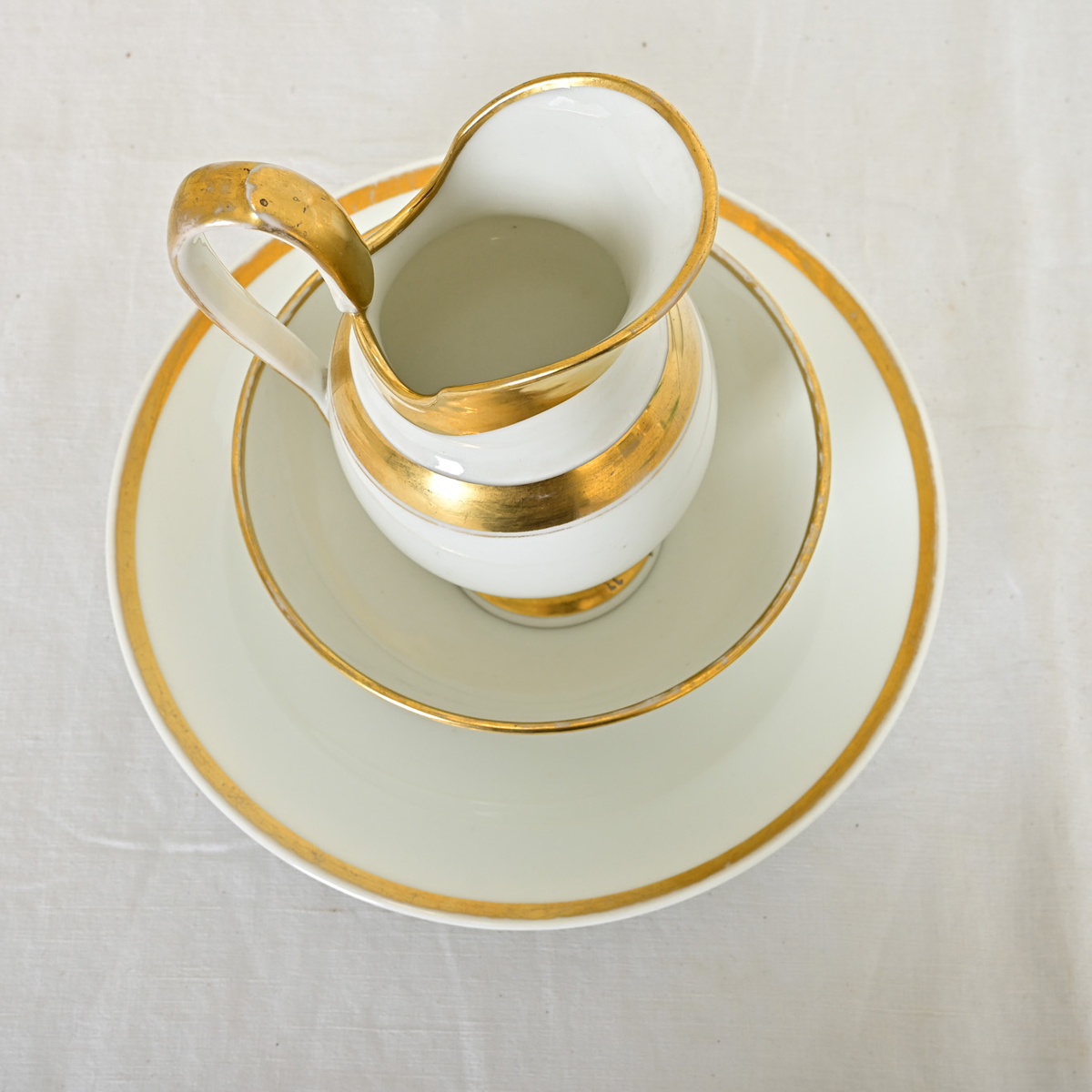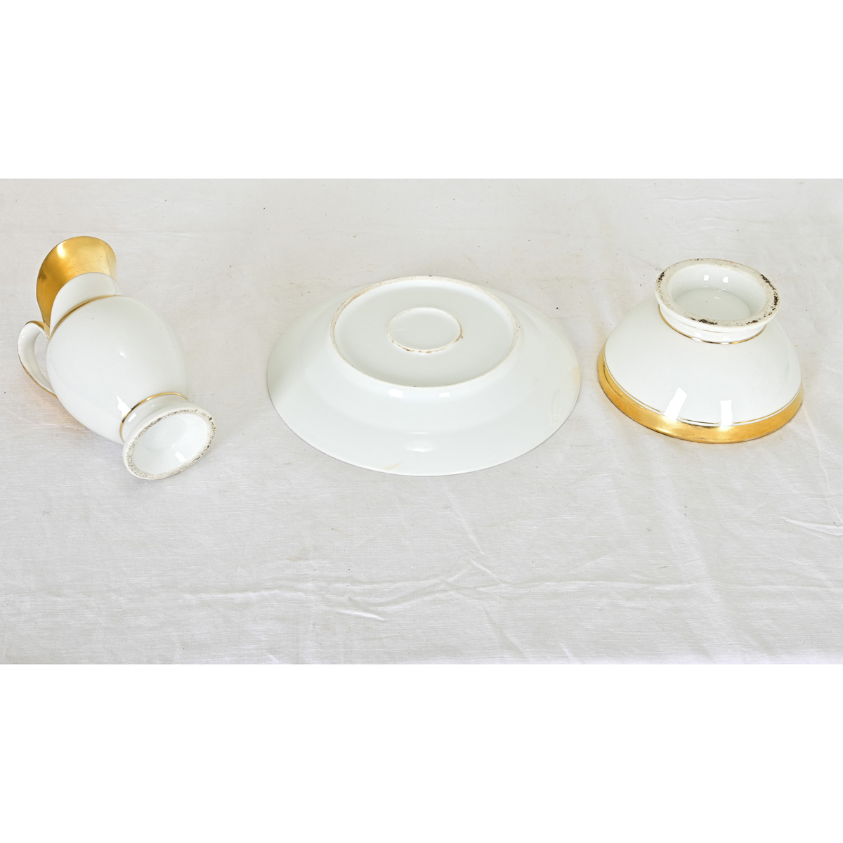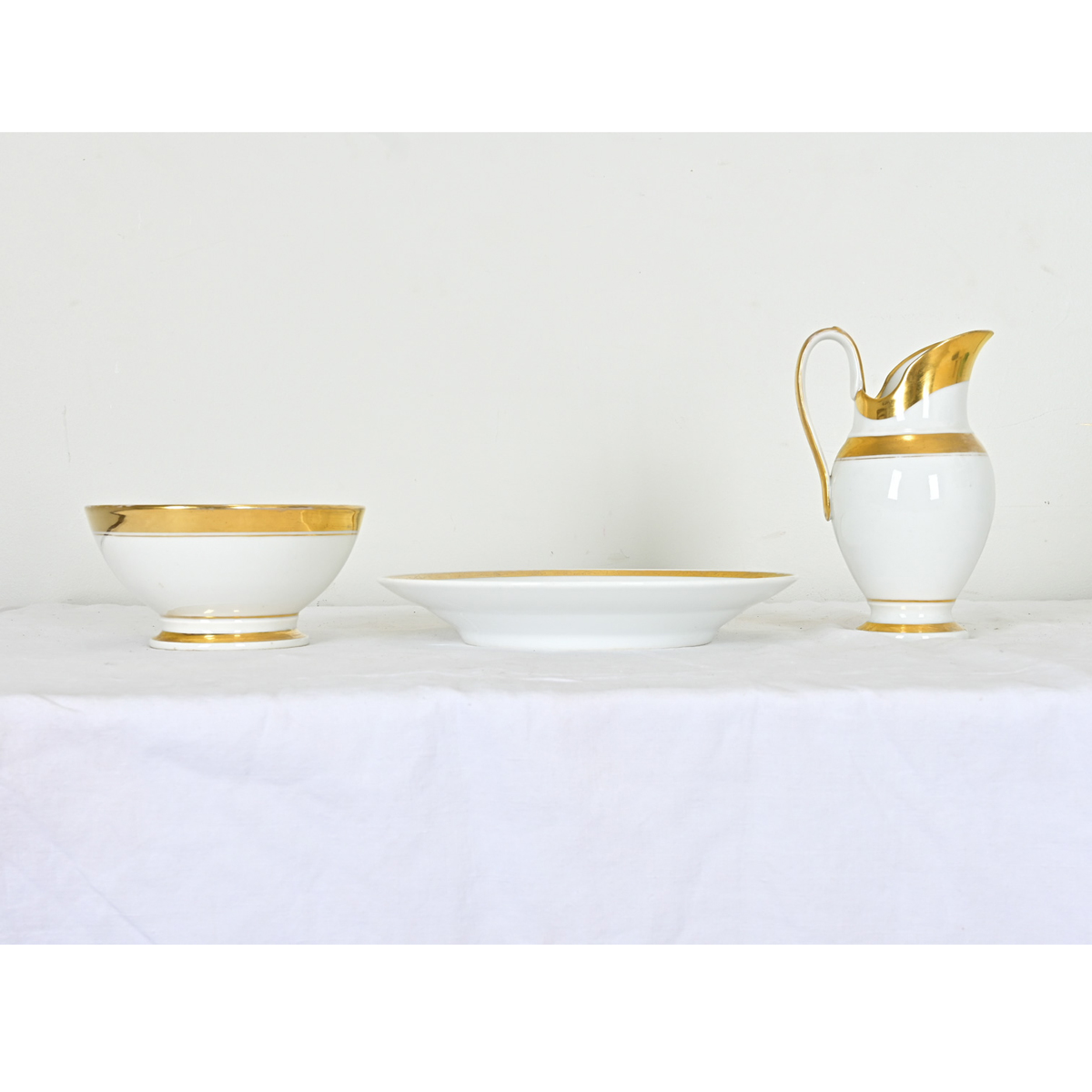 An elegant, three-piece set of old Paris porcelain in the style of Lebon-Halley with a pitcher, bowl, and deep plate in creamy porcelain accented by luxurious gold trim. The underside of the pitcher is marked with a “49” in the bottom and a “10” etched into the foot. Use individually as beautiful serving pieces or display as an ensemble. Please view the detailed images to see the current condition. Sold as a set of three.