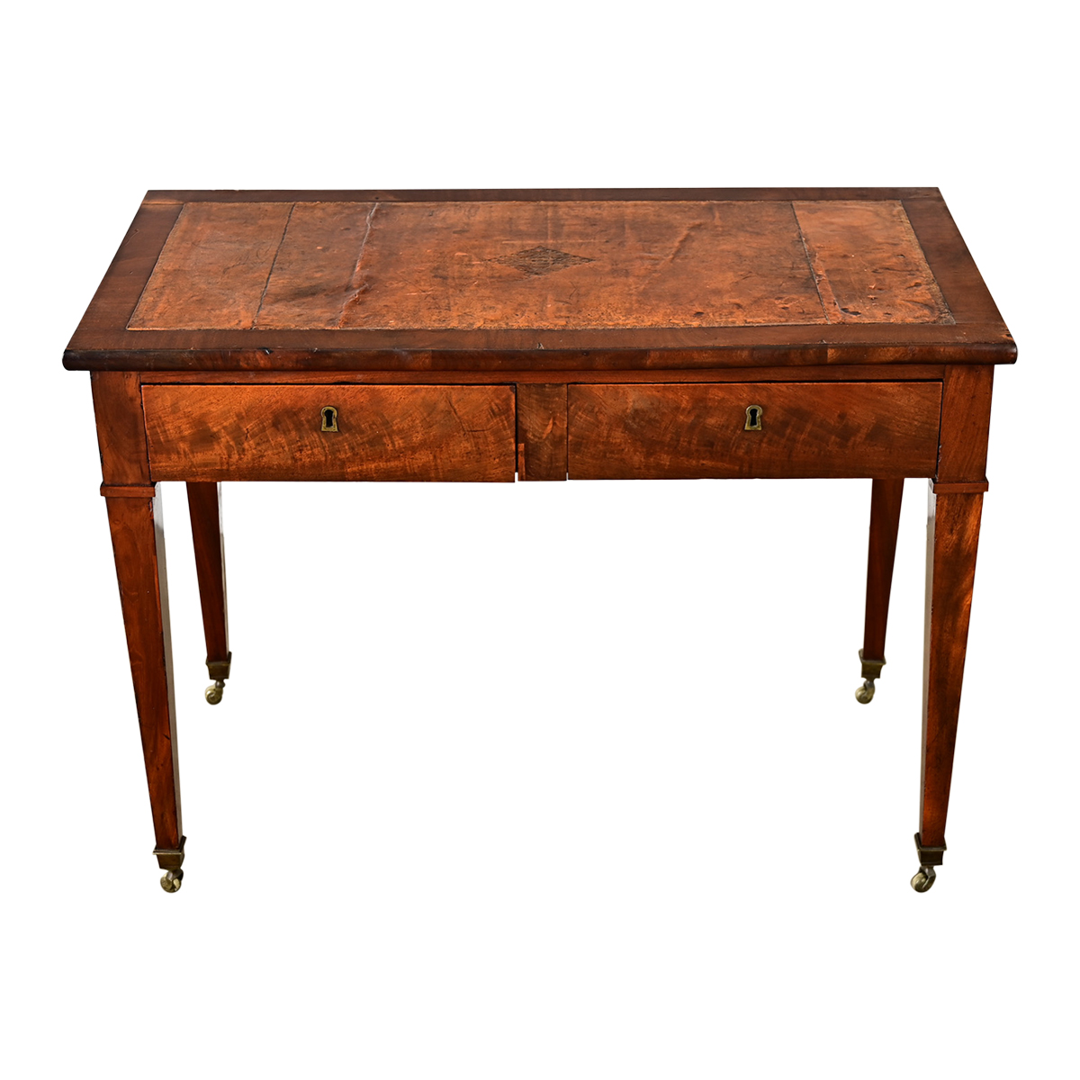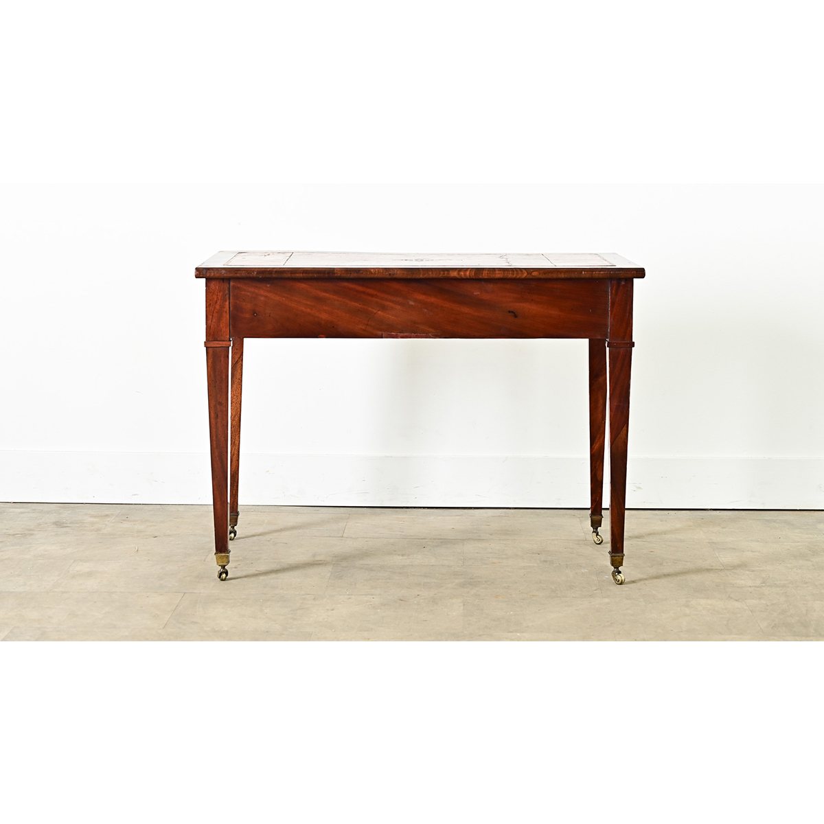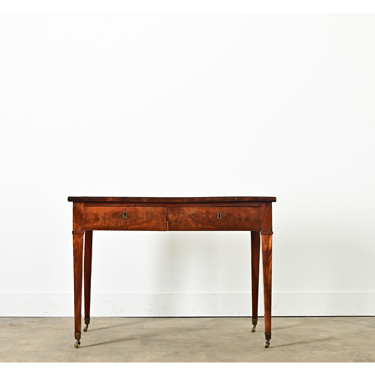 A petite, French occasional table or writing desk from the 19th century with a very well-patinated leather surface in a gorgeous mahogany frame. The Directoire silhouette of this handsome desk celebrates the strength of refined proportions and restrained ornamentation. Nearly two centuries of use have left dark, mottled areas of color and texture on the leather, partially obscuring the design of the tooled edges. In the case are two drawers, which show keyholes although no key is present, instead, the drawers easily open by pulling the lower edge of the drawer fronts. Four squared and tapering legs rest on small brass casters to potentially move about. We think this desk will be a pleasure to use anywhere. Cleaned and polished with a French paste wax, ready for your interior. Please view the detailed images to see the current condition.