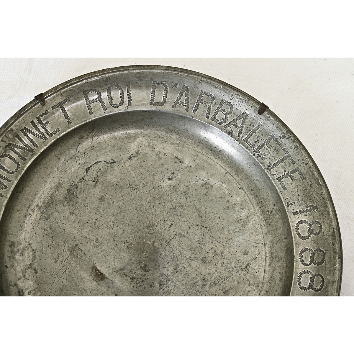 A 19th century pewter charger plate from the area of Lille, France with wrigglework lettering on the inscription. This dedicatory plate would have been presented in the year 1888 to a Mr. Henri Monnet, the “Crossbow King” who must have won a very important archery championship. This unique and personal item would be fantastic as a decorative tray or part of a larger collection. Metal plate hanger for wallmounting included. Faint hallmarks from the notable house of Oudart. Please view the detailed images to see more.