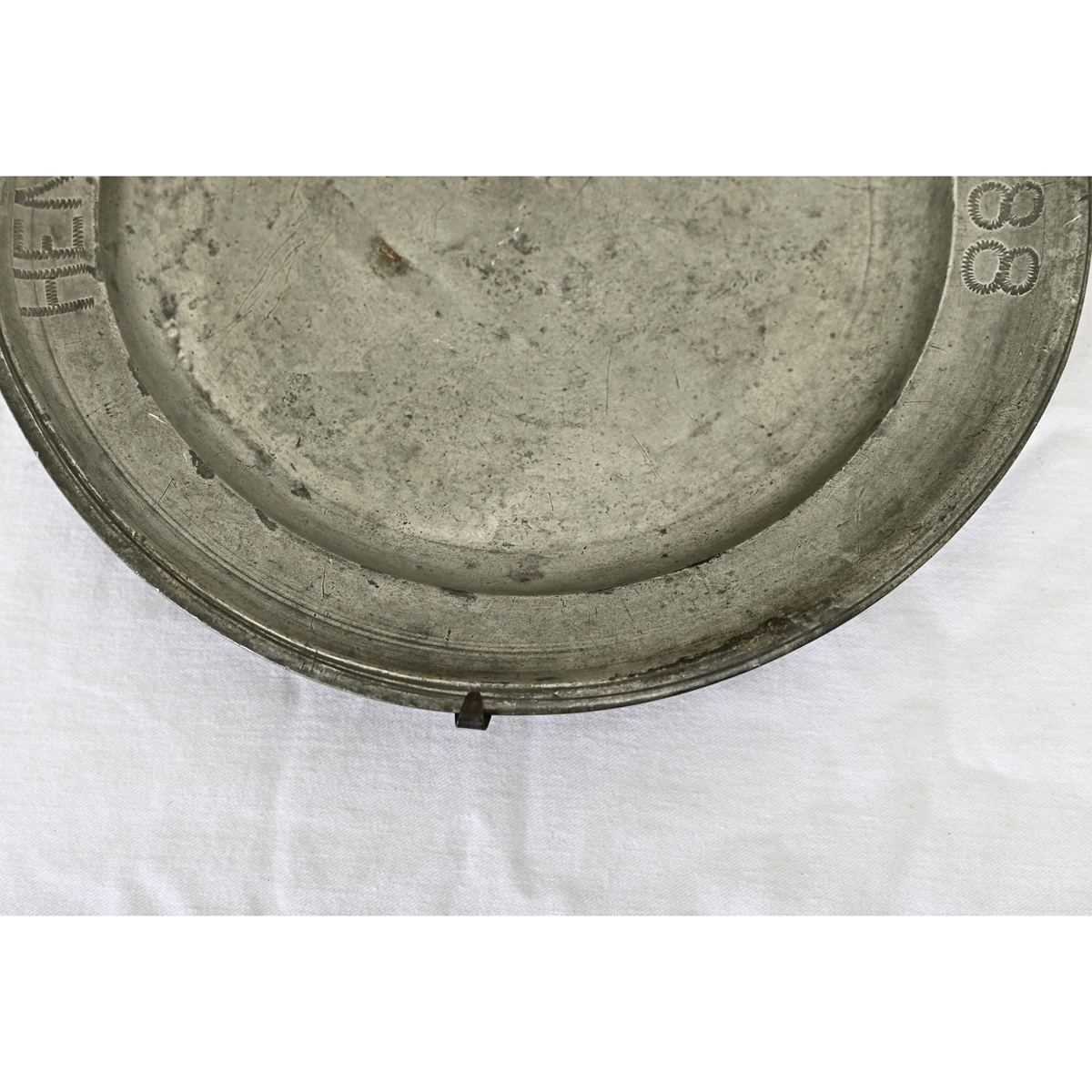 A 19th century pewter charger plate from the area of Lille, France, with zig-zag wrigglework engraving for the text. This dedicatory plate would have been presented in the year 1836 to a Mme. Rigaut, “Queen of the Society of the Rising Sun” in Hellemmes. Such a unique and personal item would be fantastic as a decorative tray or part of a larger collection. Please view the detailed images to see more.