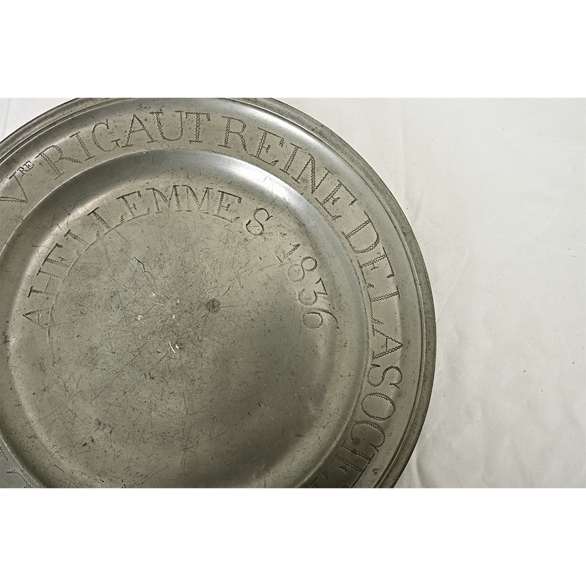 A 19th century pewter charger plate from the area of Lille, France, with zig-zag wrigglework engraving for the text. This dedicatory plate would have been presented in the year 1836 to a Mme. Rigaut, “Queen of the Society of the Rising Sun” in Hellemmes. Such a unique and personal item would be fantastic as a decorative tray or part of a larger collection. Please view the detailed images to see more.
