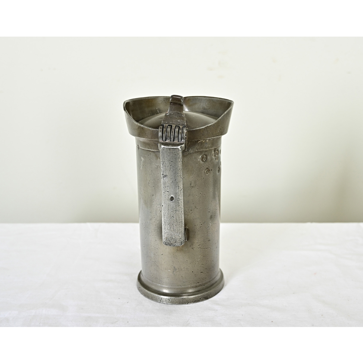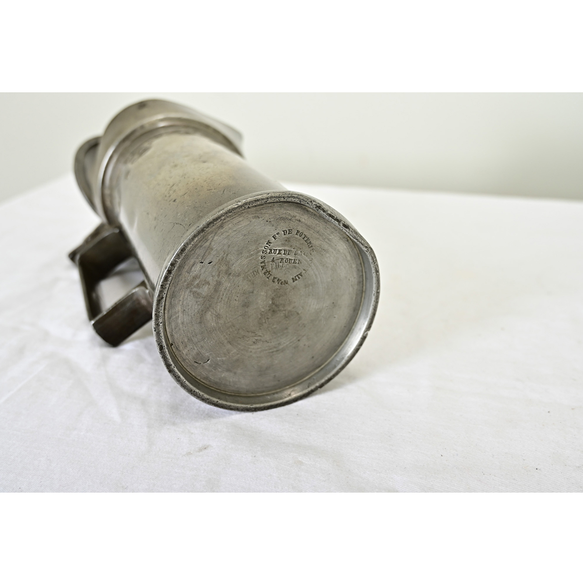 A French pewter tankard from the 19th century, hallmarked from Rouen, likely used in a pub or similar establishment. The front of the mug is engraved with the precise capacity of one liter, and the upper edge of the lip is dotted with a multitude of stamps left by inspectors from the department of weights & measures over the years confirming that the proprietor was not shorting the customers of their due quantity. This will make an interesting decorative statement in any kitchen or bar. Please view the detailed images to see the current condition.