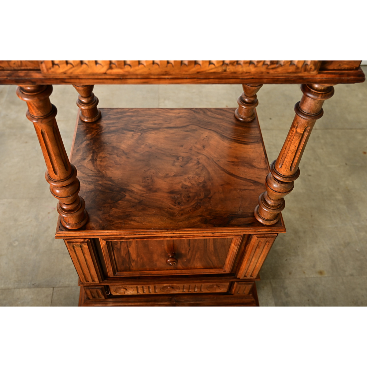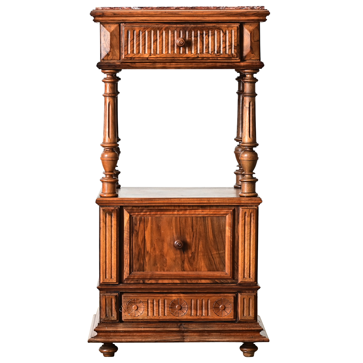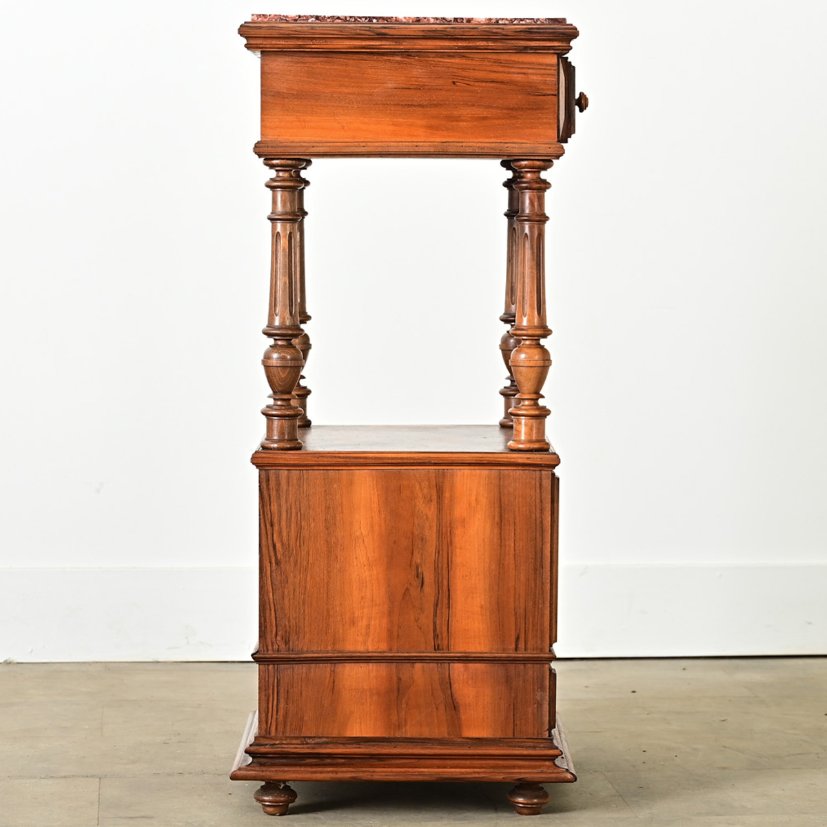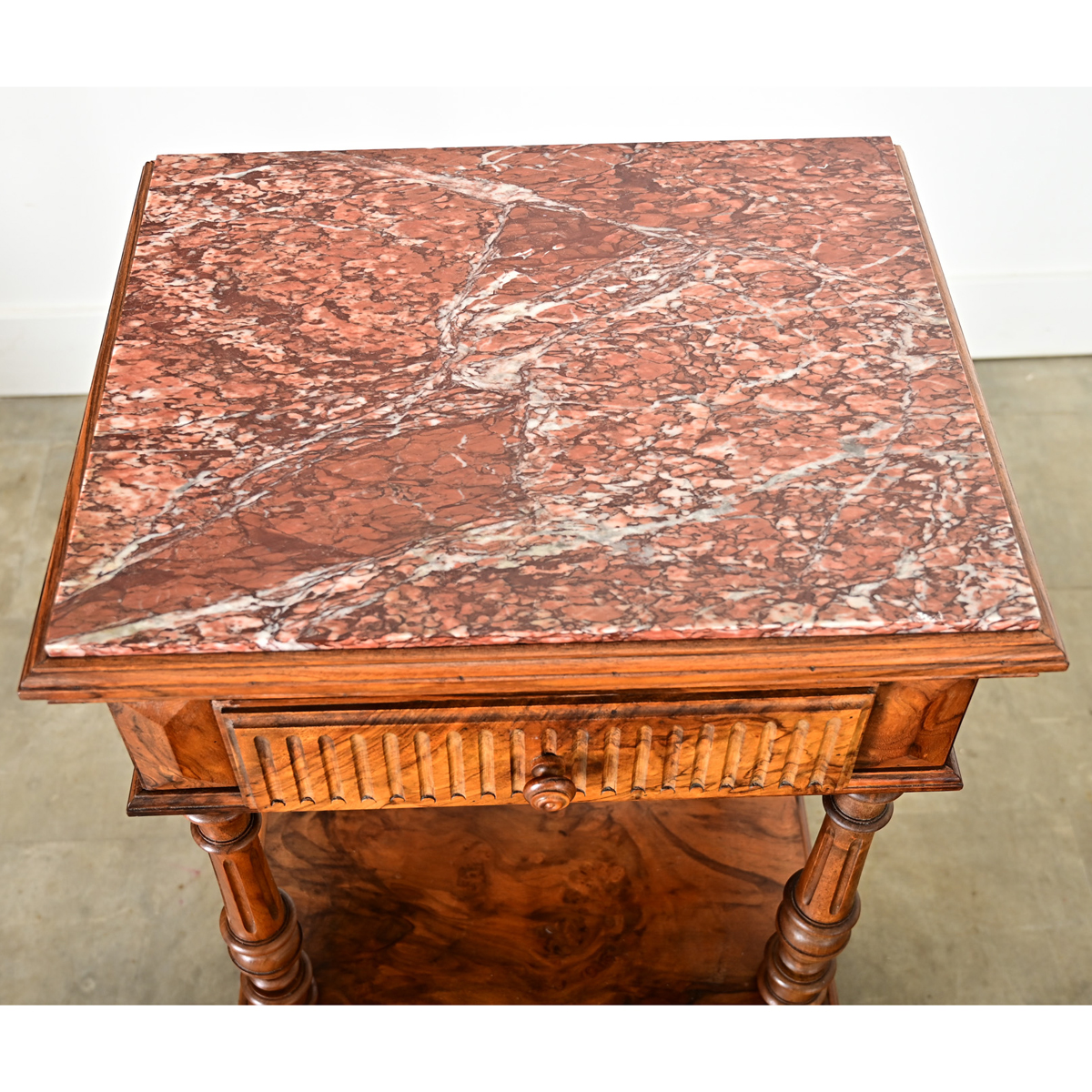 French, 19th century rosewood and red marble bedside table in a breathtaking variety of Louis XVI-inspired carving techniques that highlights the dramatic coloration and painterly striations of this covetable material. The luxurious red marble surface sits above an upper case housing one small drawer, accented on the drawer front with fluted carvings and faceted panels to the sides. Four carved and turned legs rise from the lower cabinet with one main compartment over a short door carved with rosettes, just above the feet. Here is a small but robust accent table to use in a bedroom, bath, or other living area that needs an exotic flair. Cleaned and polished with a French paste wax, ready for your interior. Please view the detailed images.