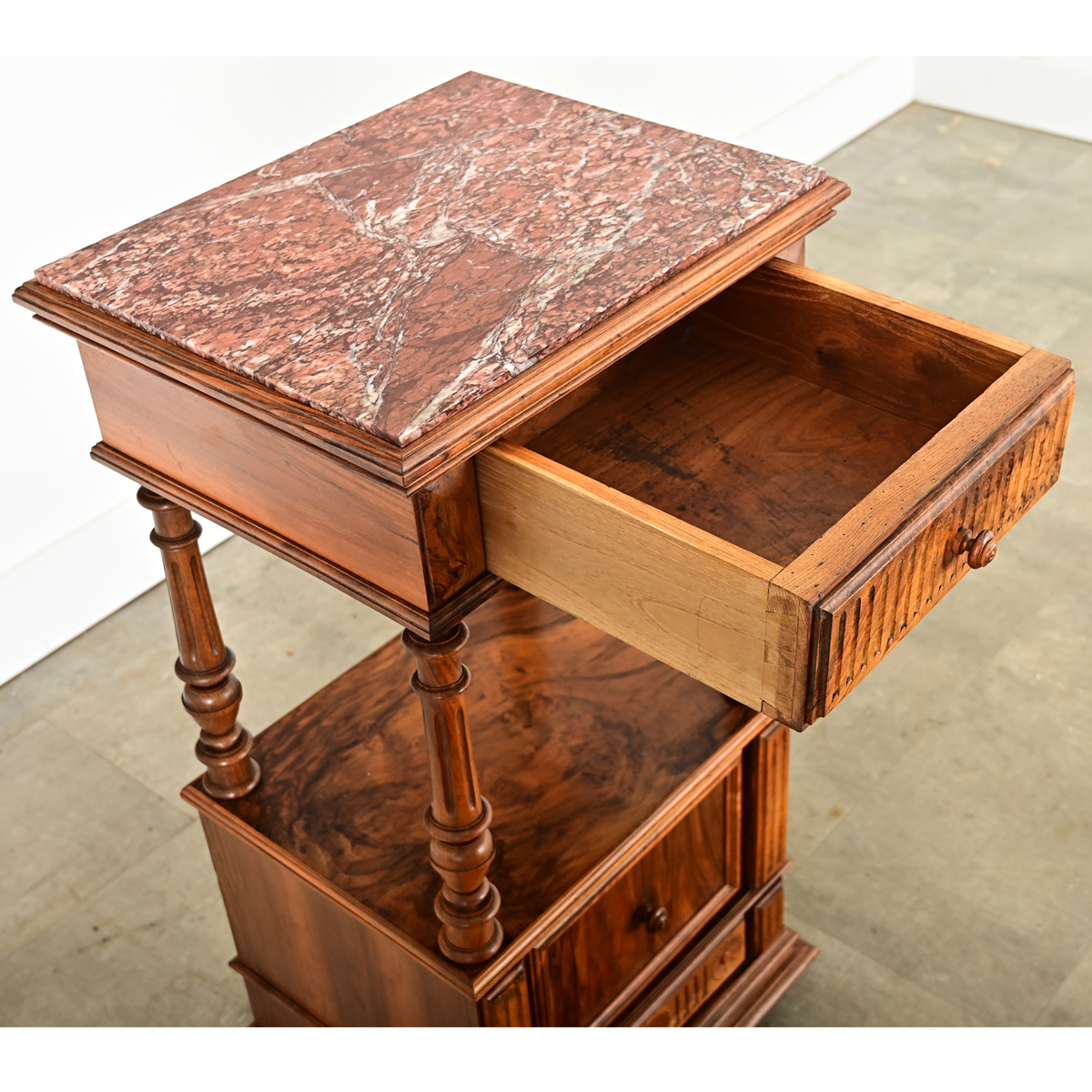 Topped with a dramatic piece of Emperador marble, this petite French occasional table from circa 1820 is adaptable to both bedrooms and living spaces. The dark brown stone is marbleized with veins of red and beige to painterly effect. Below, a stack of three shallow drawers in stunning walnut open by tiny brass knobs and are supported by four straight legs. The base is a solid plinth for additional storage and display surface area. Cleaned and polished with a French paste wax, ready to join your interior. Please view the detailed images.