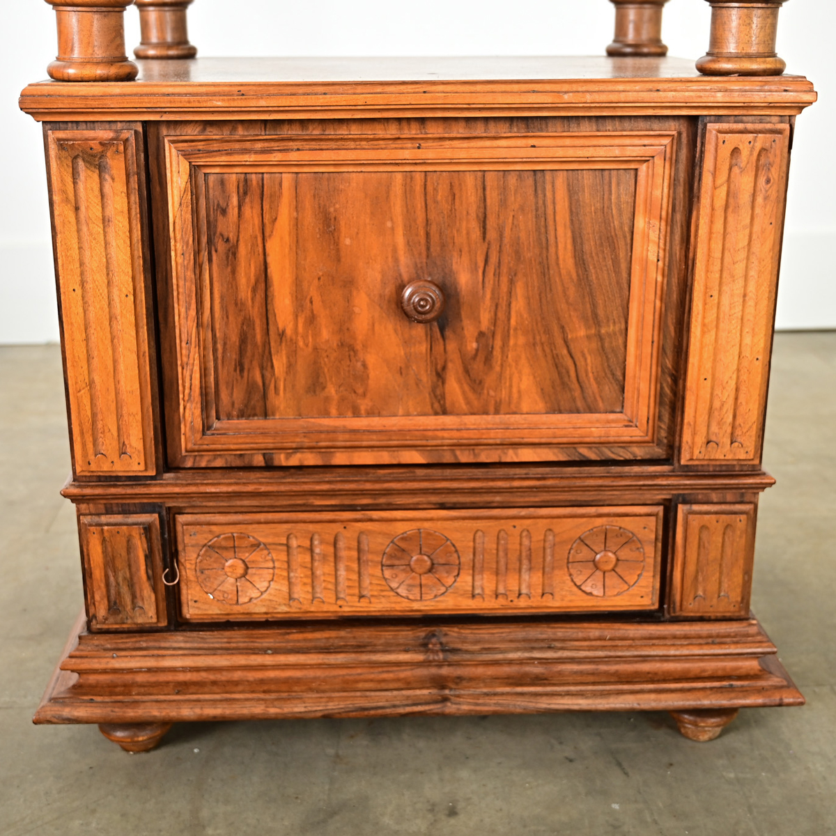 French 19th century petite bedside table with classic Empire styling that would function equally well in a powder room for unexpected, and sophisticated storage. Below the modest plank top is an overhanging frieze drawer without hardware, supported on the sides by architecturally inspired columns finished with brass capitals and bases. Concealed by a striking bookmatched door that features the expressive grain patterns of the walnut, the cabinet interior is fitted with two small shelves to organize the contents. Cleaned and polished with a French paste wax, this handsome side table is ready for your interior. Please view the detailed images to see more.