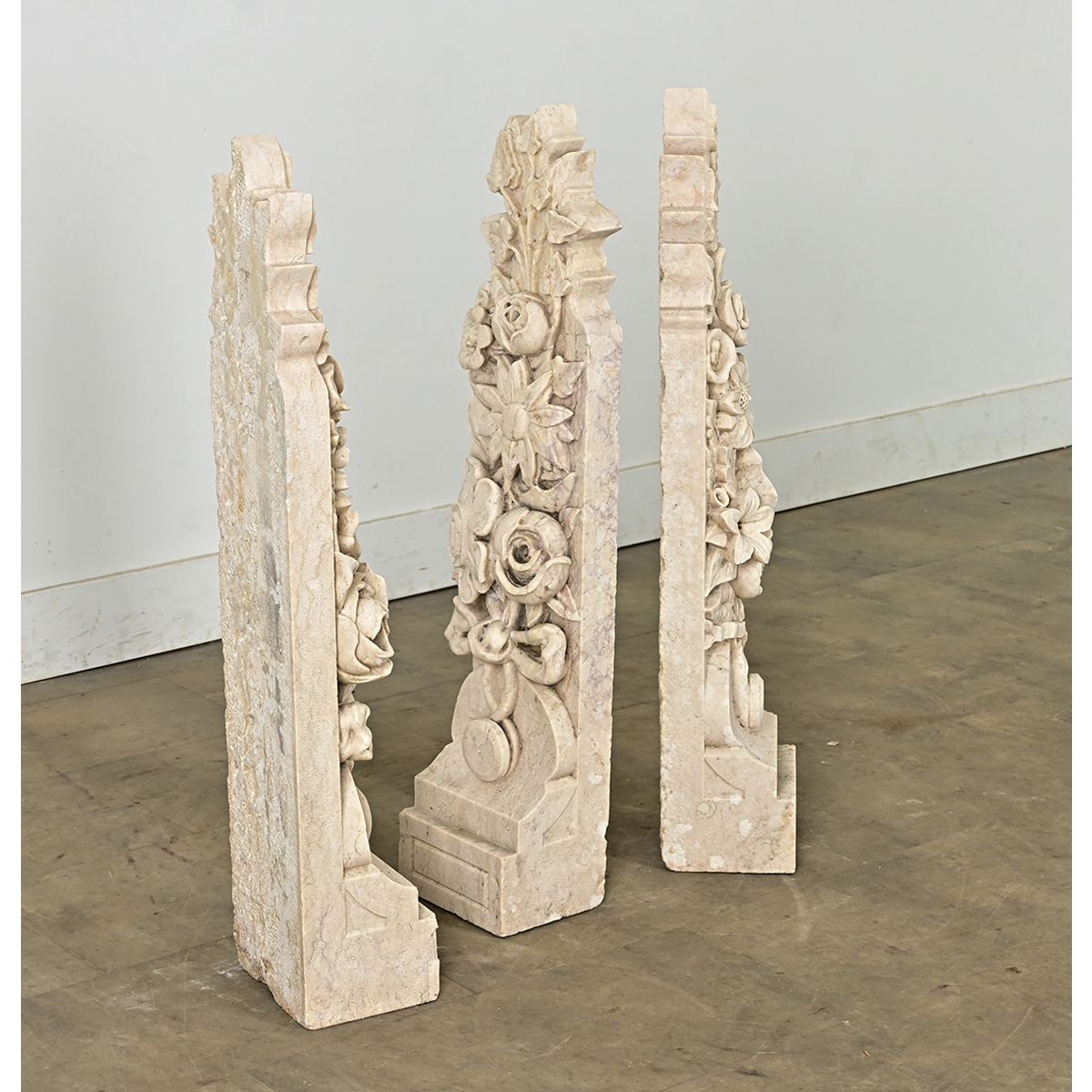 French 19th century–or earlier–ensemble of three hand-carved stone corbels. They are substantial pieces, likely used as decorative supports or architectural elements around a fireplace or softening the geometry of a roofline. It is truly extraordinary how the artist has decorated these elongated panels with naturalistic floral and leaf designs–which include roses, lilies, sunflowers, and ivy–rendered in tactile softness that belies the density of the stone. Outside of an architectural function, the grouping could be displayed in one’s home like stela from the ancient world: sculptural markers to guide the way or commemorate a significant event. Please view the detailed images to see the current condition. Sold as a set of three.