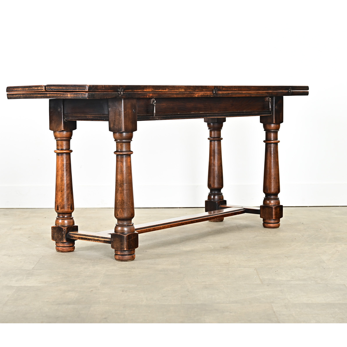 A rare, metamorphic oak table from 18th century France, appearing to be a substantial console table that easily flips open–nearly doubling in depth–to use as an occasional serving table, center table, or for dining. The handmade solid oak construction bears the dark, textural grain patterns and patina developed over nearly two centuries of time & use. Forged iron pendant pulls dangling from the table apron guide the retractable wood rails that support the side planks (like leaves) unfolding from the table top, pivoting on hand-forged iron hinges that are thoughtfully shaped as a decorative feature beyond their function. A base of four, baluster-turned legs connected by flat stretchers in an H-formation anchors the table, giving it a sense of permanence and presence in any space. Cleaned, tightened, and polished with a French paste wax, this intriguing antique table is ready to join your interior. Please view the detailed images.