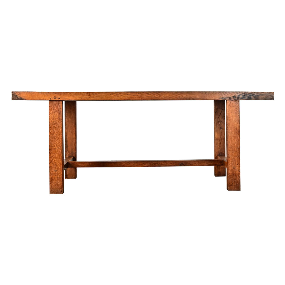 A monumental 19th century French oak dining table with unique, architectural elements in the trestle base. Impossibly heavy, the top planks are nearly 3” thick, old-growth wood including dense grain patterns and knots, all assembled with square peg joinery keeping with the organic texture. The linear boards are capped on the short ends by perpendicular planks in breadboard formation. Typical of refectory type tables, the supporting legs (two per end) are deep and wide for an interesting profile from every angle, including the massive feet on the floor. A large stretcher (51 ⅝” long) spans the distance in between the legs that will comfortably fit two dining chairs on each side. Cleaned and polished with a French paste wax, this truly remarkable dining table is ready to join your interior. Please view the detailed images.