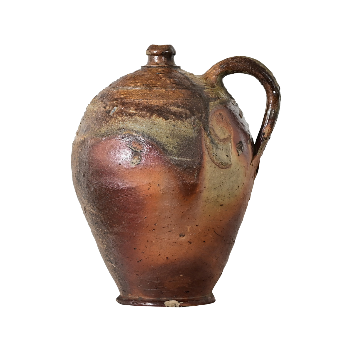 A French 19th century stoneware cruche traditionally used as a bottle or demijohn to transport and store water, oil, or wine. The hand of the potter has imparted organic variation to the form with a wabi-sabi quality of utilitarian authenticity, using luminous salt glaze which creates movement across the (uneven) surface of the bottle in nuanced shifts of color from earthy browns to mustard to the neutral greige of the clay. The bulbous vessel uses a small loop handle to aid in pouring liquid out of the narrow mouth at the top that would have been corked. Note the interesting medallion on the front of the neck, with fleur de lis icon to underscore the distinctly French origins. For the modern interior this work of ceramic art is a wonderful artifact of culinary history to add to one’s collection or kitchen décor. Please view the detailed images to see the current condition.