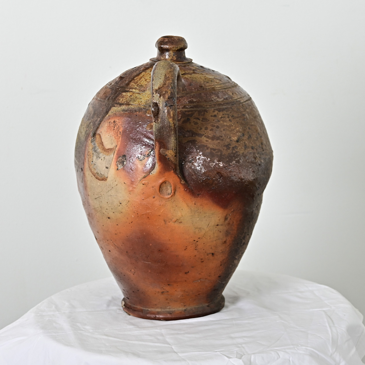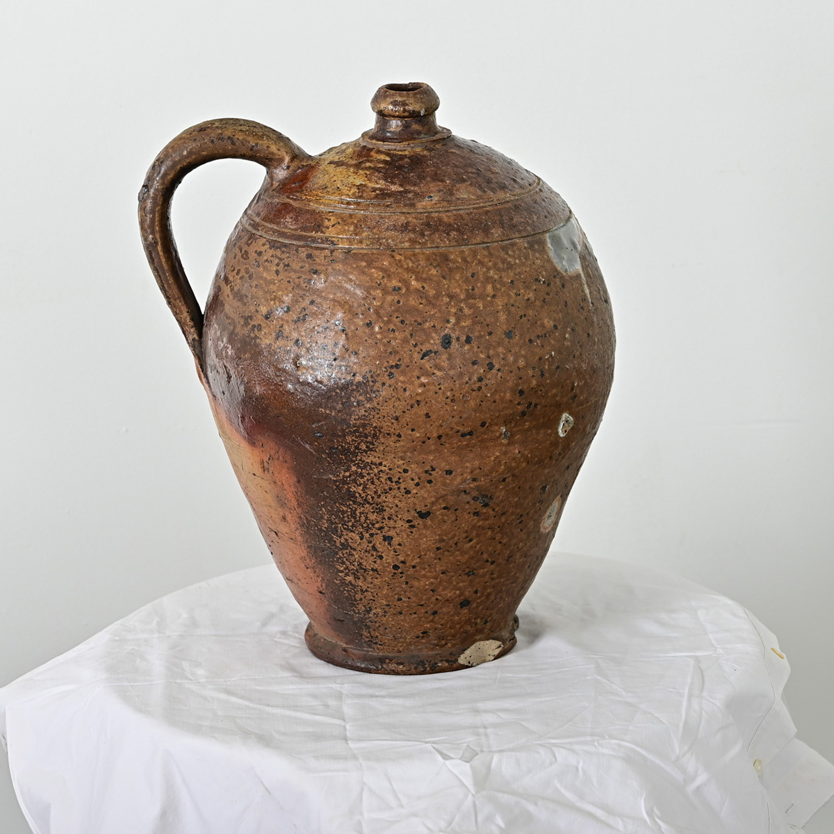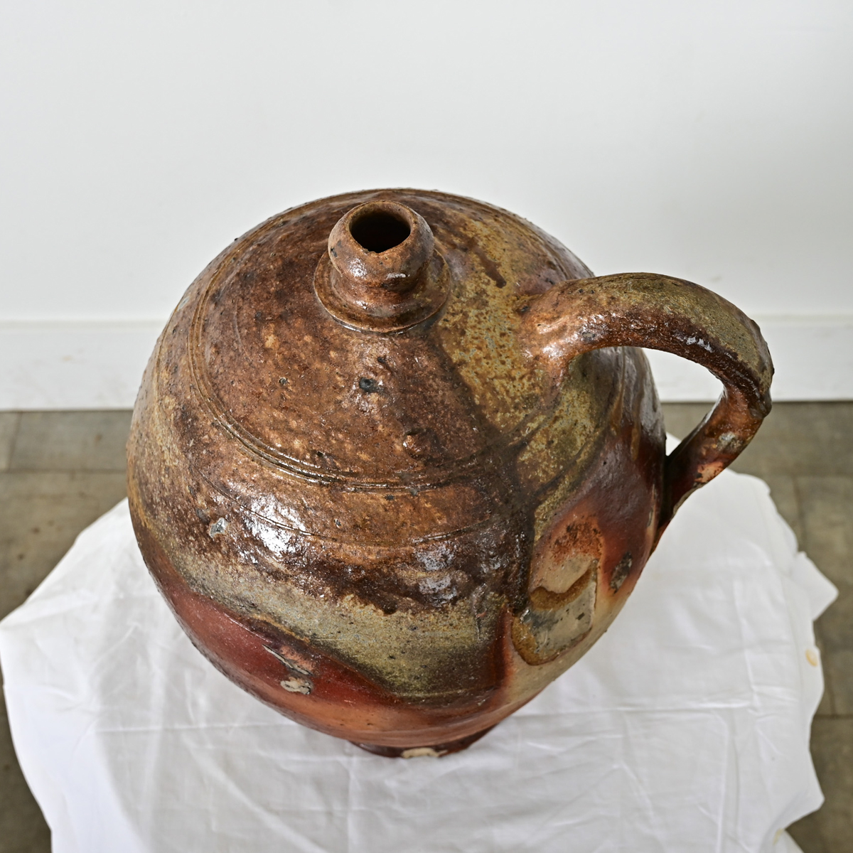 An enormous French 19th century stoneware cruche traditionally used as a bottle or demijohn to transport and store water, oil, or wine. The hand of the potter has imparted organic variation to the form with a wabi-sabi quality of utilitarian authenticity, using a salt glaze which creates movement across the (uneven) surface of the bottle in dramatic shifts of color from deep, earthy browns and reds to the neutral tan of the stoneware clay. The bulbous vessel uses a single handle to aid in pouring liquid out of the narrow mouth at the top that would have been corked. For the modern interior this work of ceramic art is a wonderful artifact of culinary history to add to one’s collection or kitchen décor. Please view the detailed images to see the current condition.