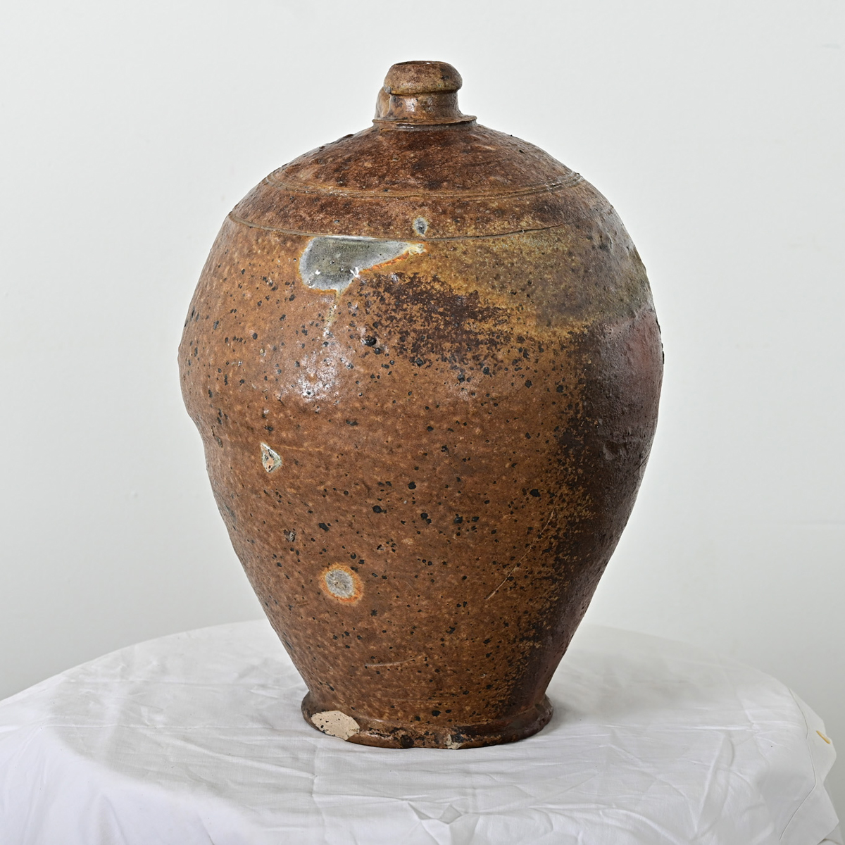 A French vintage glazed stoneware confit-type pot with lid and a pair of handles to help lift the substantial vessel. This utilitarian Provincial jar would have been used to store and preserve foods (like a confit or rillette) as there is a small hole near the base. Glazed in a ruddy blend of earthtones over the ribbed body, it becomes a unique work of ceramic art on its own; the wabi-sabi organic quality of the pot in desert hues of brown and neutral glazes lends historic authenticity to any interior. The generous scale remains functional as a storage jar in the kitchen, arranging flowers and greenery, or simply to appreciate as an artifact of culinary history. Please view the detailed images to see the current condition as there are multiple chips along the base and lip. Marked with a small “10” near the lip.
