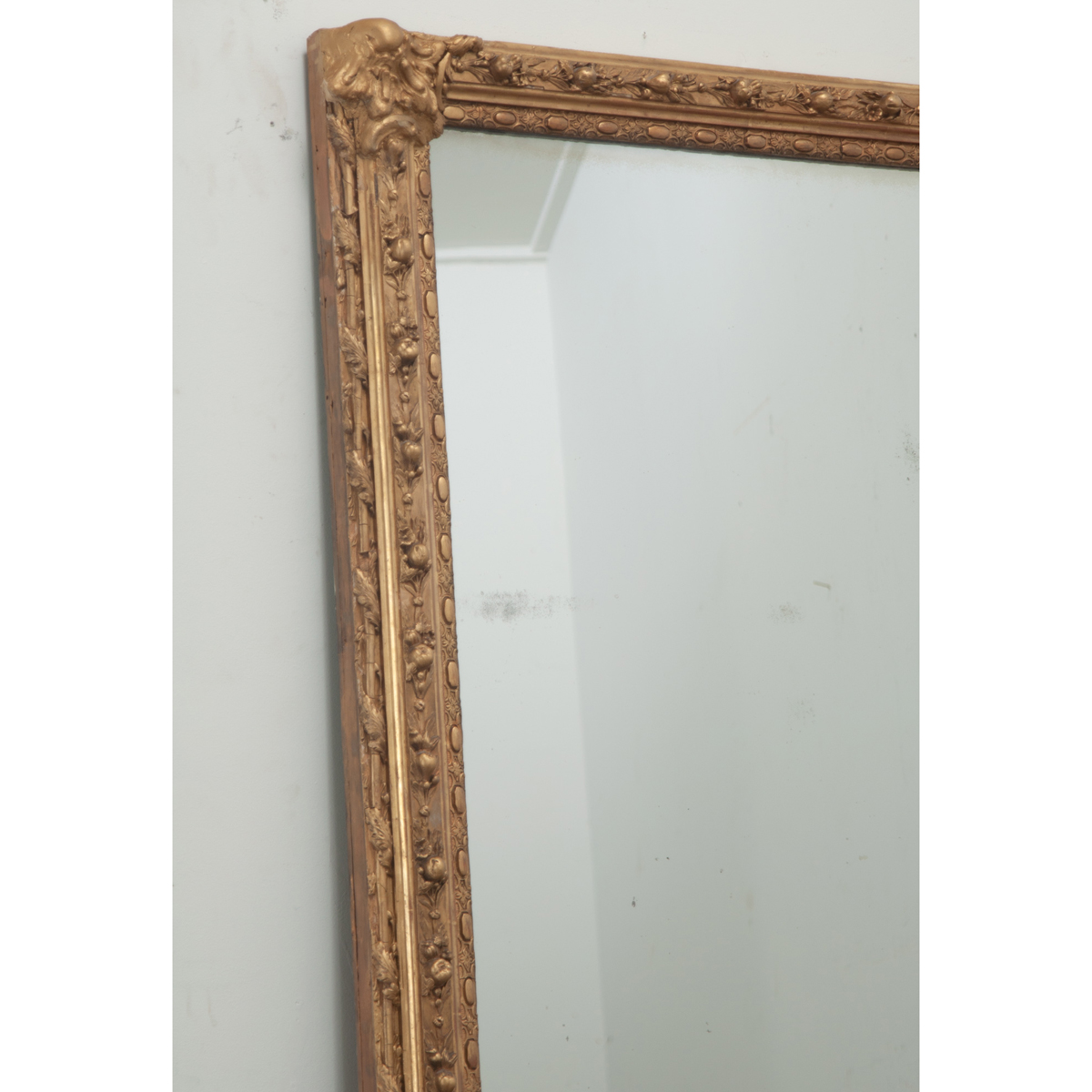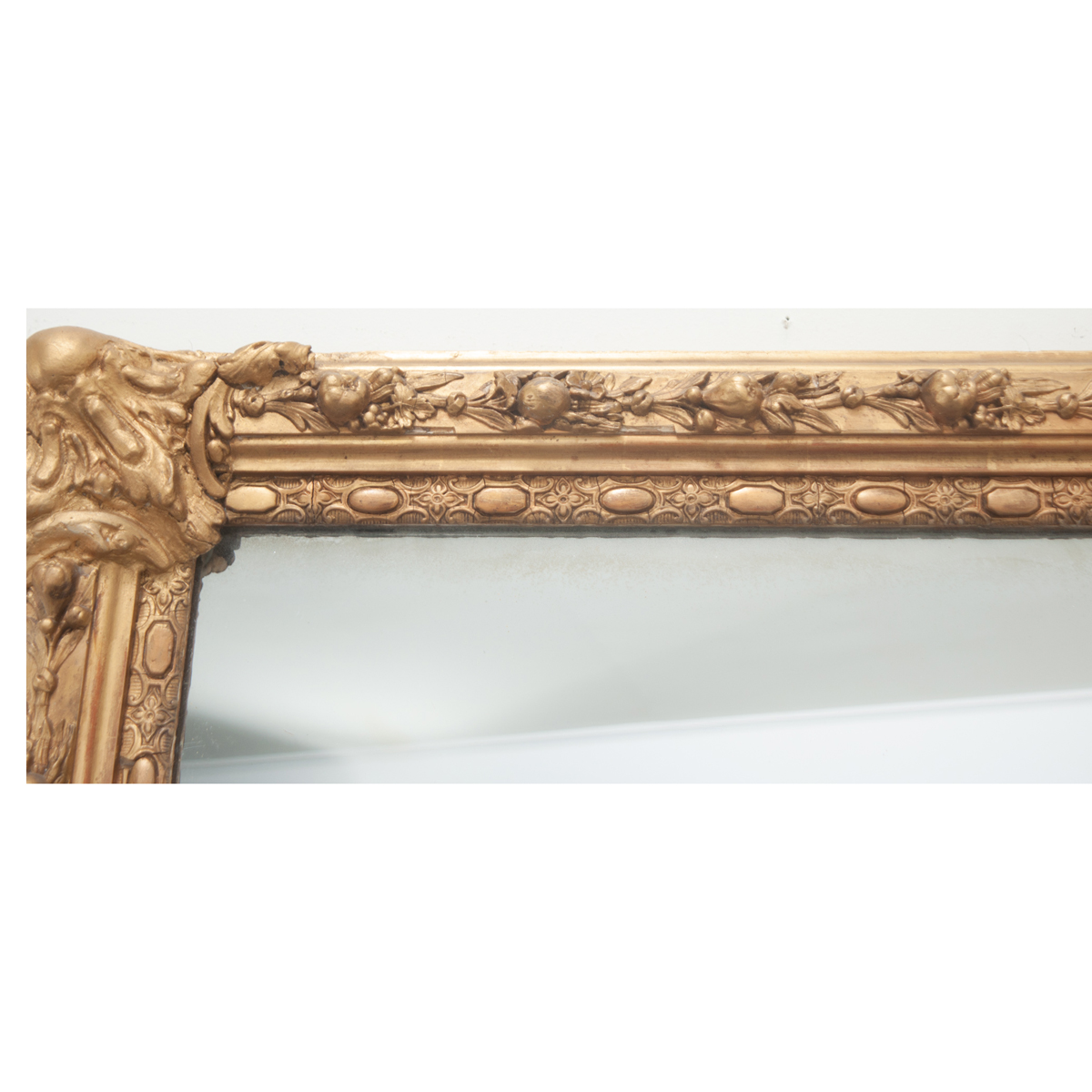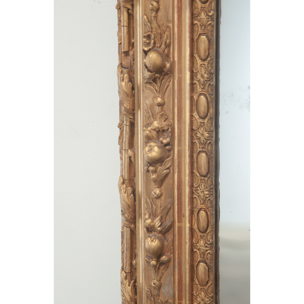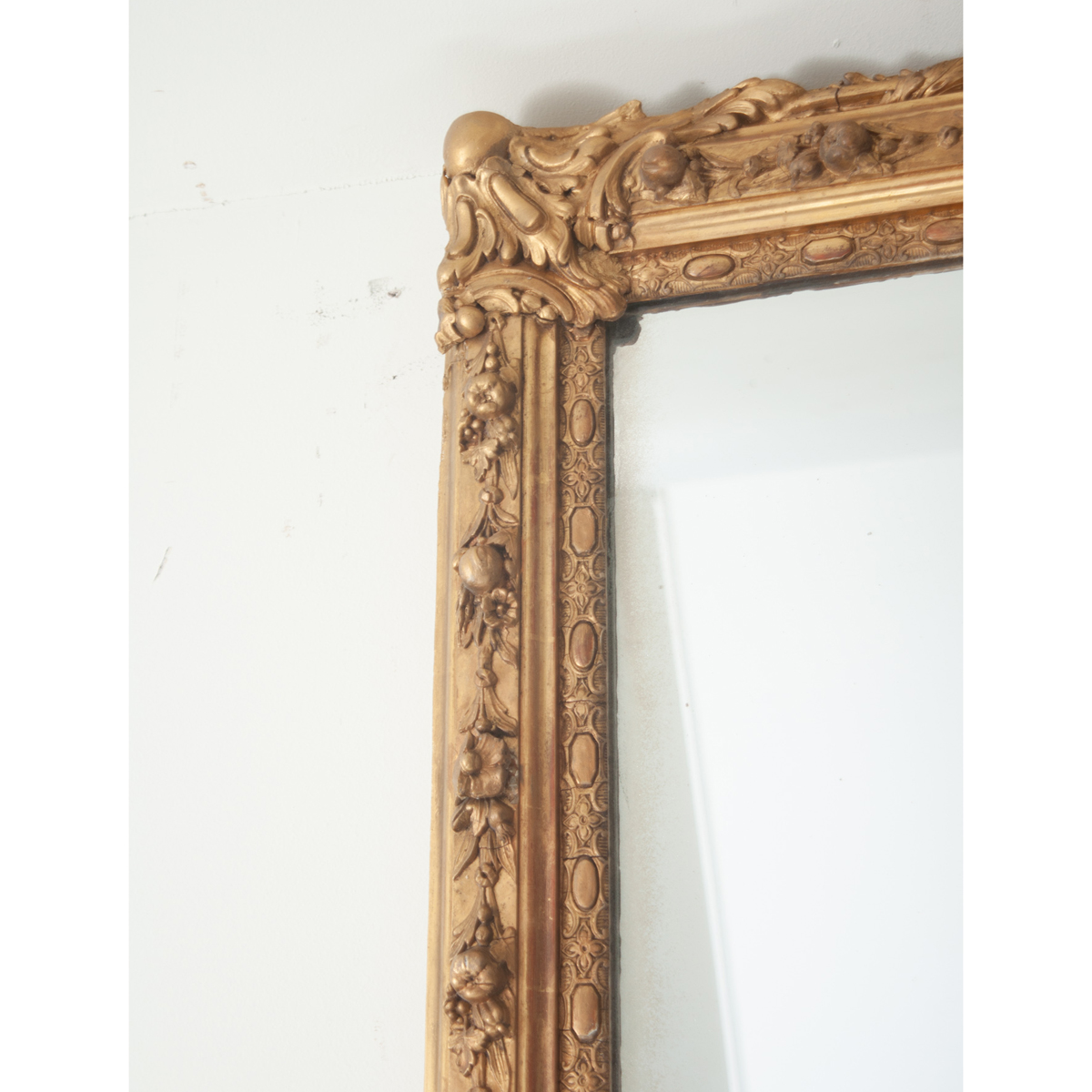 A symmetrical molded and gilt wood French mirror. This mirror has impressive moldings of fruits, flowers, twisting laurel leaves and other classical French motifs that all make this a dazzling mirror frame. Over the years the frame has had some repairs which are especially noticeable in each of the corners. The original mirror plate has some light foxing and crystallization has settled along the bottom of the mirror plate. Be sure to view the detailed images of this wonderful 19th Century mirror.