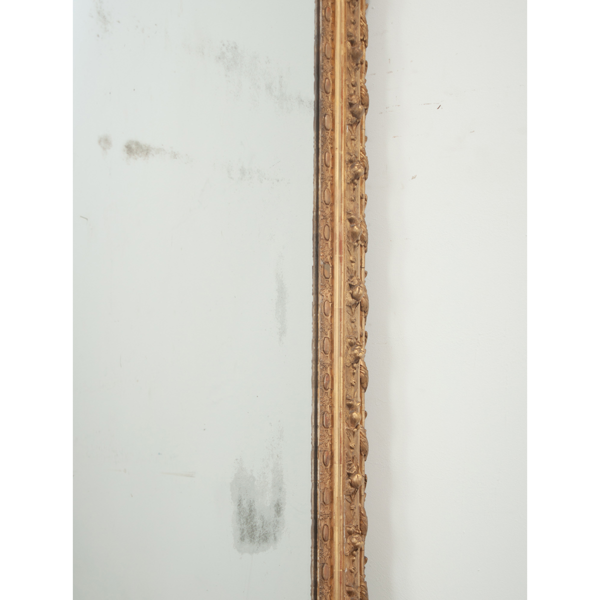 A lovely gilt mirror from 19th century France, the strong proportions of the Louis Philippe style arch-top frame are emphasized by slender foliate and beaded molding around the original mirror plate. Delicate foxing of the glass appears in a translucent haze of random spots, drawing the viewer in for a closer look. This antique mirror is the perfect scale to make a big impact in any room: over a mantel or hung on the wall. Please view the detailed images to see more.