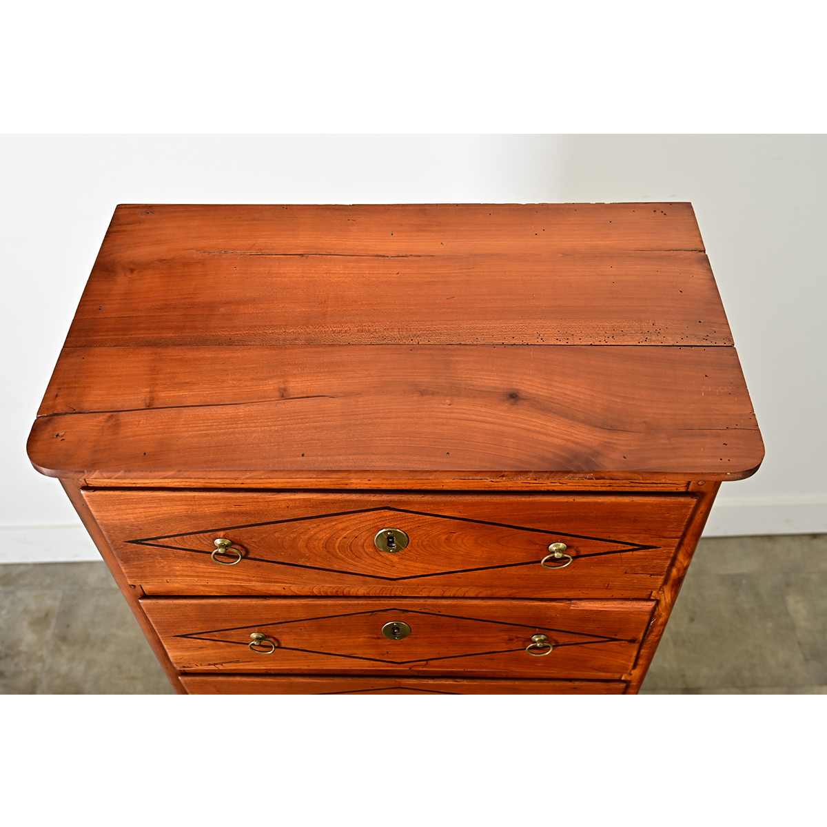 French 19th century Directoire style fruitwood chest of drawers, appearing to be a semainier except with six drawers instead of the requisite seven. Below the modest wood top and rounded corners is a stack of six drawers inlaid with ebonized diamond shapes for graphic contrast to the glowing fruitwood. Note the bottom drawer is actually double-height with two diamonds to blend quietly in with the upper five. Sometimes referred to as a lingerie chest, the height and narrow proportions would elegantly host the clothing or personal effects of nearly anyone–suiting a range of transitional decorating tastes. All drawers glide with ease using simple brass ring pulls to open, no key is present to operate the locks. Short, cabriole legs lift the case from the floor. Cleaned, tightened, and polished with a French paste wax–ready for your interior. Please view the detailed images to see the current condition.