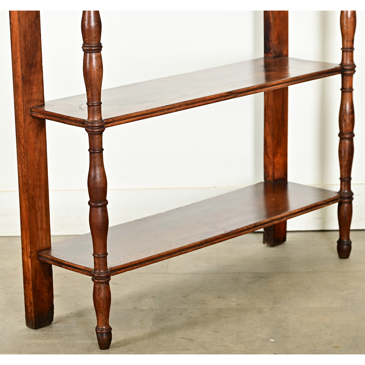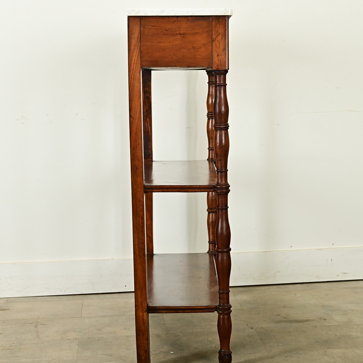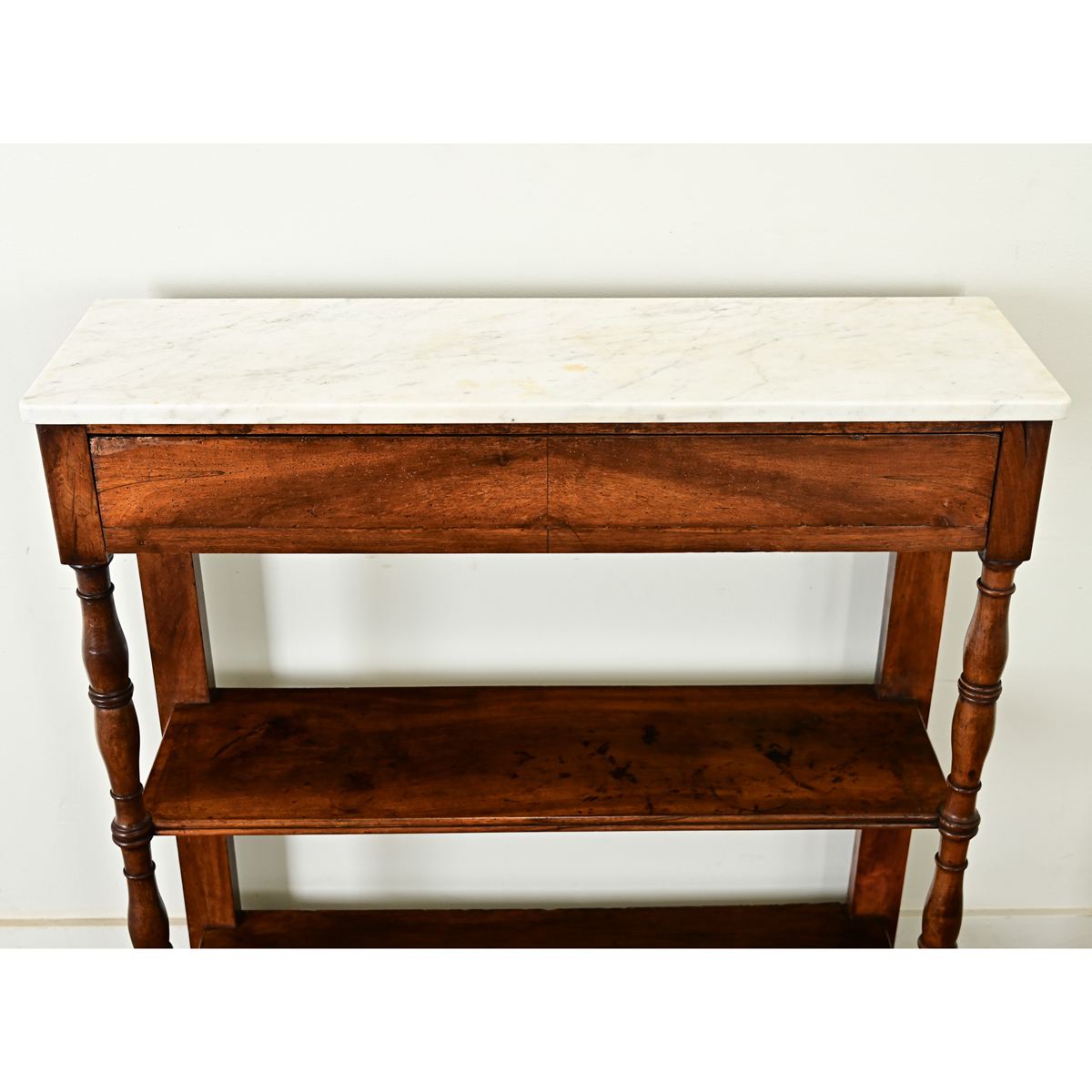 A French 19th century Louis Philippe-style walnut étagère, crowned with a white marble top. The translucent white stone has soft gray veining under light patination and interspersed with pale orange discoloration. It rests on a wide drawer, free of hardware. Two narrow shelves are raised by elegant turned legs that continue up each front side, whereas the rear legs are sturdy, square posts. The design is a handsome and practical alternative to a console table, offering both display and storage where space is limited. Cleaned and polished with a French paste wax, ready for your interior. Please view the detailed images.