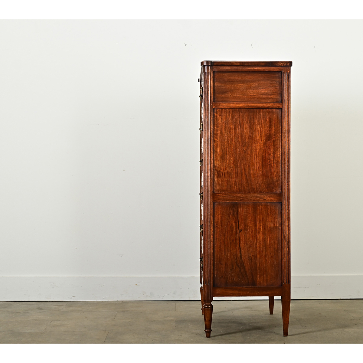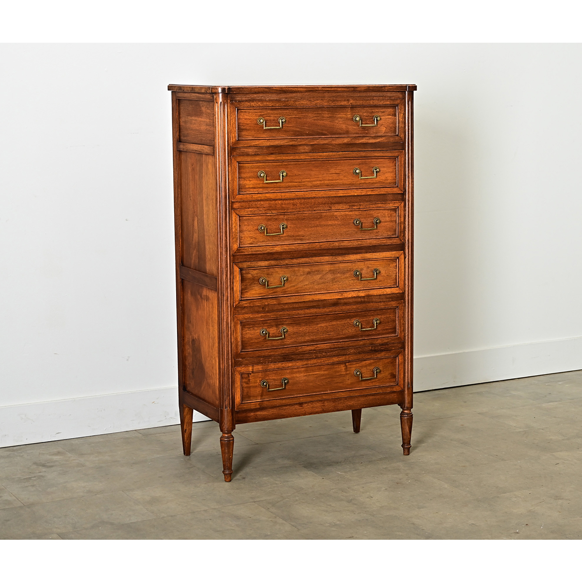 French 19th century Louis XVI-style walnut chest of drawers, almost a semainier except with six drawers instead of the requisite seven. Sometimes referred to as a lingerie chest, the height and narrow proportions would elegantly host the clothing or personal effects of nearly anyone suiting a range of transitional decorating tastes. Below the modest wood top and turreted corners is a stack of six paneled drawers using simple bail pulls to open and are free of any locks. Fluted pilasters accentuating the height terminate at the floor in turned, tapering feet. Cleaned, tightened, and polished with a French paste wax–ready for your interior. Please view the detailed images to see more.