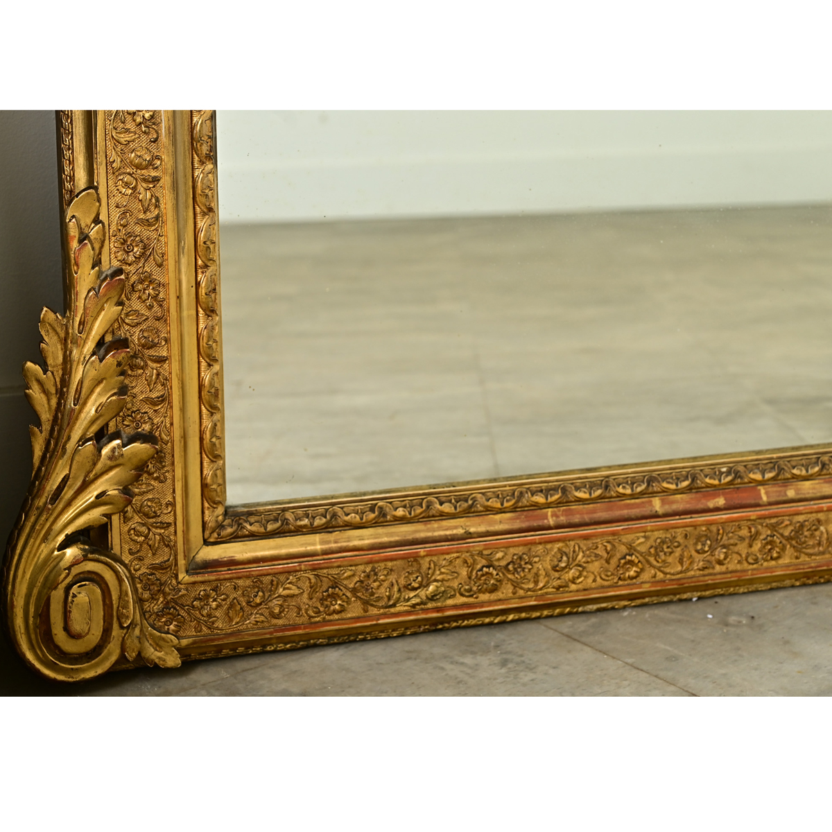 A dazzling French gold gilt mirror carved in the 19th century, packed with sculptural detail using elements of Rococo and Empire themes yet distinctly original. Mounted on the curved upper edges of the enormous frame–like epaulets on a shoulder–are two fierce gryphons carved with thoughtful detail–their wings morphing into acanthus as an articulation of the foliate motifs in the mirror frame. Distinct sections of molding alternate between intricate floral garlands, smooth routed edges, and classic architectural patterns. Coiled acanthus at the base unfurl toward the top, mirroring the top carvings in harmonious balance of scale. The original mirror plate is in good condition with spots of foxing across the surface and some loss of the foil in the bottom right. Please view all the detailed images.