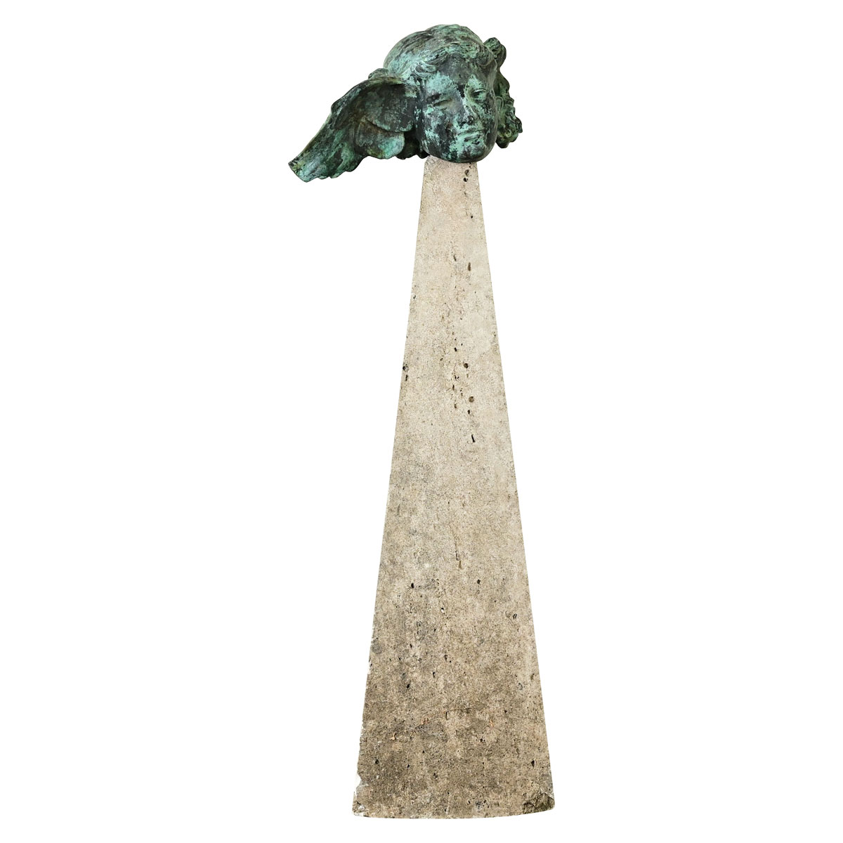 An early 20th century cast bronze bust of Hypnos, the Greek god of sleep, copied from the remains of an original sculpture made circa 300BC now at the British Museum in London. The most striking feature is the wing–like a dove–protruding from his right temple, a fantastic appendage to represent his supernatural powers in spite of the gentle face that wears an expression of dreamy tranquility. The metal has oxidized to a wonderful turquoise verdigris, partially obscuring the exquisite details of his wing and hair. He is mounted on a contemporary base of reconstituted stone shaped to an elongated pyramid with some patination. This Classical work of art will delight in any garden or interior. Please view the detailed images to see more of this unique sculpture.