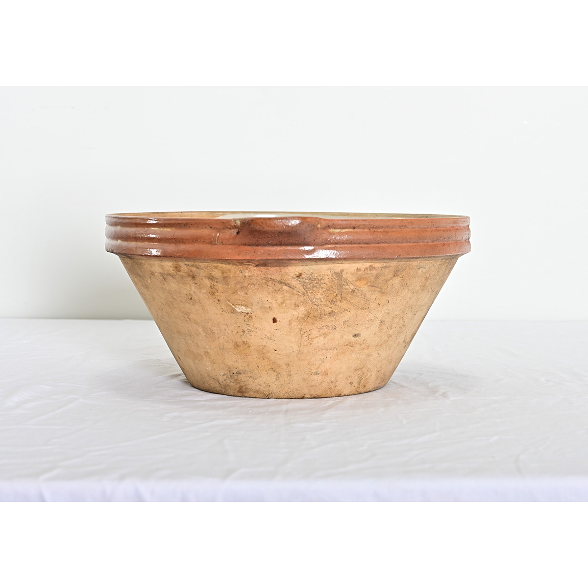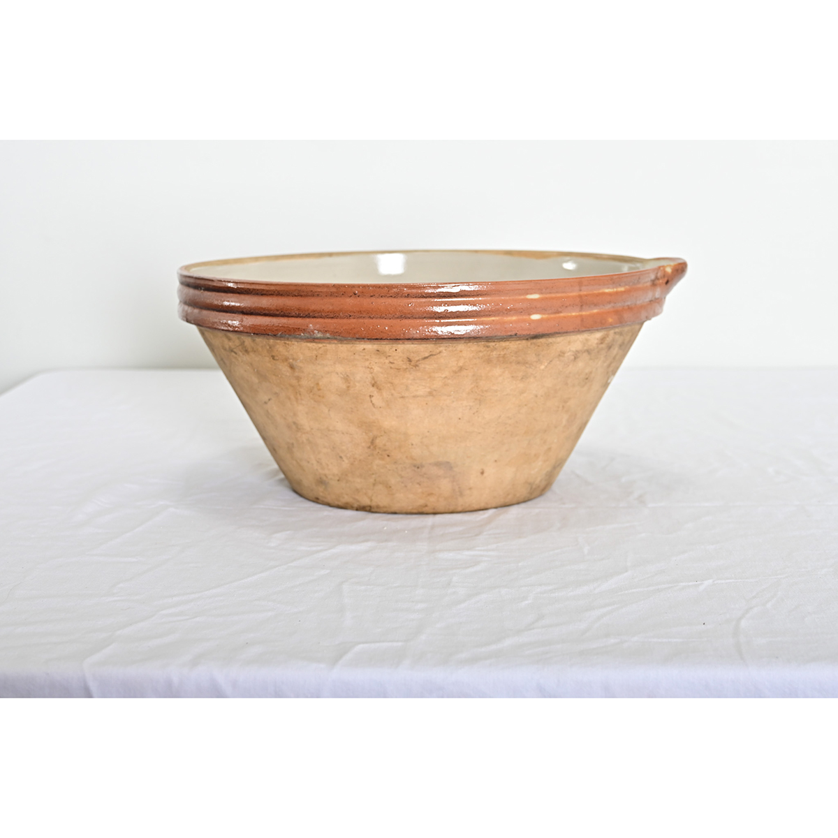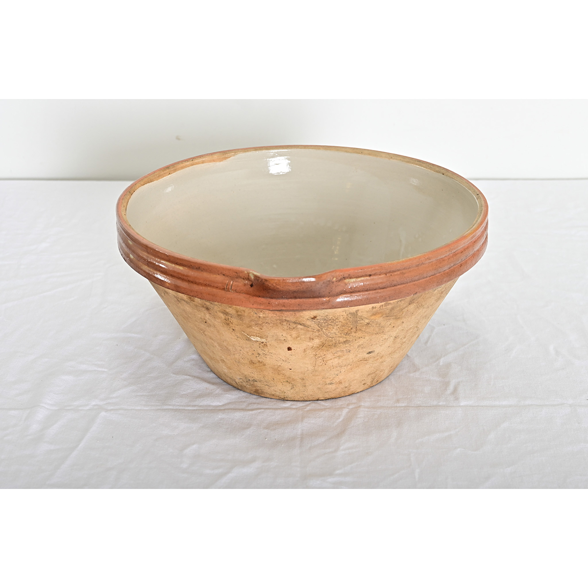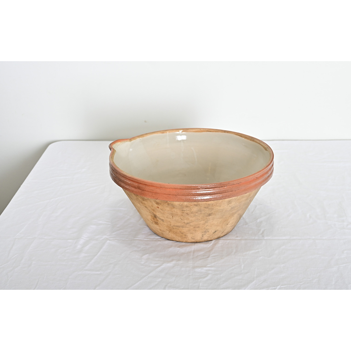 A lovely glazed terra cotta cream bowl from early to mid-20th century France. This earthen bowl–also known as a pancheon–was used to stand milk while the cream separates, then the cream is then poured off the top bythe small spout found on the pot’s lip. This antique bowl is in excellent condition, appropriately glazed a translucent chalk-white on the interior and a soft matte exterior. The glaze was not only a decorative choice but prevented the milk from being absorbed by the terra cotta. Today, this wonderful bowl would make a fantastic fruit bowl or decorative object around the home. Please view the detailed images to see the current condition.