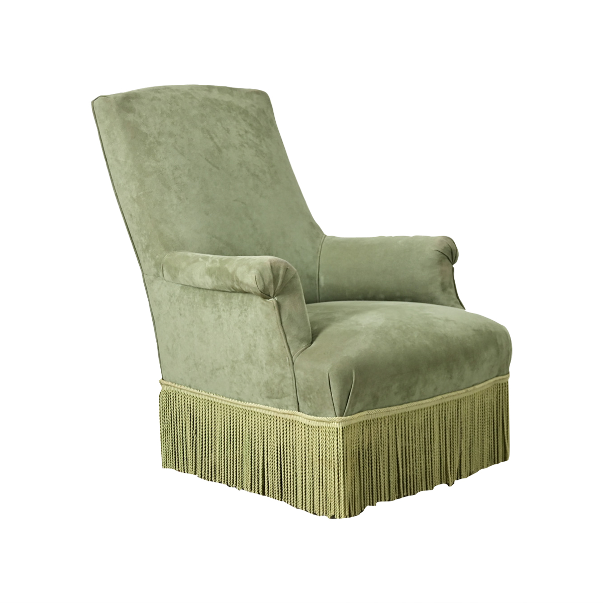 A fabulous French early 20th century arm-or lounge-chair in the style of Napoleon III, with a tall seatback of gentle recline rising above petite rolled arms. The current upholstery is of a sage green, velvety ultrasuede with coordinating bullion fringe skirting the floor as a glamorous and practical touch to dress up any seating area. Internal stuffing remains a comfortable firmness, however there are some areas of wear to the fabric. Please view the detailed images to see the current condition.