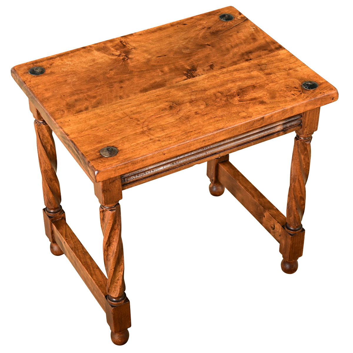 A delightful French walnut footstool, 20th century, with ribbon-twist or barley twist carving on the turned legs. The rectangular top is formed with two planks, studded at each corner with forged iron nails, resting on a carved apron, very similar to joint stools of two centuries prior. The ensemble is elevated by four turned legs carved with a twisting, fluted design and connected in pairs by plain side stretchers. With its light patina and lovely grain pattern, this stool–whether for seating or as a small side table–will bring a touch of authenticity to any space. Cleaned and polished with French paste wax, ready for your interior. Be sure to view the detailed images for a closer look.
