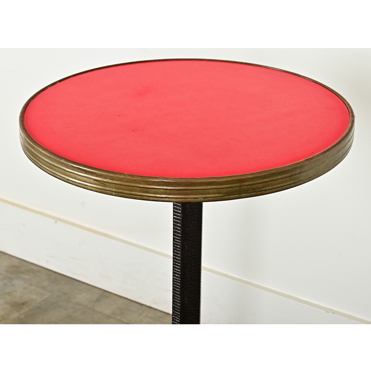 An exciting little bistro, or drinks table from France of the Art Deco period. Within a brass belt around the table top, sits a very practical Formica surface in cardinal red. The cast iron pedestal is hexagonal in shape, covered with repetitive divots and notches on each side. At the tripod base, each foot is stepped like classic Deco architecture. Evidence of red pigment can be seen in the dark metal, otherwise the iron appears in its natural color. A tiny foundry hallmark can be found on the base. Please view the detailed images.