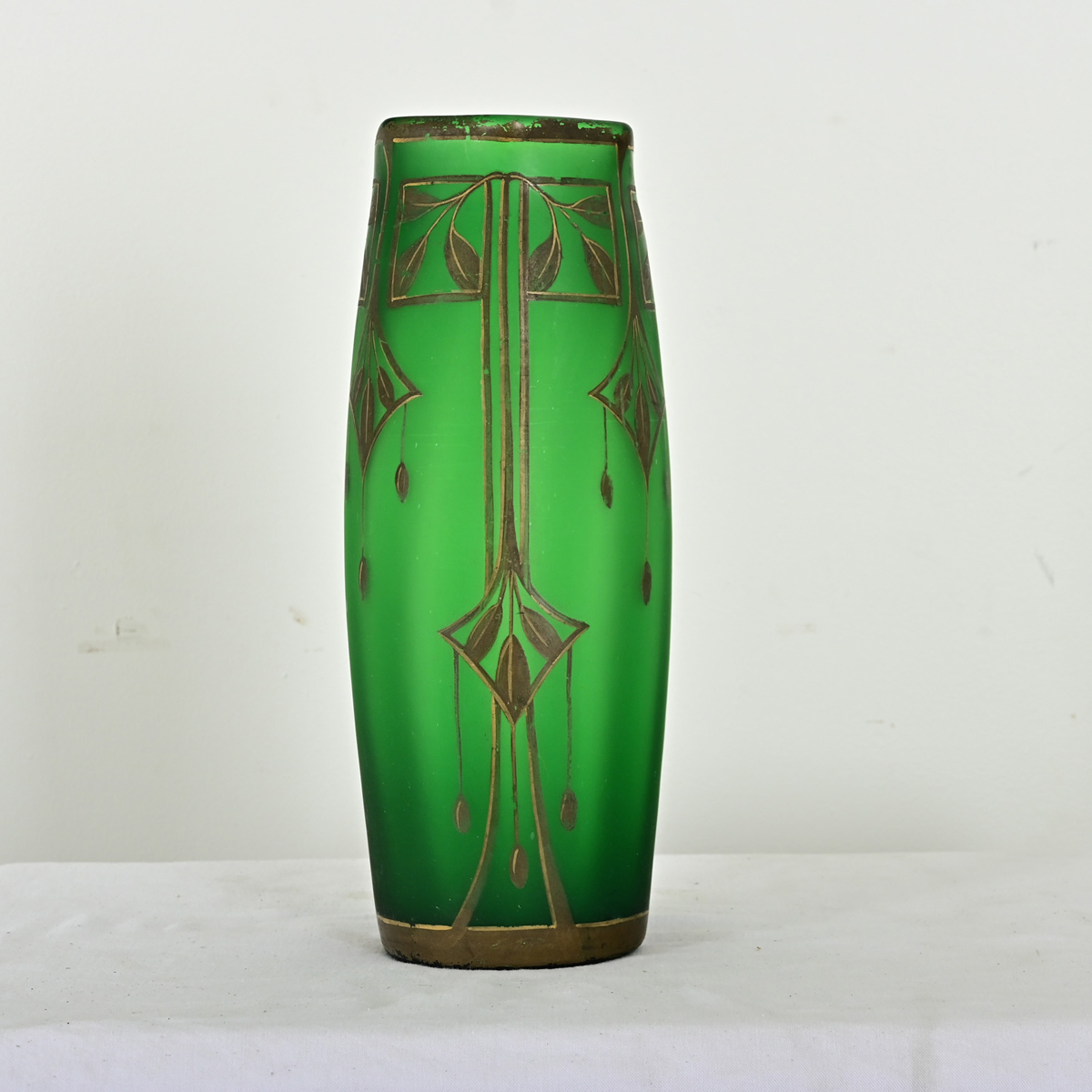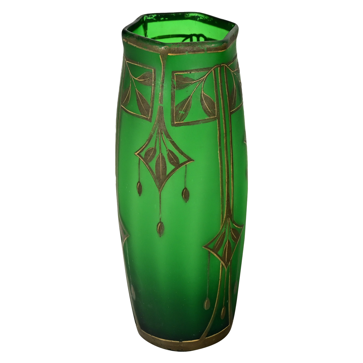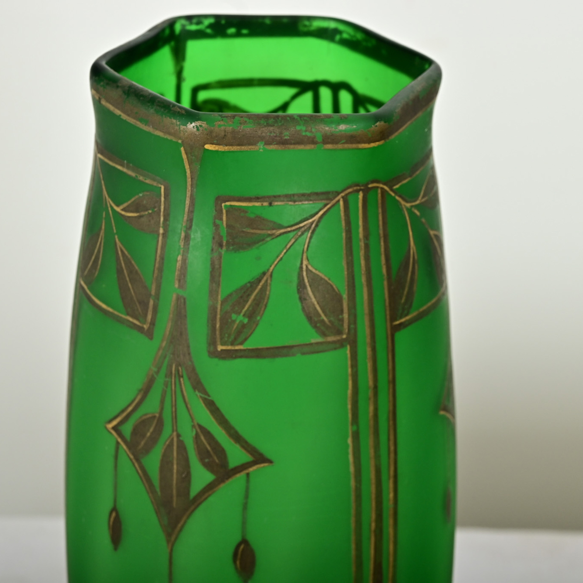 Painted on the deep emerald-green glass of this hexagonal vase are elongated gilt leaves and foliate motifs in classic Art Deco style, which are a nice contrast to the velvety texture of the glass. Please view the detailed images to see the current condition.