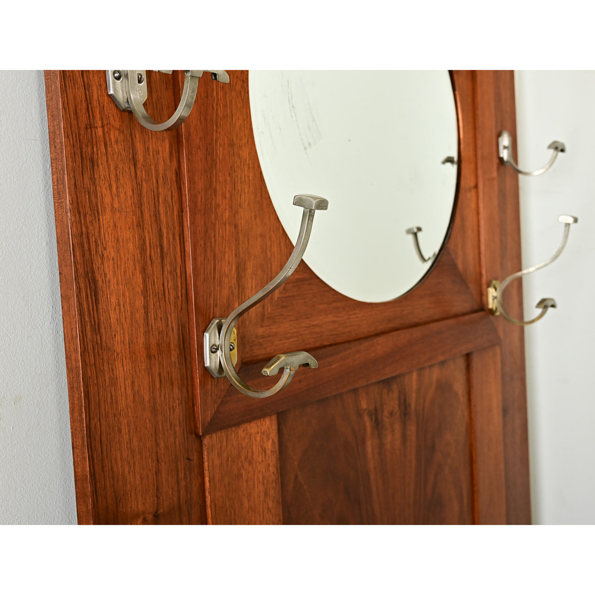 A dazzling Art Deco style hall tree made in France circa 1930 that will be a great addition to any entryway or antique collection. This handsome storage piece is made out of solid mahogany wood arranged in a paneled design with six metal hanging hooks at the top, and one hanging bar lower on the base. Surrounded by the six hooks at the top is the original, round beveled mirror adding to the functionality and overall appeal of this gorgeous hall tree. Recently refinished to bring out the natural luster of the wood; please view the detailed images to see more.