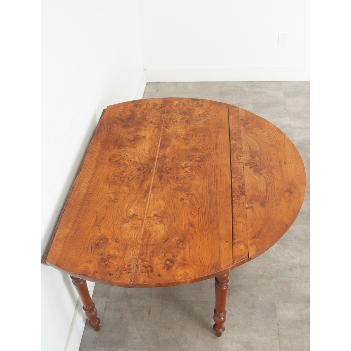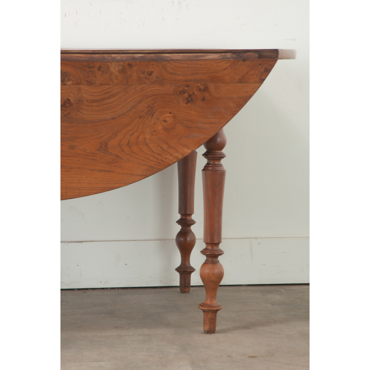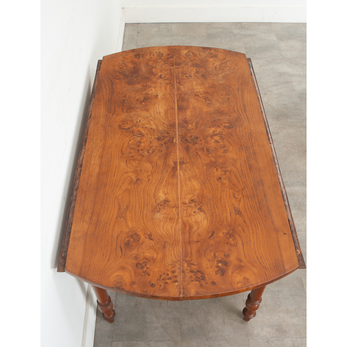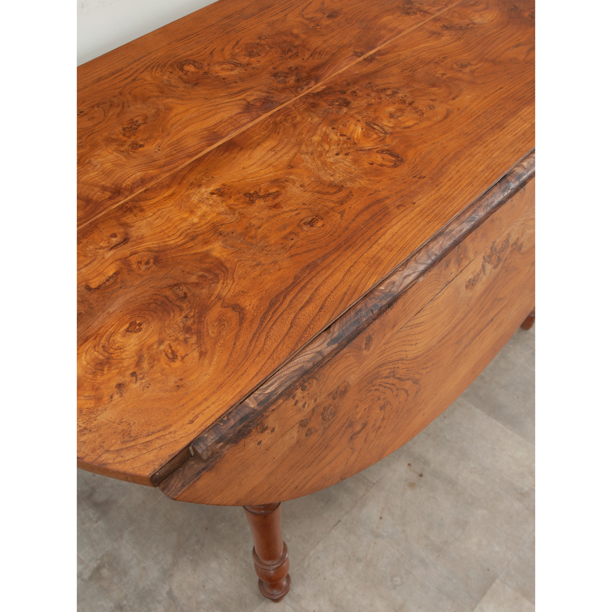 This versatile French drop leaf table is made of burled fruitwood and can be used as a console or a dining table. The top sits over four turned legs which add character and visual interest from every angle. Drop leaves are supported with sliding rails that are tucked into the apron when not in use. This table has been cleaned and polished with a French paste, ready for your immediate use. Be sure to view the detailed images to see the current condition of this antique table.