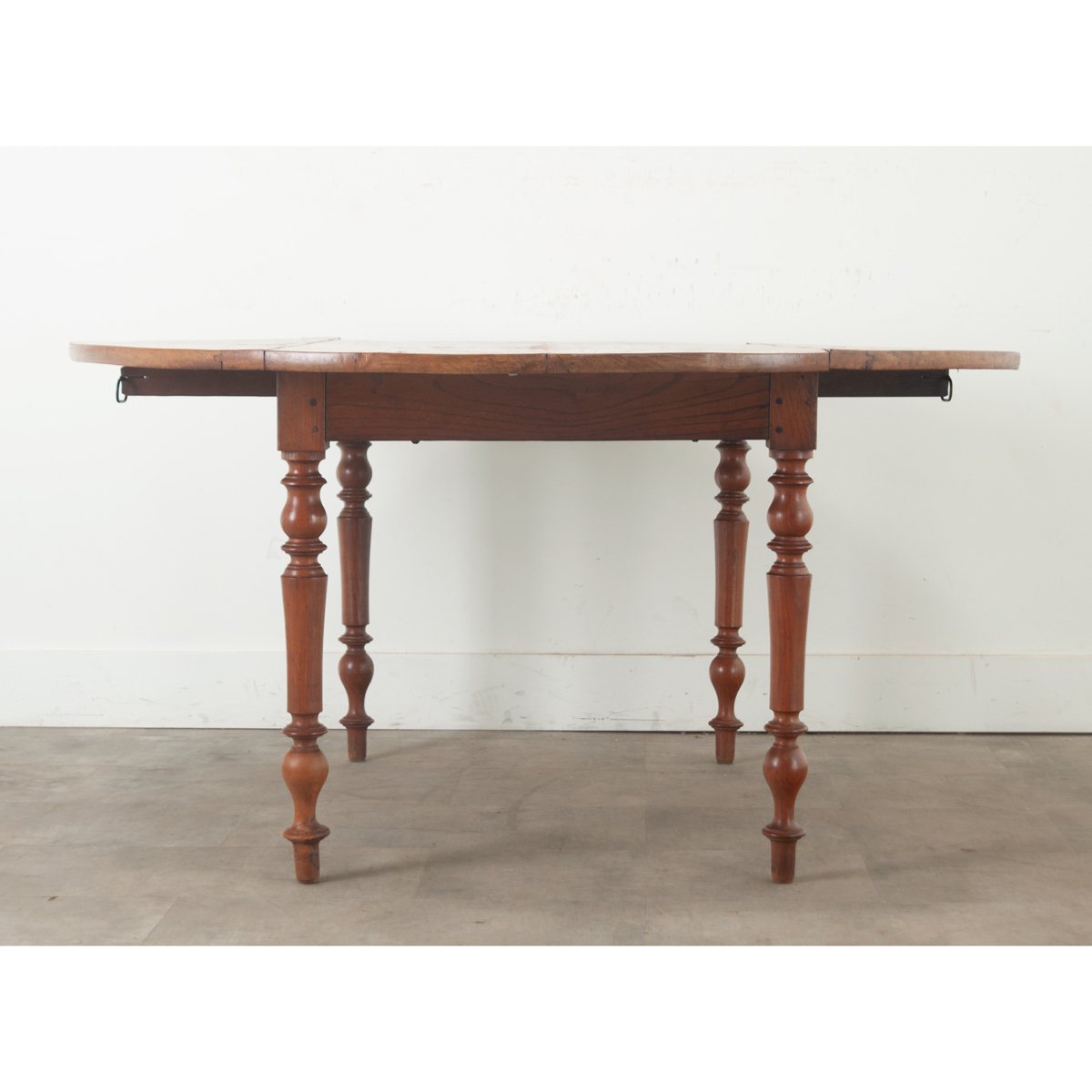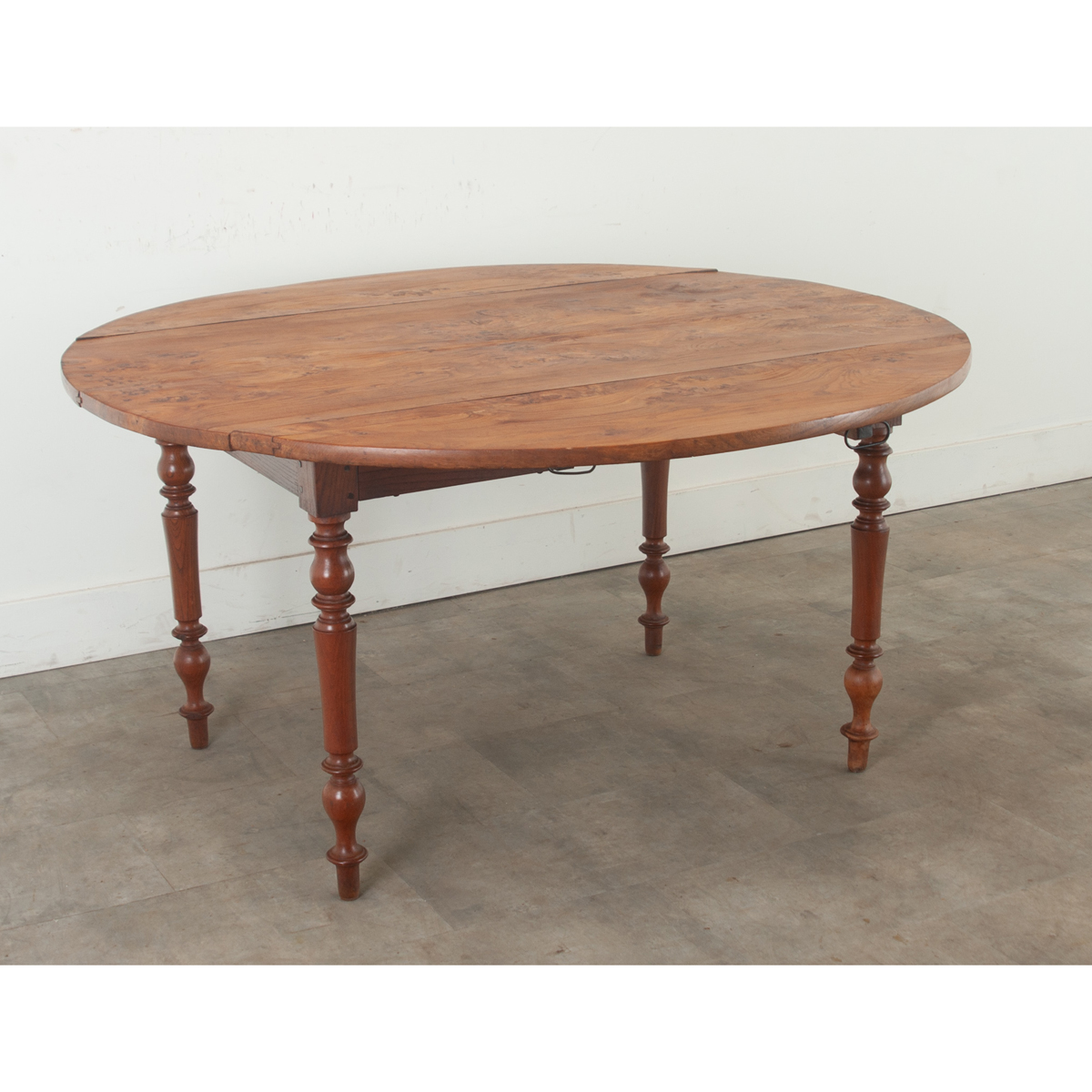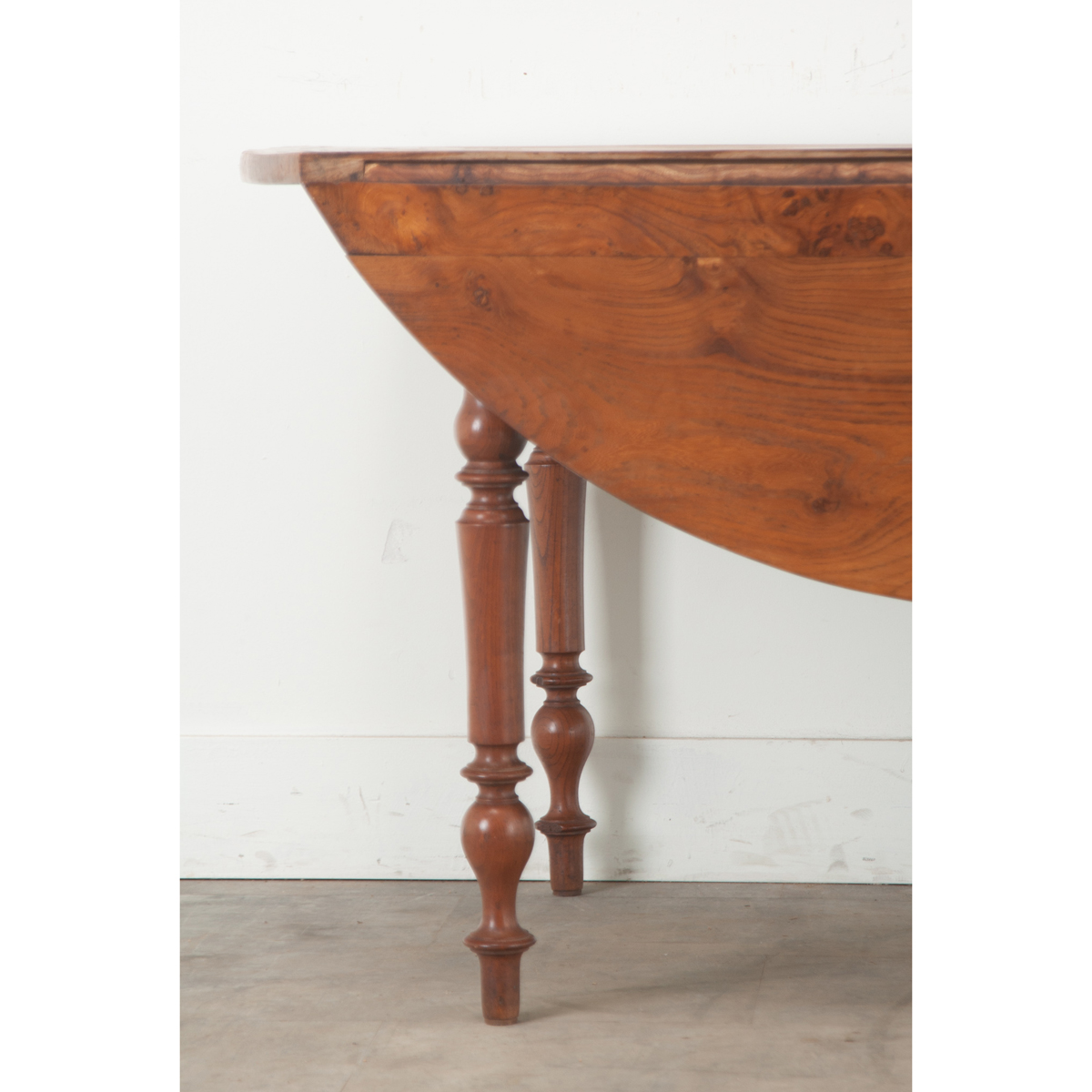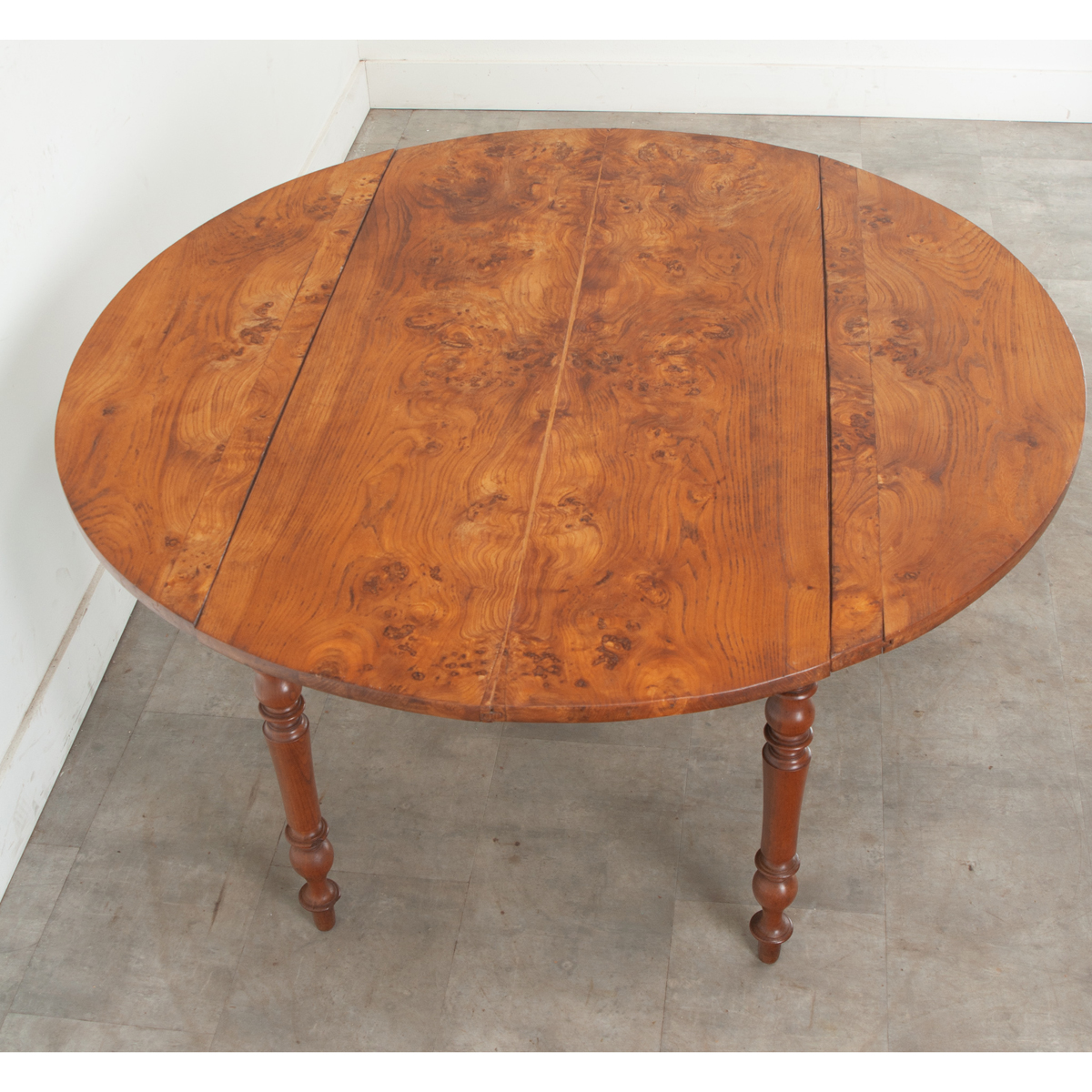 This versatile French drop leaf table is made of burled fruitwood and can be used as a console or a dining table. The top sits over four turned legs which add character and visual interest from every angle. Drop leaves are supported with sliding rails that are tucked into the apron when not in use. This table has been cleaned and polished with a French paste, ready for your immediate use. Be sure to view the detailed images to see the current condition of this antique table.
