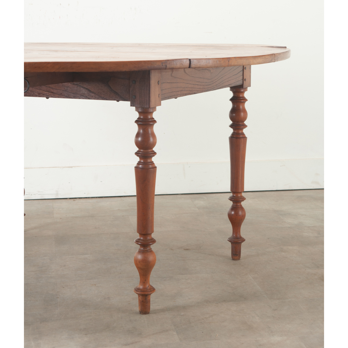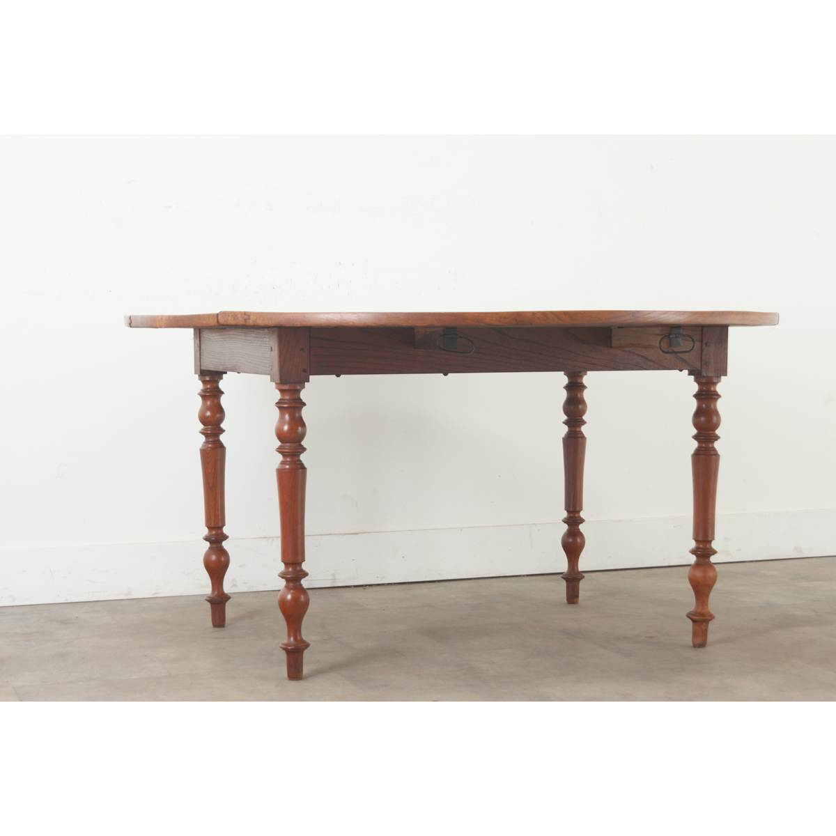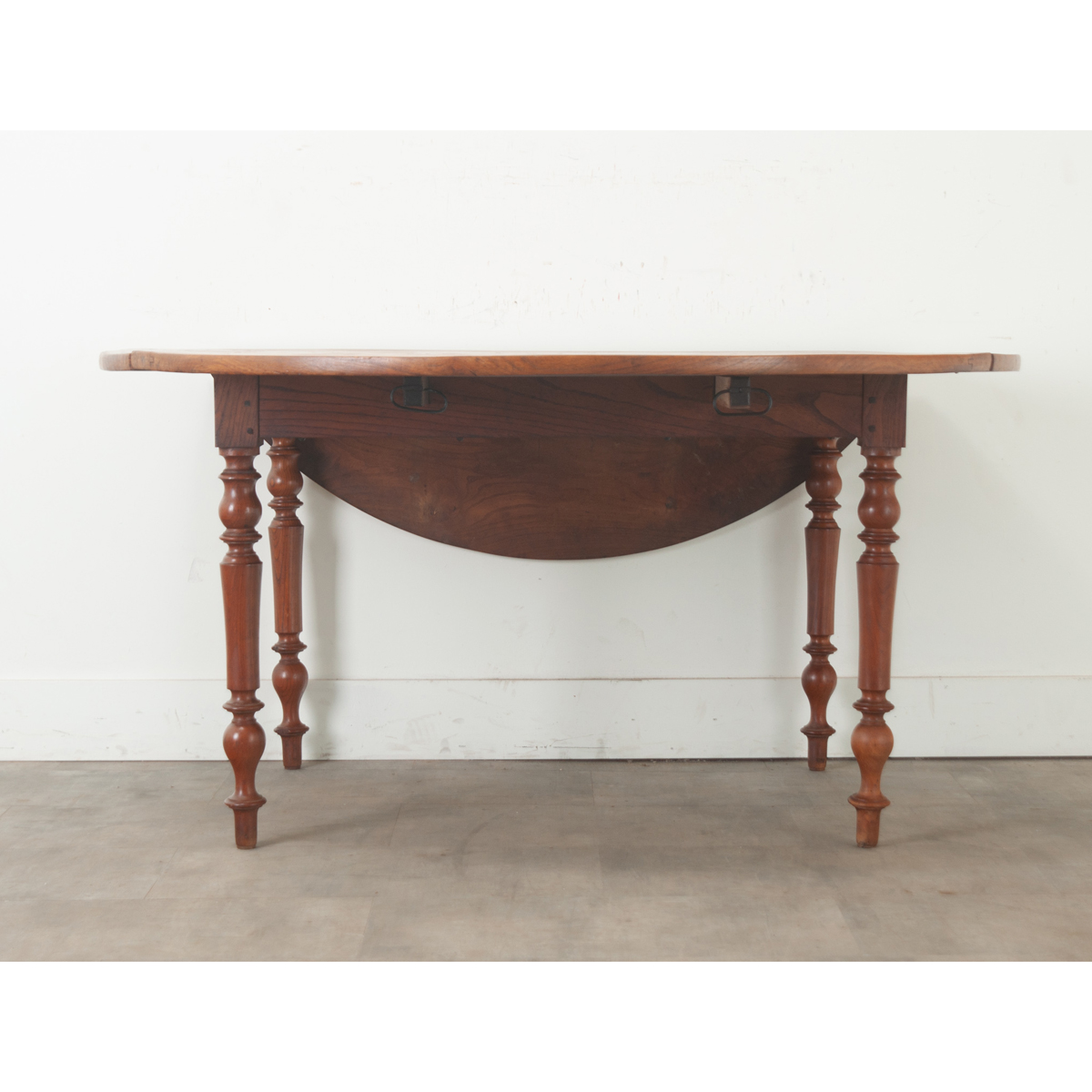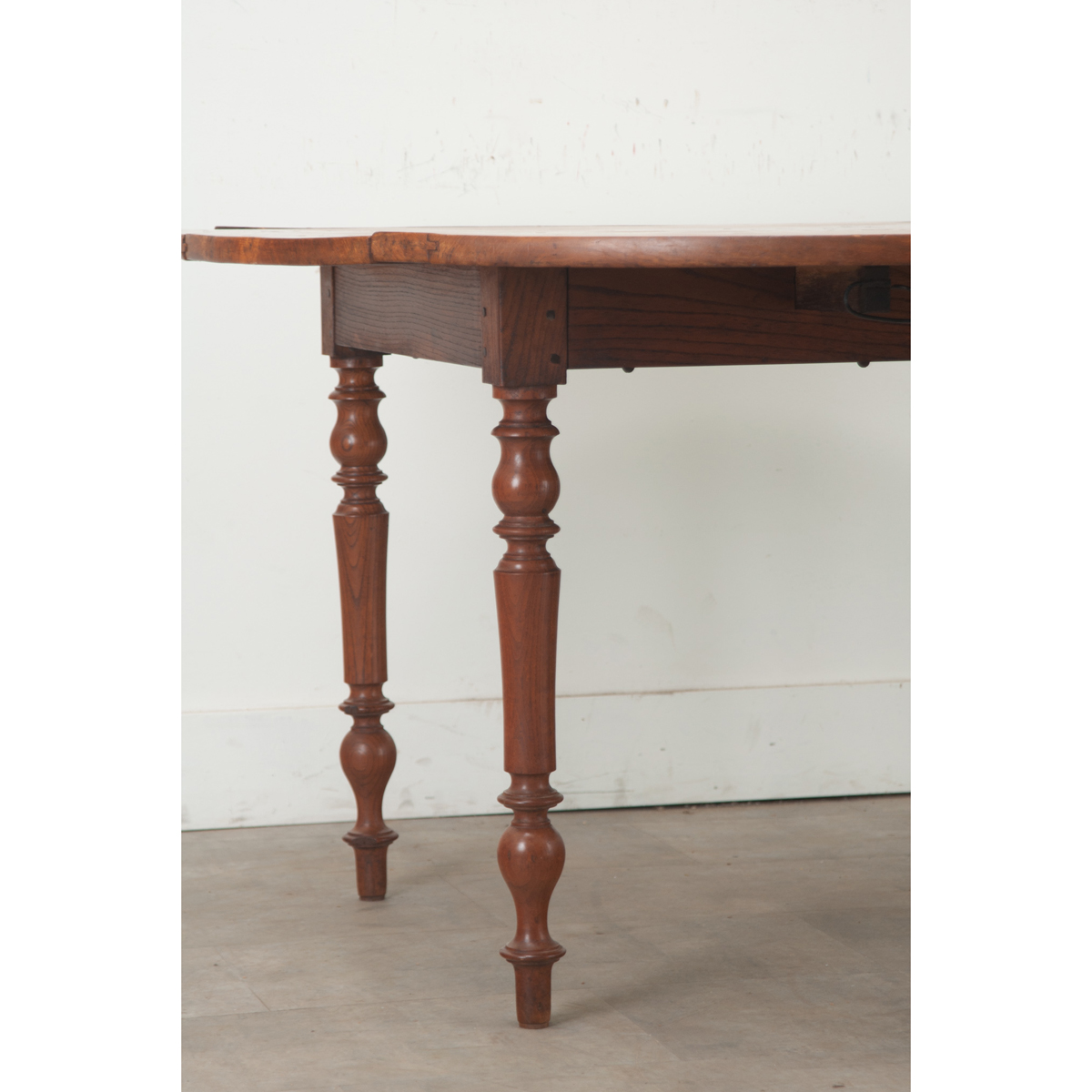 This versatile French drop leaf table is made of burled fruitwood and can be used as a console or a dining table. The top sits over four turned legs which add character and visual interest from every angle. Drop leaves are supported with sliding rails that are tucked into the apron when not in use. This table has been cleaned and polished with a French paste, ready for your immediate use. Be sure to view the detailed images to see the current condition of this antique table.