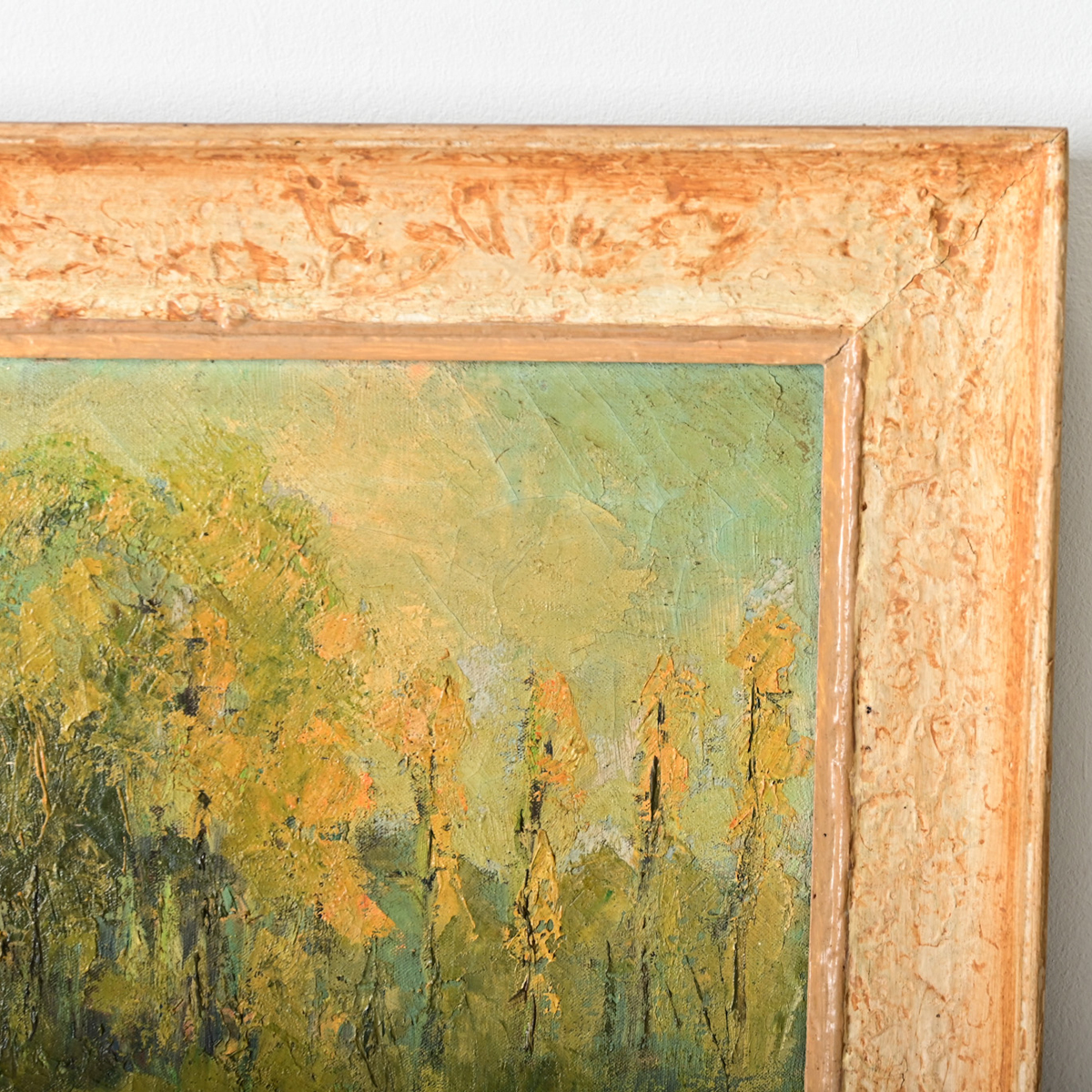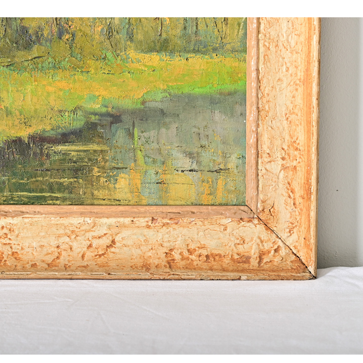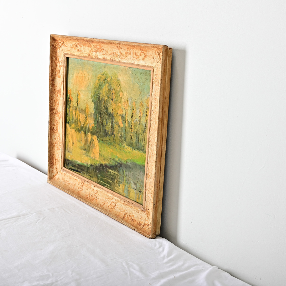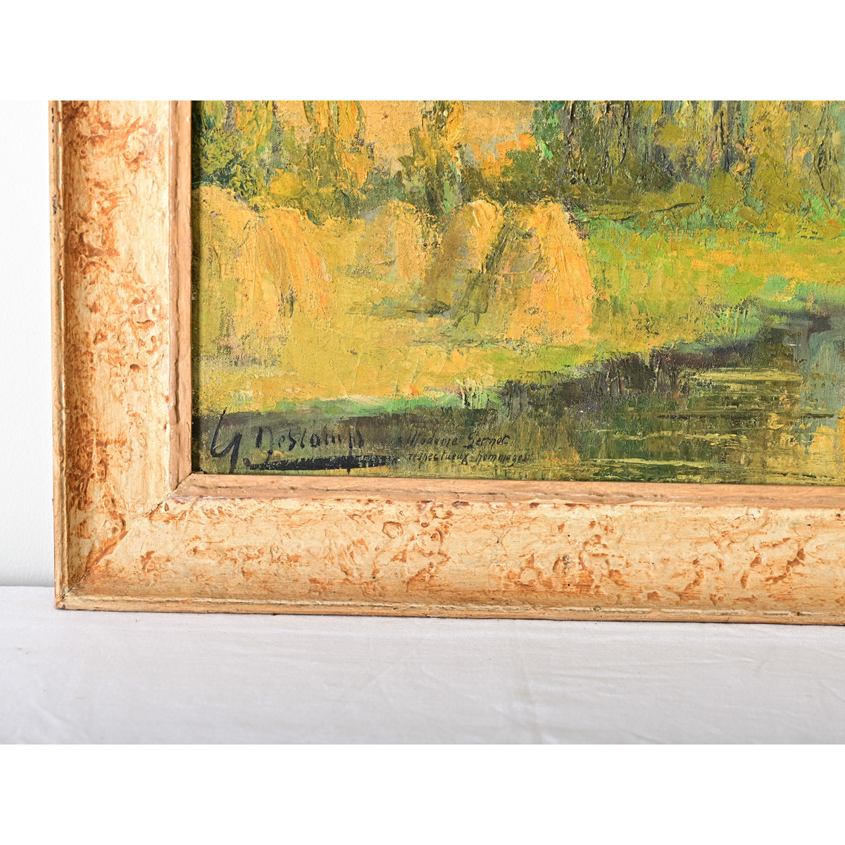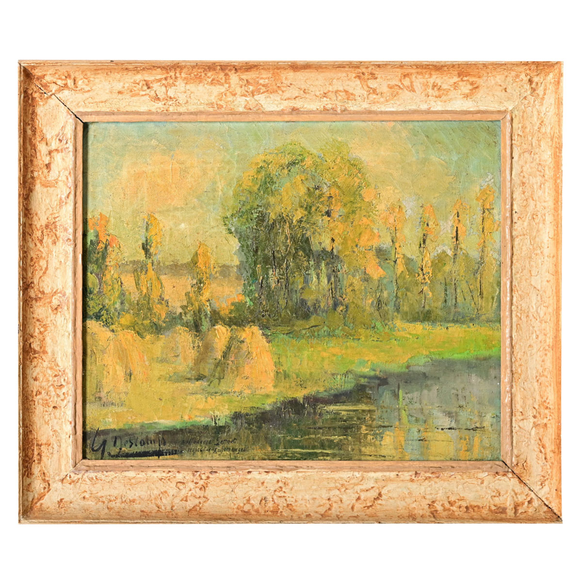 French, early-to-mid 20th century abstracted oil on canvas landscape by Henri Descamps (1898-1990). The hazy technique emphasizes the bright color palette and impasto texture of the trees along a riverbank, mounds of hay on the embankment to the lower right of the image might suggest a time period of late summer when the long rays of the sun cast a golden glow in the waning hours of the late afternoon. Signed by the artist in the bottom right corner, and dedicated to Madame Gernon, “respectueux hommage” (in tribute). Set within a simple wood frame of mottled ivory color and textured patina. Please view the detailed images to see the current condition.