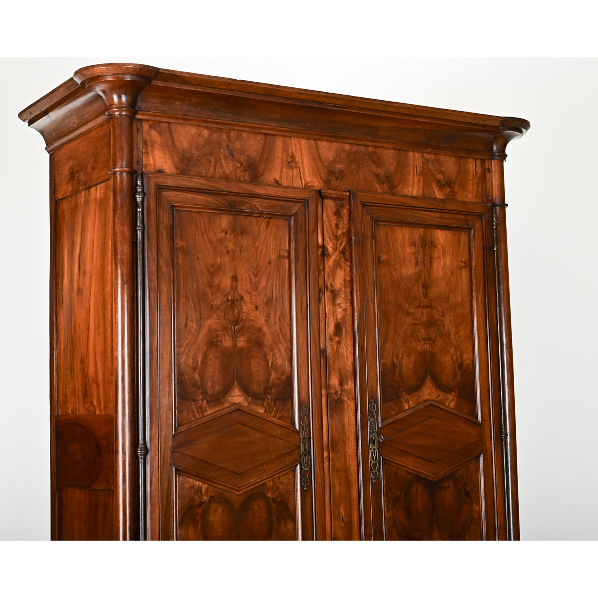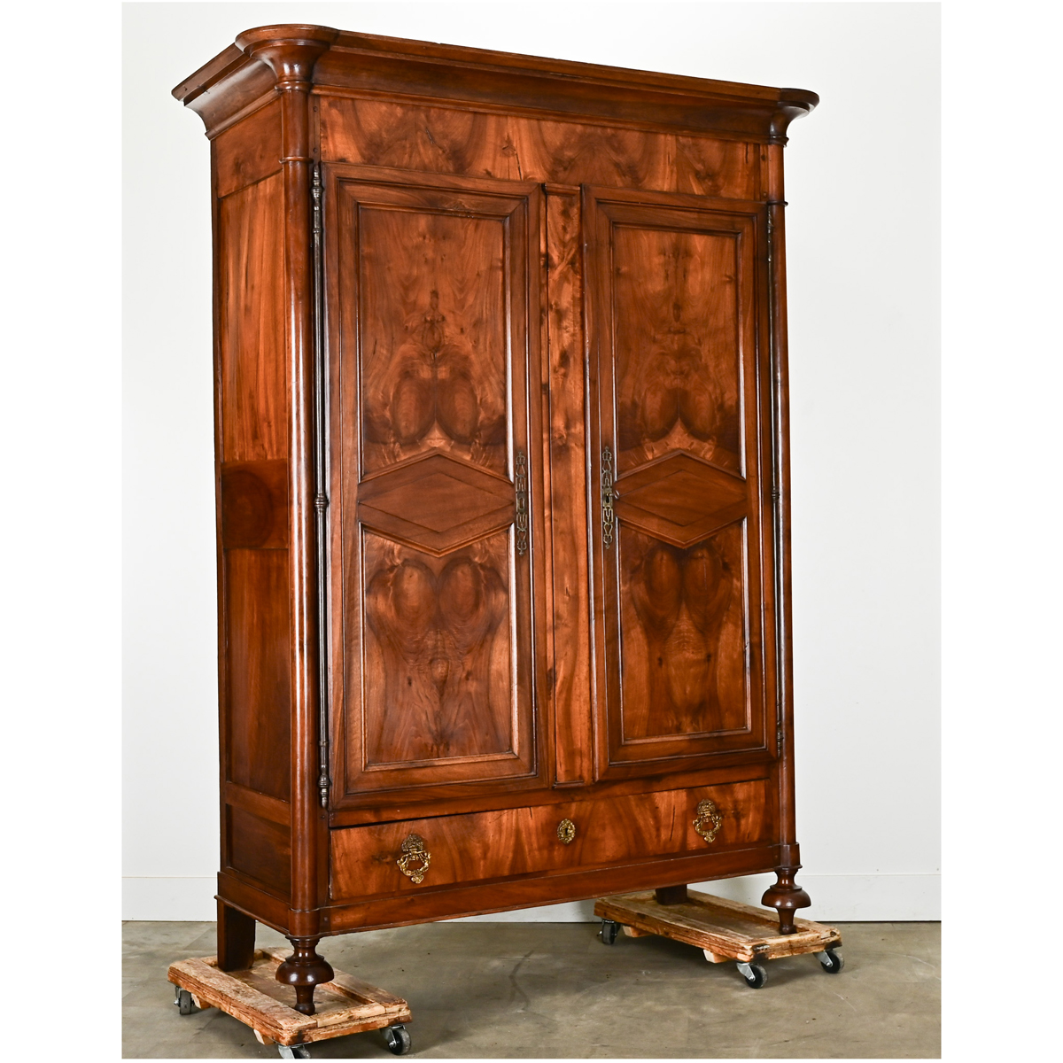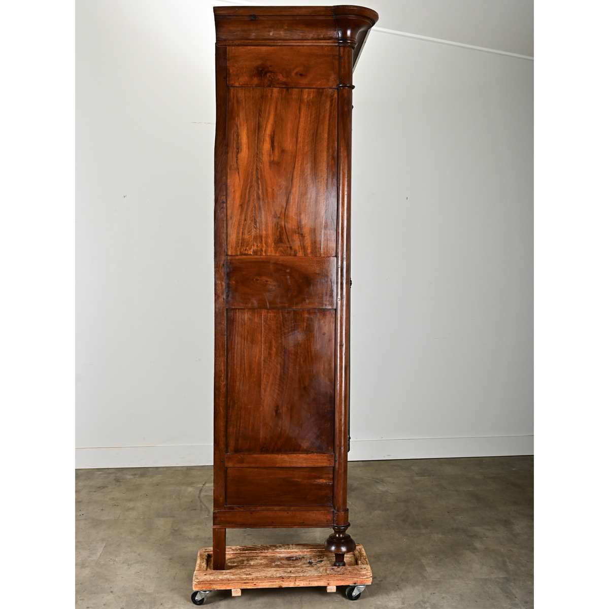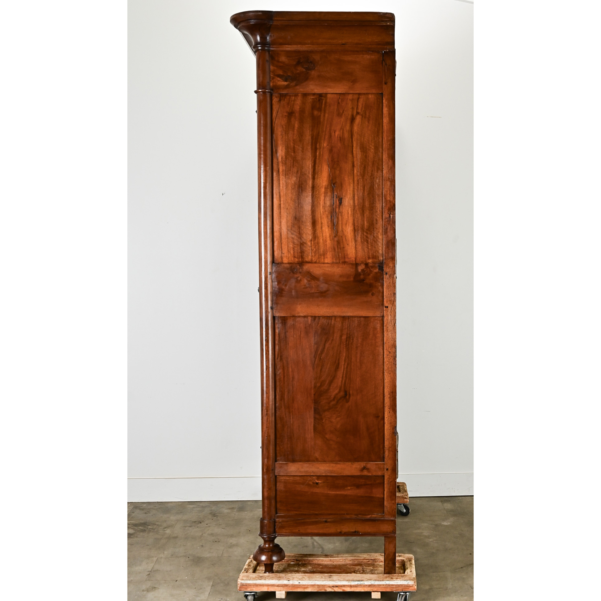 A stunning French walnut armoire from the 19th century, designed in the Louis Philippe style with timeless features that suit many decorating tastes and storage needs for the modern interior. The rounded cornice softens the impressive scale and height of the case, above a frieze using a line of bookmatched, quarter-sawn planks. Two, paneled doors divided into three sections are given further definition by fluted carvings down the center. The doors open on long, brass barrel hinges matching the pierced brass escutcheons (over the working lock and key). Inside are three large removable shelves, the upper being 17” deep and the bottom two are 16”deep. In the base is one long drawer using Louis XVI-style ring pulls of romantic floral motifs. Rounded bun feet lift the case from the floor. Cleaned and polished with a French paste wax this antique armoire is ready for your interior. Please view the detailed images to see more.