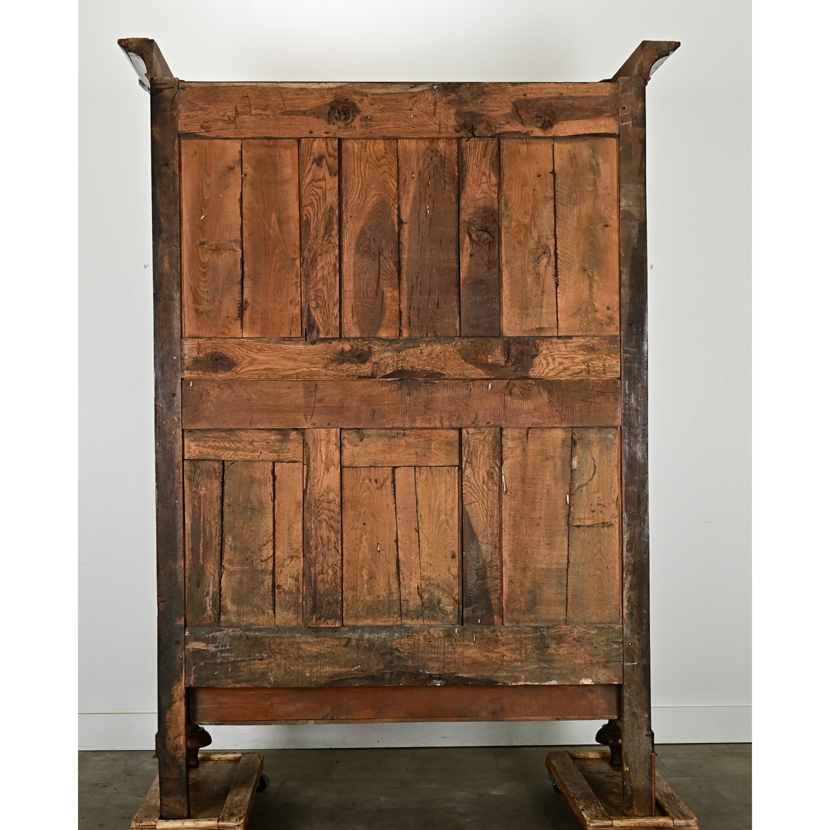 This French Provincial armoire from the 18th century is absolutely breathtaking in every detail. Stylistically the armoire reflects Louis XV taste, with a number of unexpected features that transcend time and place to still capture hearts and imaginations in the modern interior (that is, with the scale to accommodate such a monumental work). A classic bonnet-top cornice arches gently around the crown of the case over towering, paneled doors opening smoothly on steel barrel hinges. Tracing the curvaceous panels of the doors (and implied pilaster between them) is the most exquisite, pinstripe inlay of alternating dark & light wood tones with intermittent “checked” squares like a gameboard for a geometric counterpoint to the sinuous lines. One, very large key operates the locking right door and acts as a pull. The left door hooks from the inside to keep it in place when closed, fitted with an intricate iron crank to operate the vertical latch piercing the upper and lower part of the frame. Inside are three proportionate shelves, 61” W x 19 ½” D, for ample storage of clothing or linens. The center of the serpentine apron is marked with a “Kolovrat” icon, the ancient symbol like a spinning wheel that signifies movement, growth, the sun, and life cycle to bring luck and protection. Scrolling motifs morph into escargot-style feet that raise the piece from the floor. Note there is some loss to the apron just behind the front-left foot, please view the detailed images to appreciate all the special features of this remarkable antique armoire. Cleaned and polished with a French paste wax, ready for your interior.